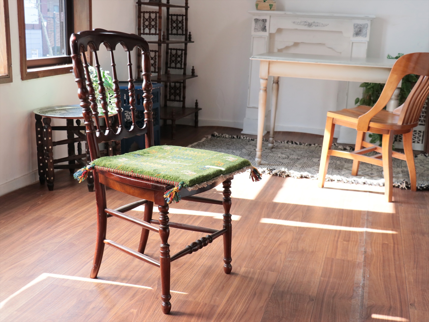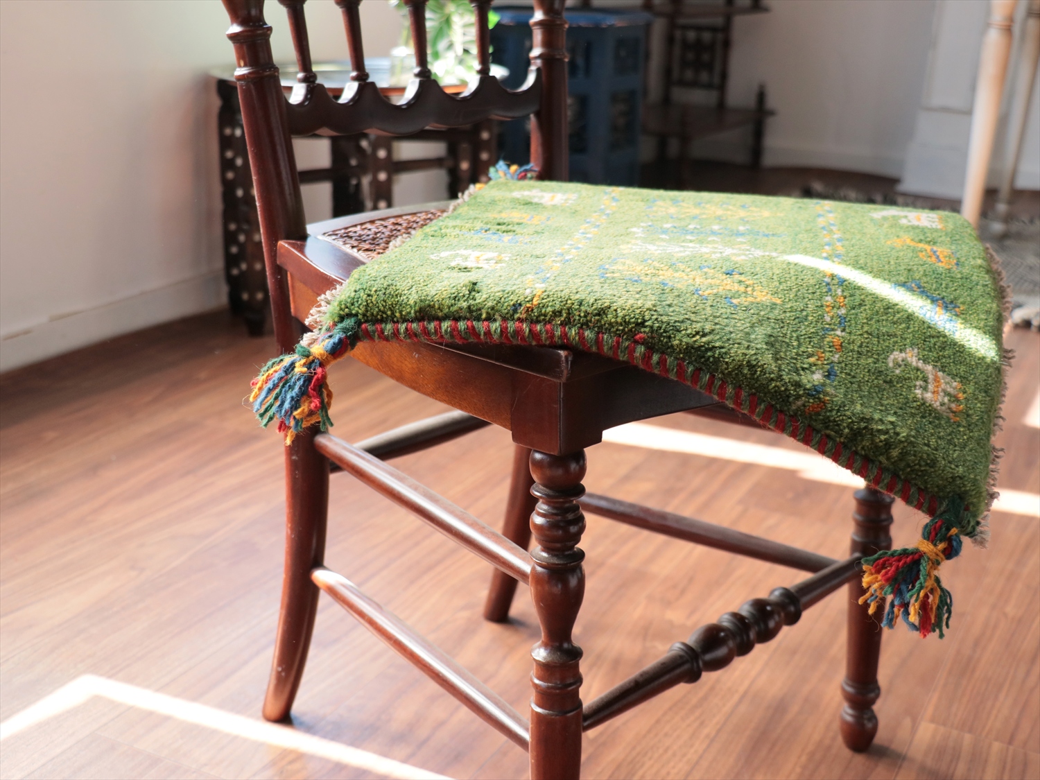 Key:イラン直輸入, GABBEH, ギャッベ, ギャベ, グリーン, 緑, 手織り, 手紡ぎ, ウール, 天然素材, ポンポン, 座布団, バザールギャッベ, ハンドメイド, 一点もの, 現品販売,ガラタバザール, 東京中野区