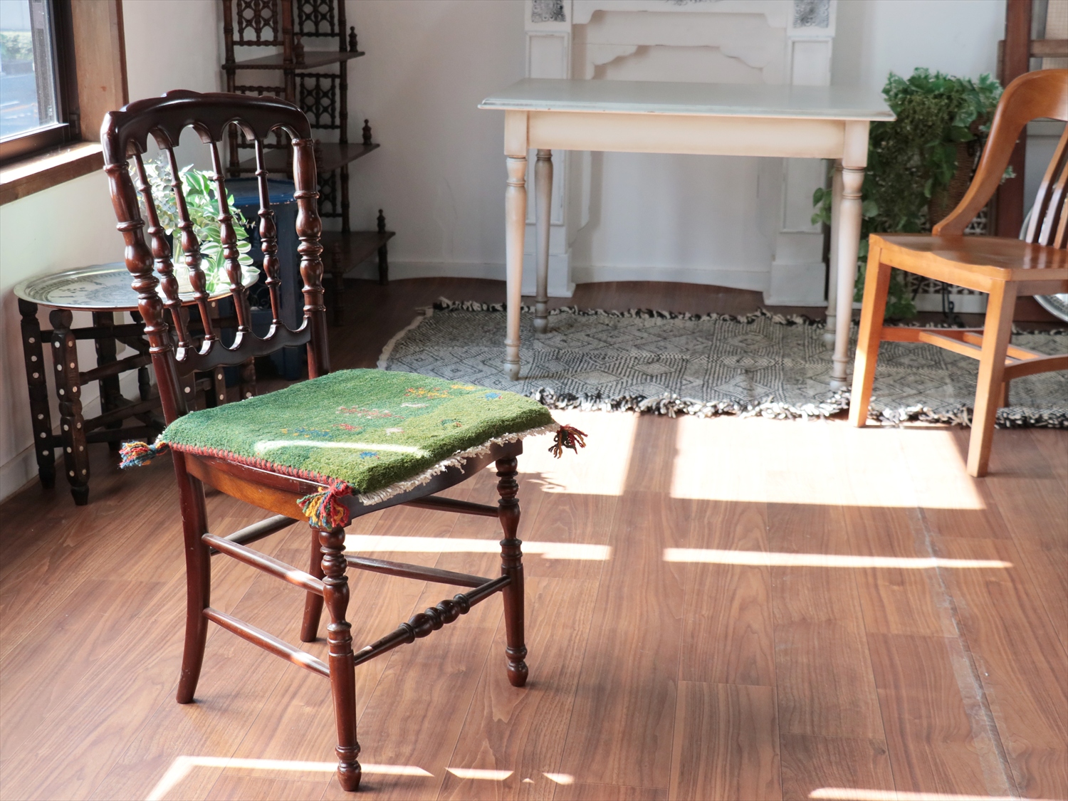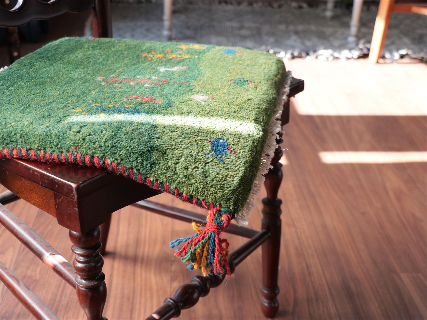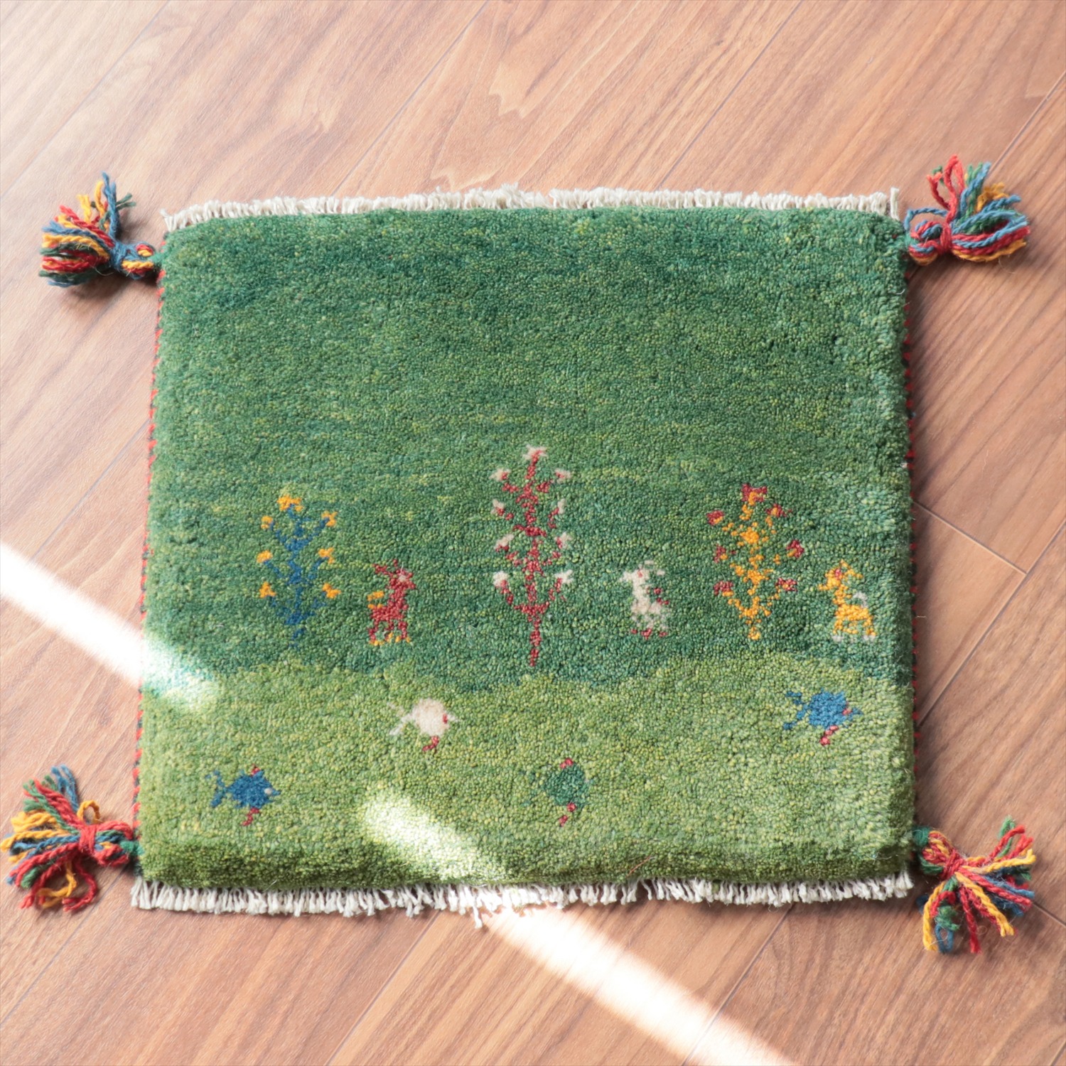 Key:イラン直輸入, GABBEH, ギャッベ, ギャベ, グリーン, 緑, 手織り, 手紡ぎ, ウール, 天然素材, ポンポン, 座布団, バザールギャッベ, ハンドメイド, 一点もの, 現品販売,ガラタバザール, 東京中野区