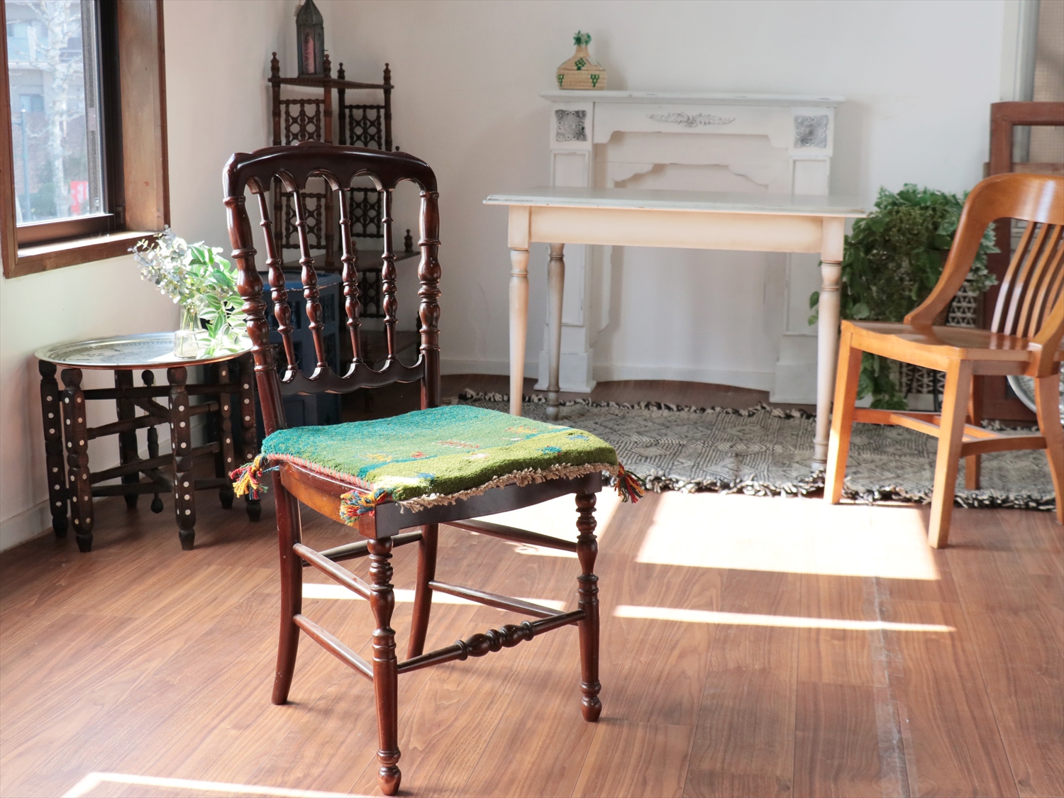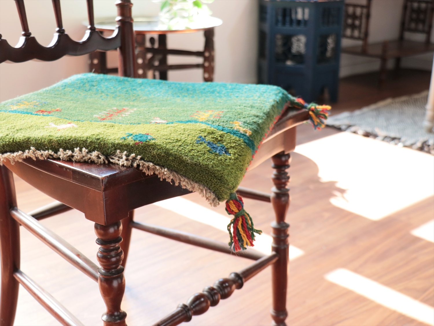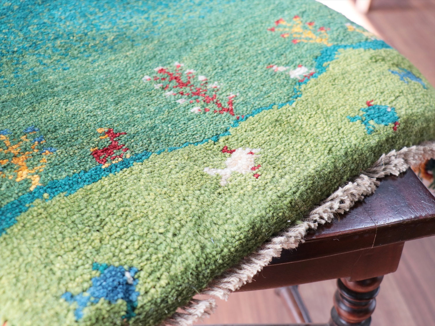 Key:イラン直輸入, GABBEH, ギャッベ, ギャベ, グリーン, 緑, 手織り, 手紡ぎ, ウール, 天然素材, ポンポン, 座布団, バザールギャッベ, ハンドメイド, 一点もの, 現品販売,ガラタバザール, 東京中野区