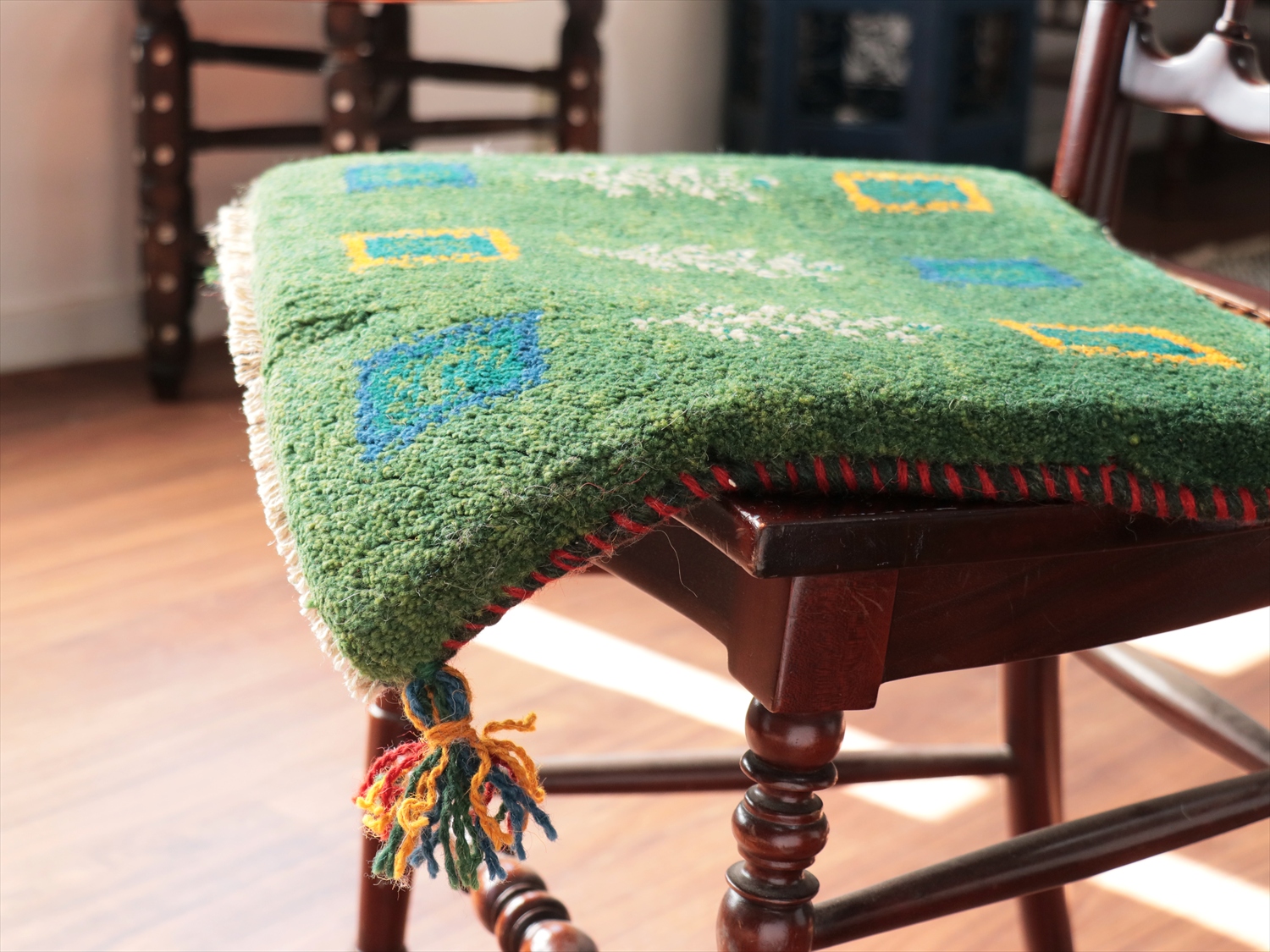 Key:イラン直輸入, GABBEH, ギャッベ, ギャベ, グリーン, 緑, 手織り, 手紡ぎ, ウール, 天然素材, ポンポン, 座布団, バザールギャッベ, ハンドメイド, 一点もの, 現品販売,ガラタバザール, 東京中野区