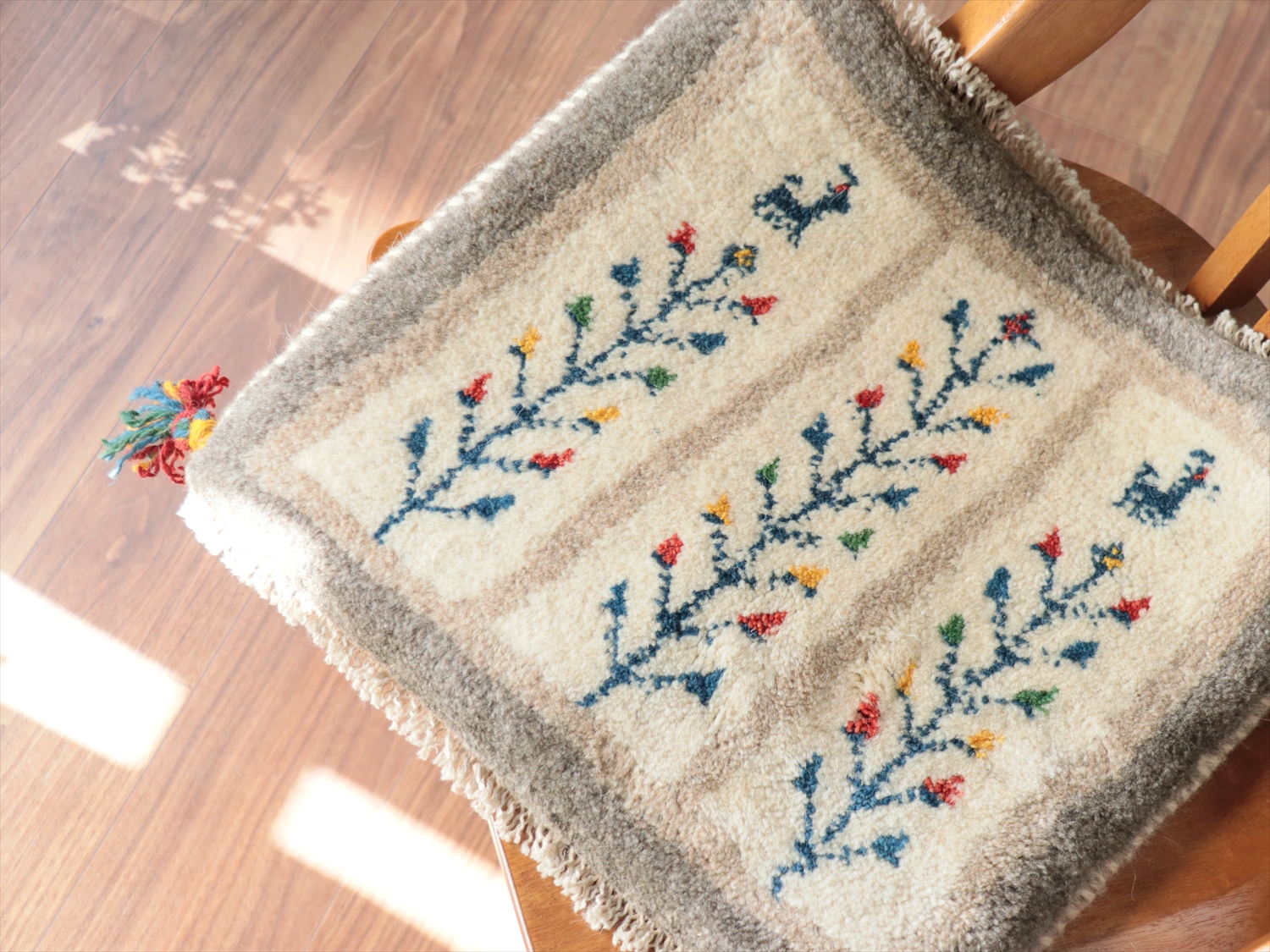 - ギャッベ イラン産手織り 座布団サイズ 39x42cm ナチュラルアイボリー グレー 花をつけた生命の木