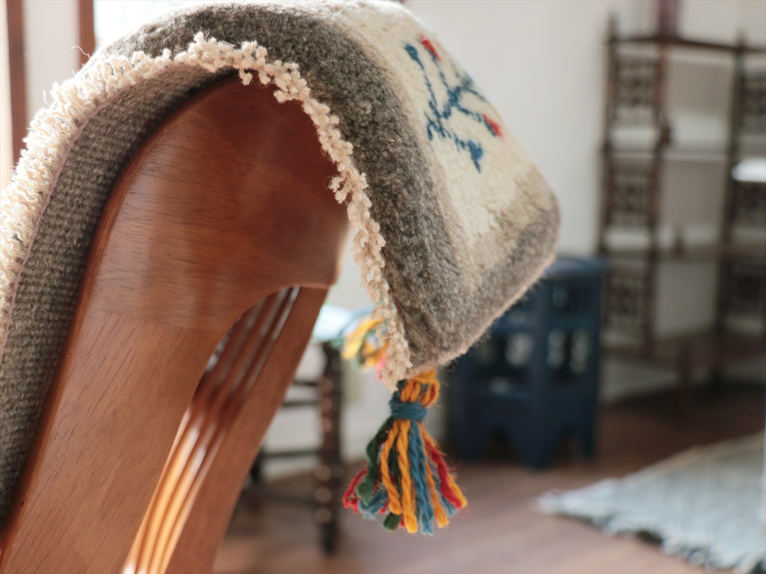 何枚も集めたくなる、40cm角の座布団サイズギャベ。四隅に大きなポンポンのついた、伝統的なスタイルで織られています。フローリングに並べて座布団がわりに使ったり、ベンチやダイニングチェアの座面など、使い方はいろいろ。壁にタペストリーのように飾るのもおすすめです。