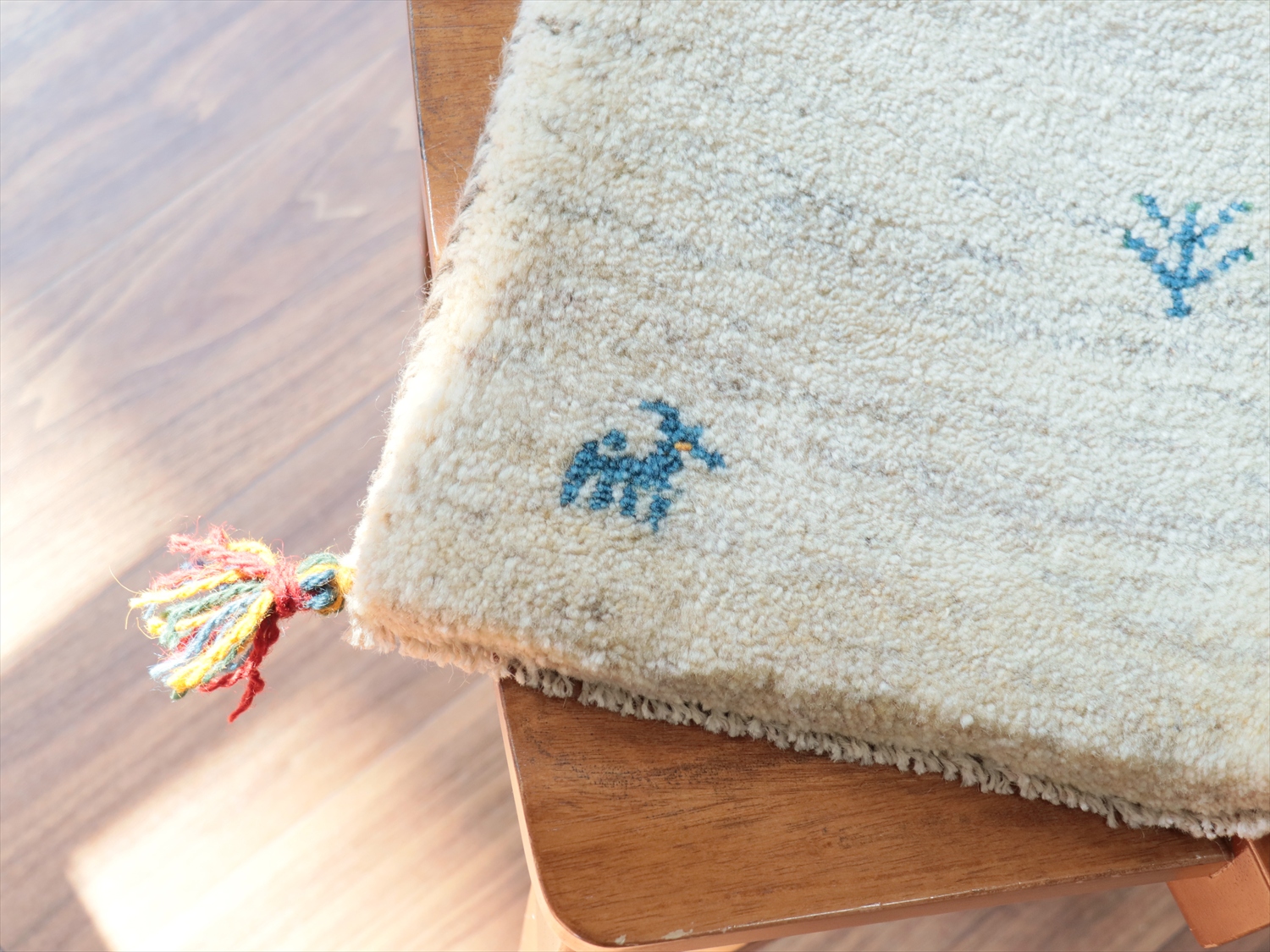 天然の羊毛の色をそのまま使ったギャベ。温かみのあるアイボリー(明るいクリーム色)です。シンプルなデザインながら、動物モチーフの配置や色は一枚一枚違っていて、まったく同じものはなく、手織りならではの一点ものです。