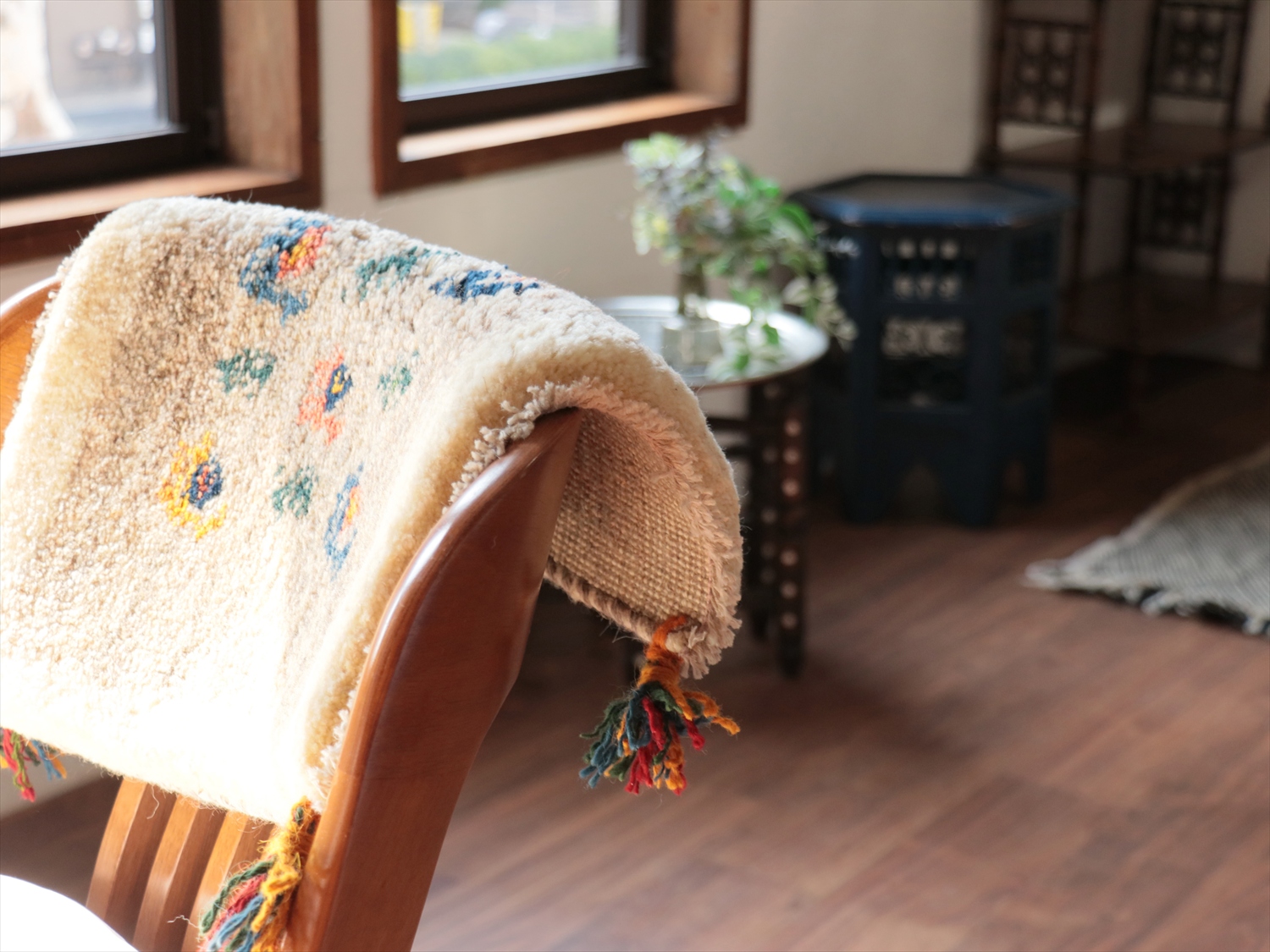 【手織りギャッベ】イラン南部に暮らす遊牧民カシュカイ族の織る毛足の長い絨毯。たくさんの時間をかけて、縦糸にひとつひとつ毛足を結びつけて織り上げていきます。ウールを紡ぐところから、全体を洗う作業、毛足の刈り込みや端の処理まで、全て手作業で行われています。