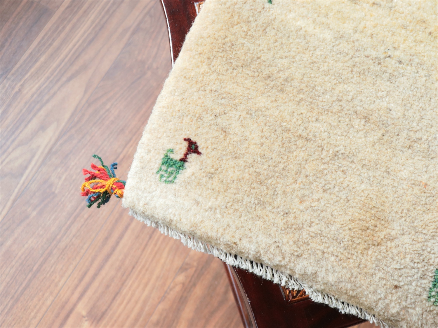天然の羊毛の色をそのまま使ったギャベ。温かみのあるアイボリー(明るいクリーム色)です。シンプルなデザインながら、動物モチーフの配置や色は一枚一枚違っていて、まったく同じものはなく、手織りならではの一点ものです。