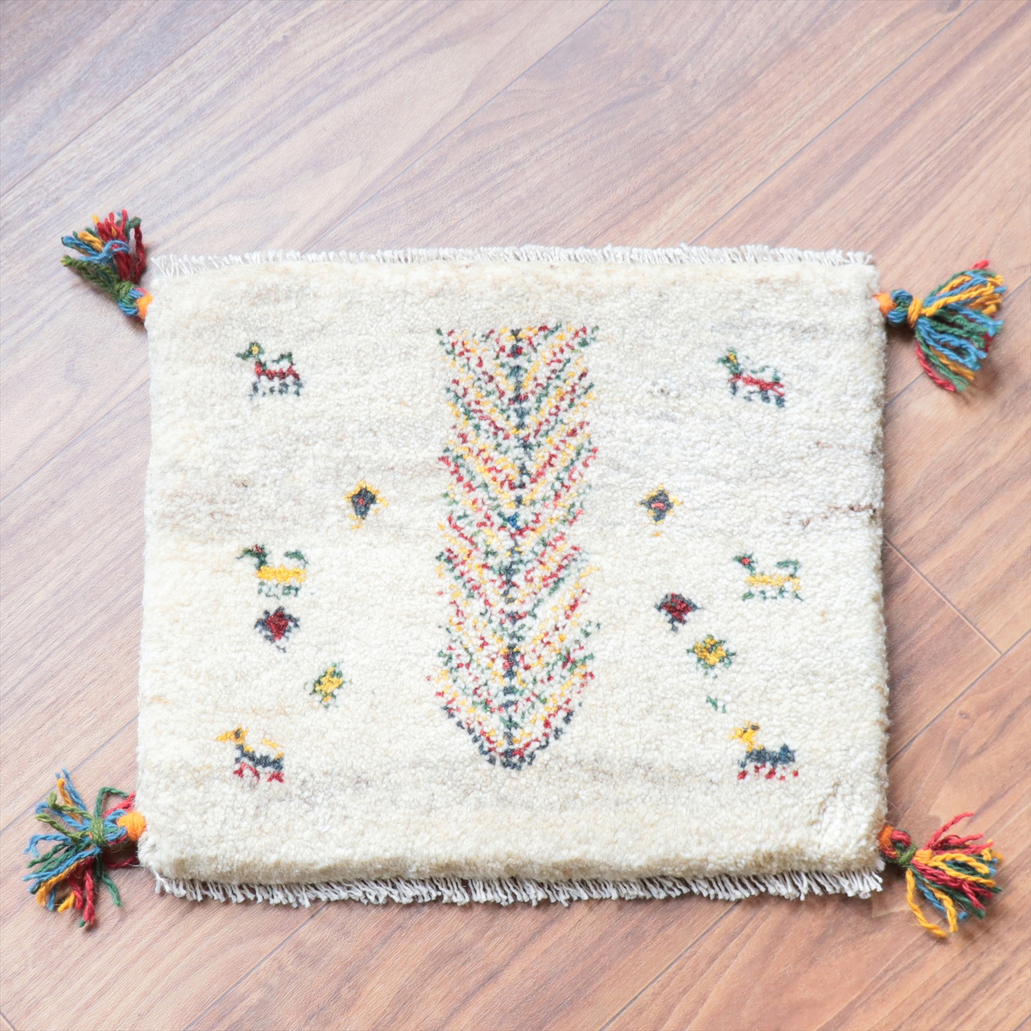 ギャッベ イラン産手織り 座布団サイズ 37x43cm ナチュラルアイボリー生命の木と動物たち