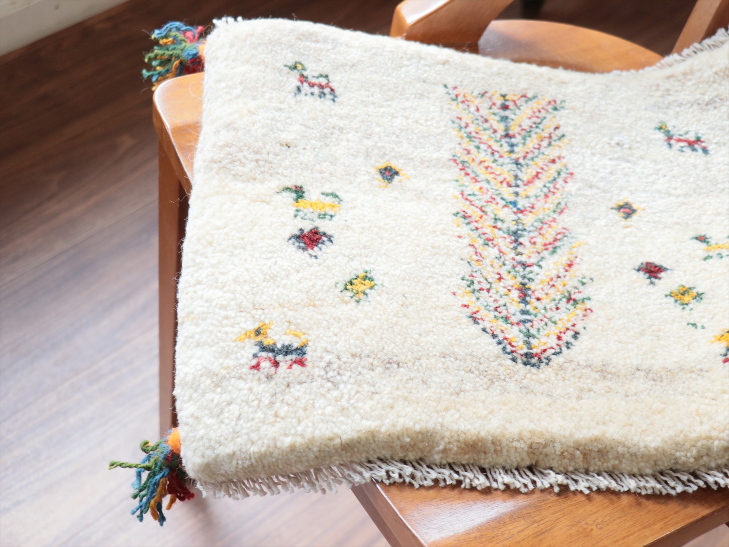- ギャッベ イラン産手織り 座布団サイズ 37x43cm ナチュラルアイボリー生命の木と動物たち