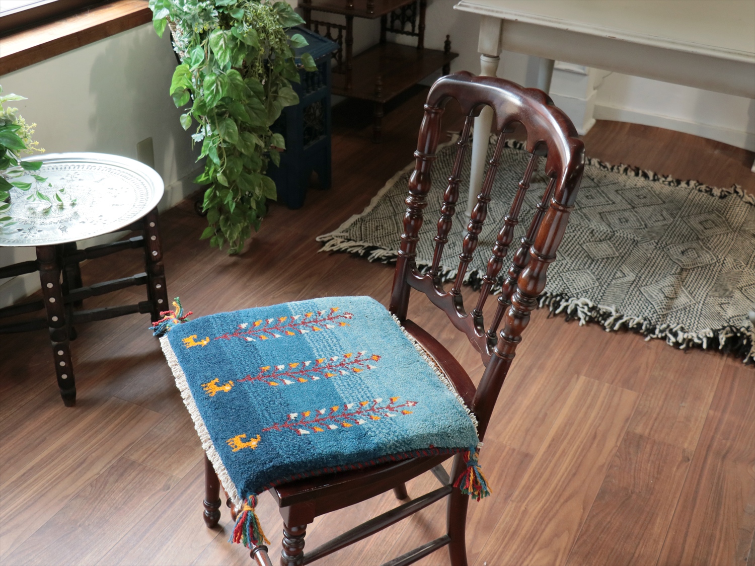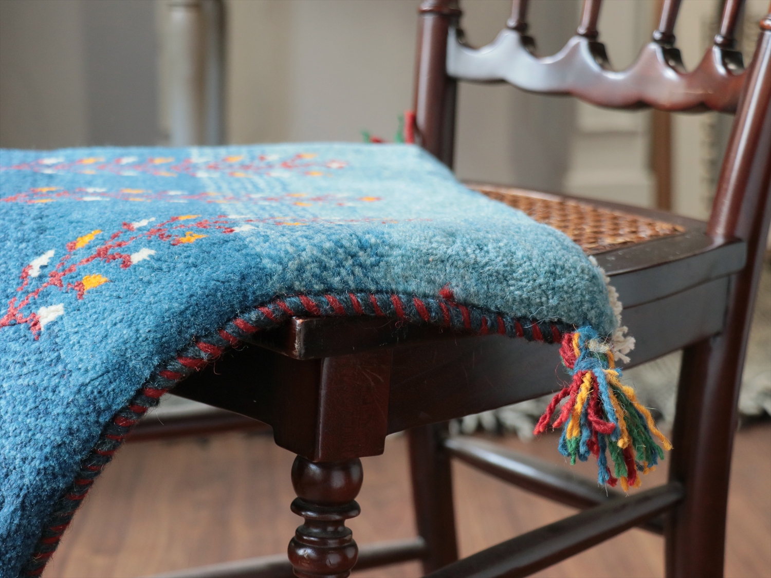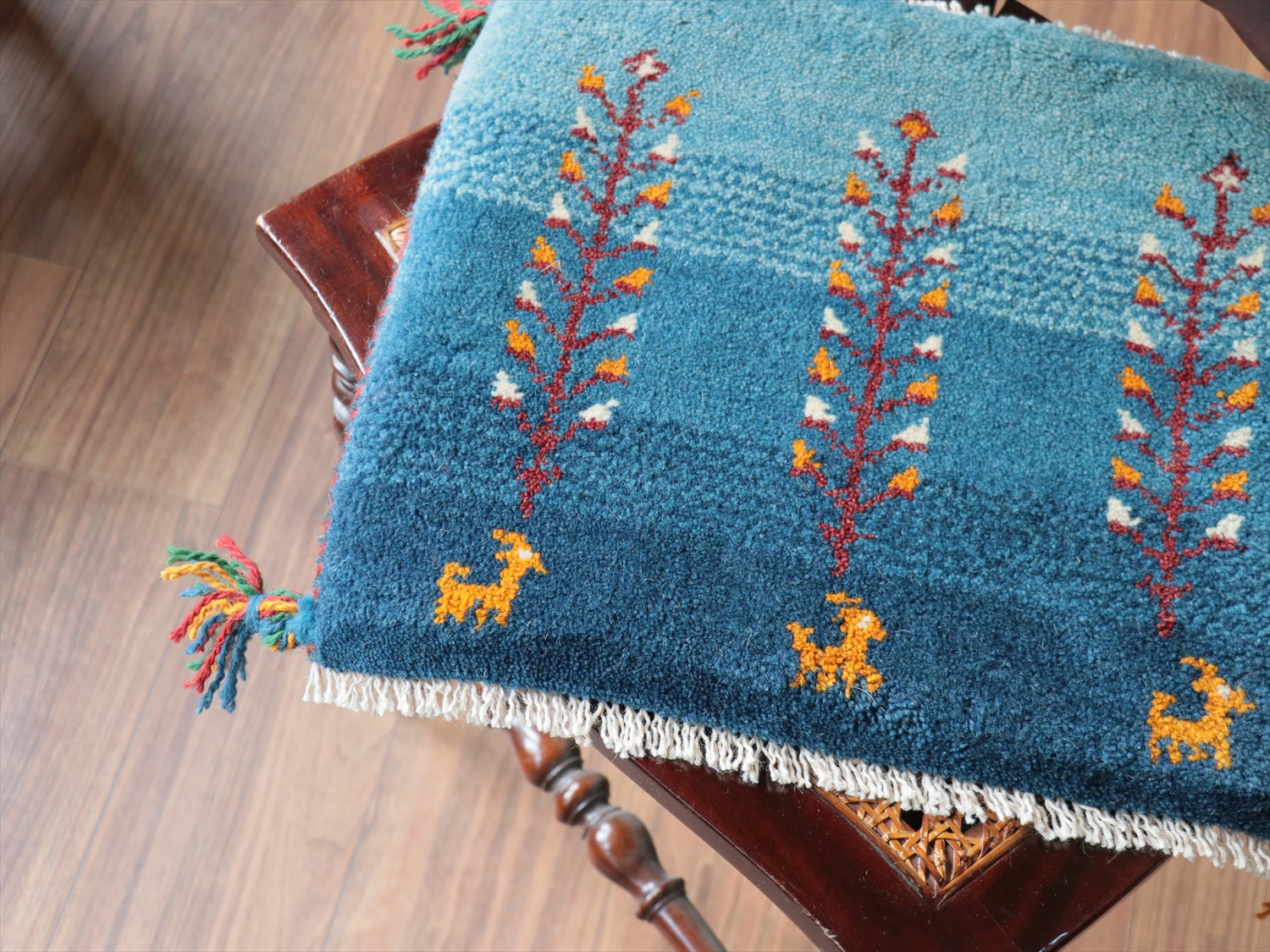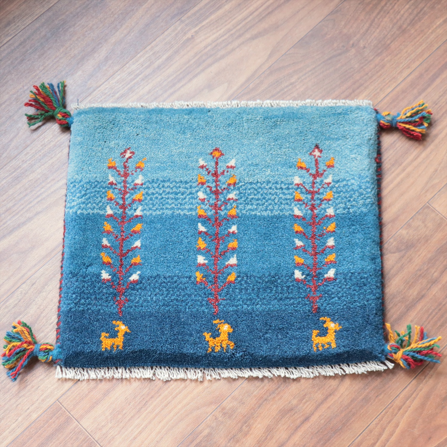 ギャッベ イラン産手織り 座布団サイズ 38x44cm ブルーグラデーション 花をつけた草花