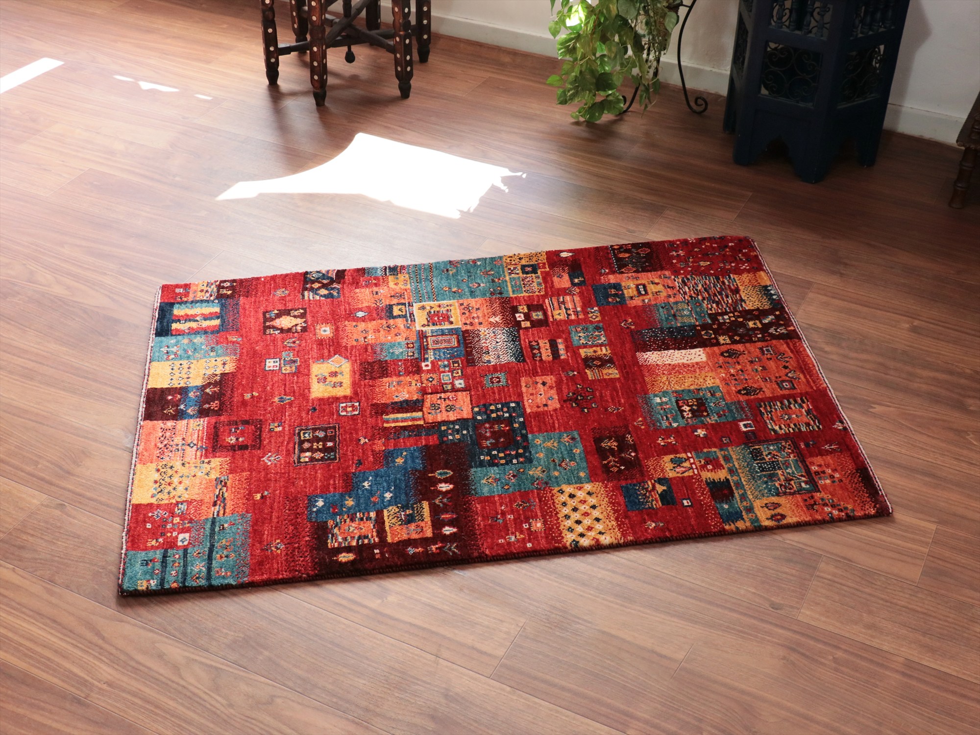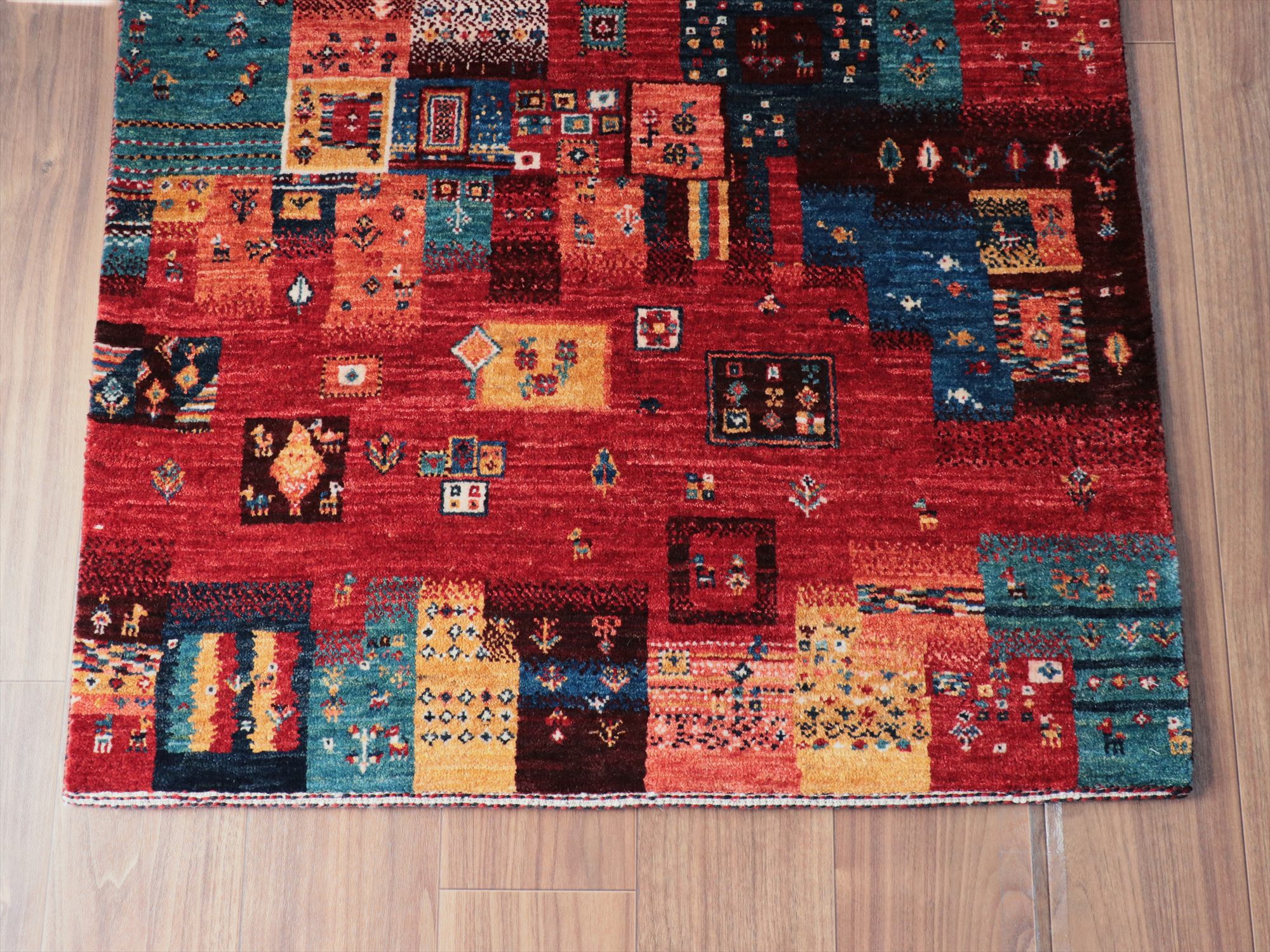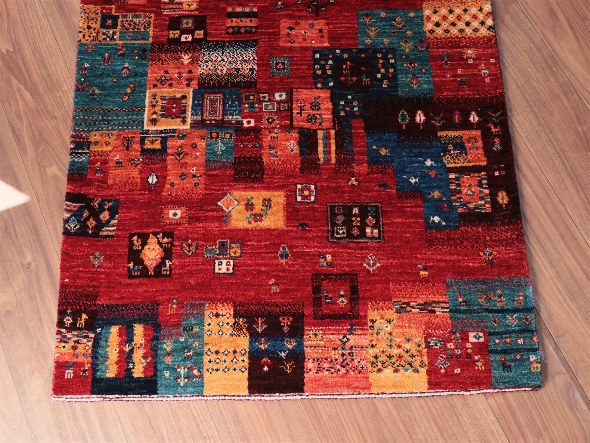Key:Gabbeh,Nowbaft,Tribal rug, Persian carpet,Iran,Shiraz, Quashkai,Farhadian, 手織りギャッベ, 細かい, イラン直輸入, ペルシャ絨毯, 玄関マット, レッド系, 赤, カラフル, タイル柄, モザイク, 動物モチーフ, モダンデザイン, 草木染, ウール100%, ガラタバザール, 東京, 中野区