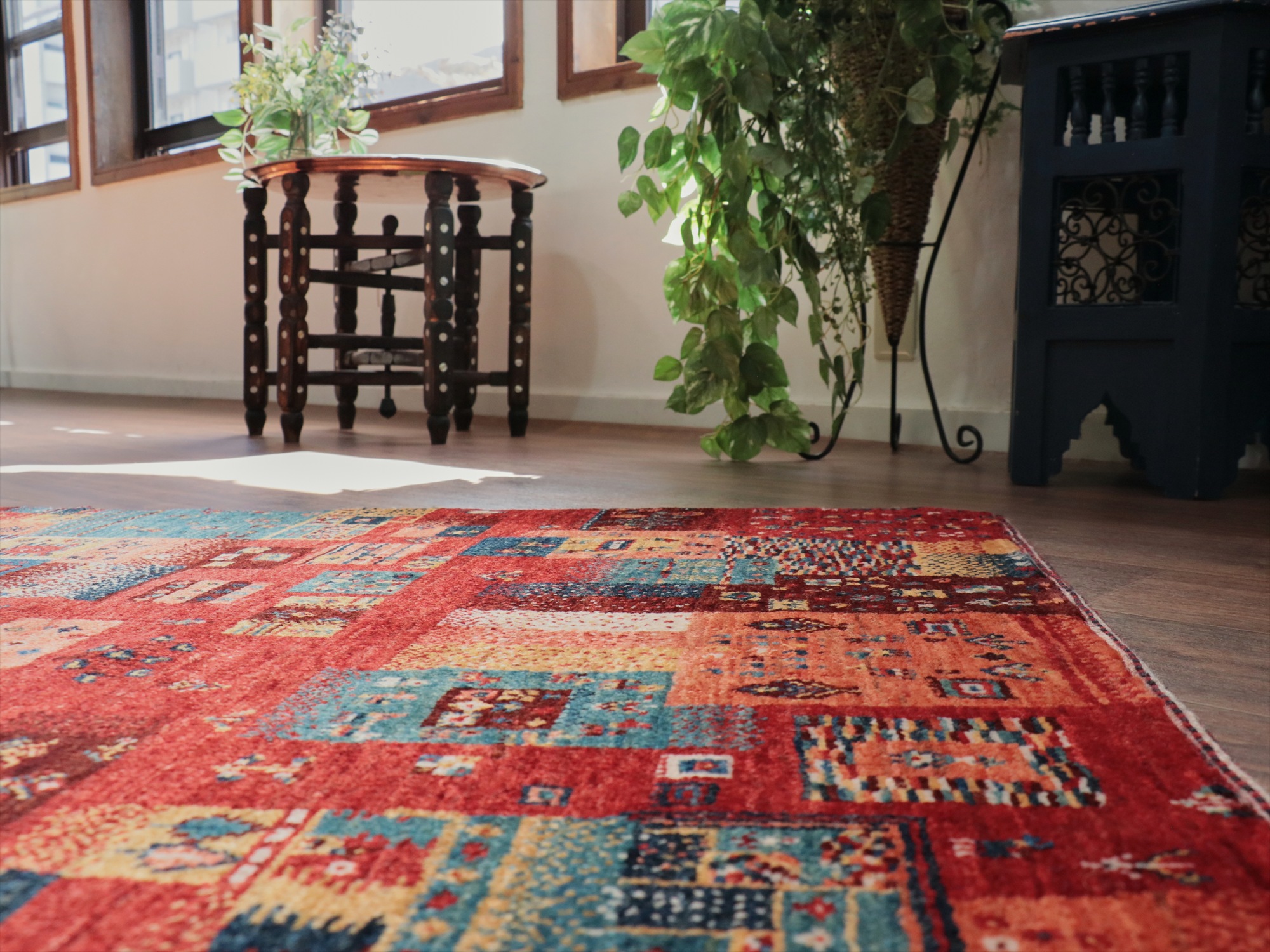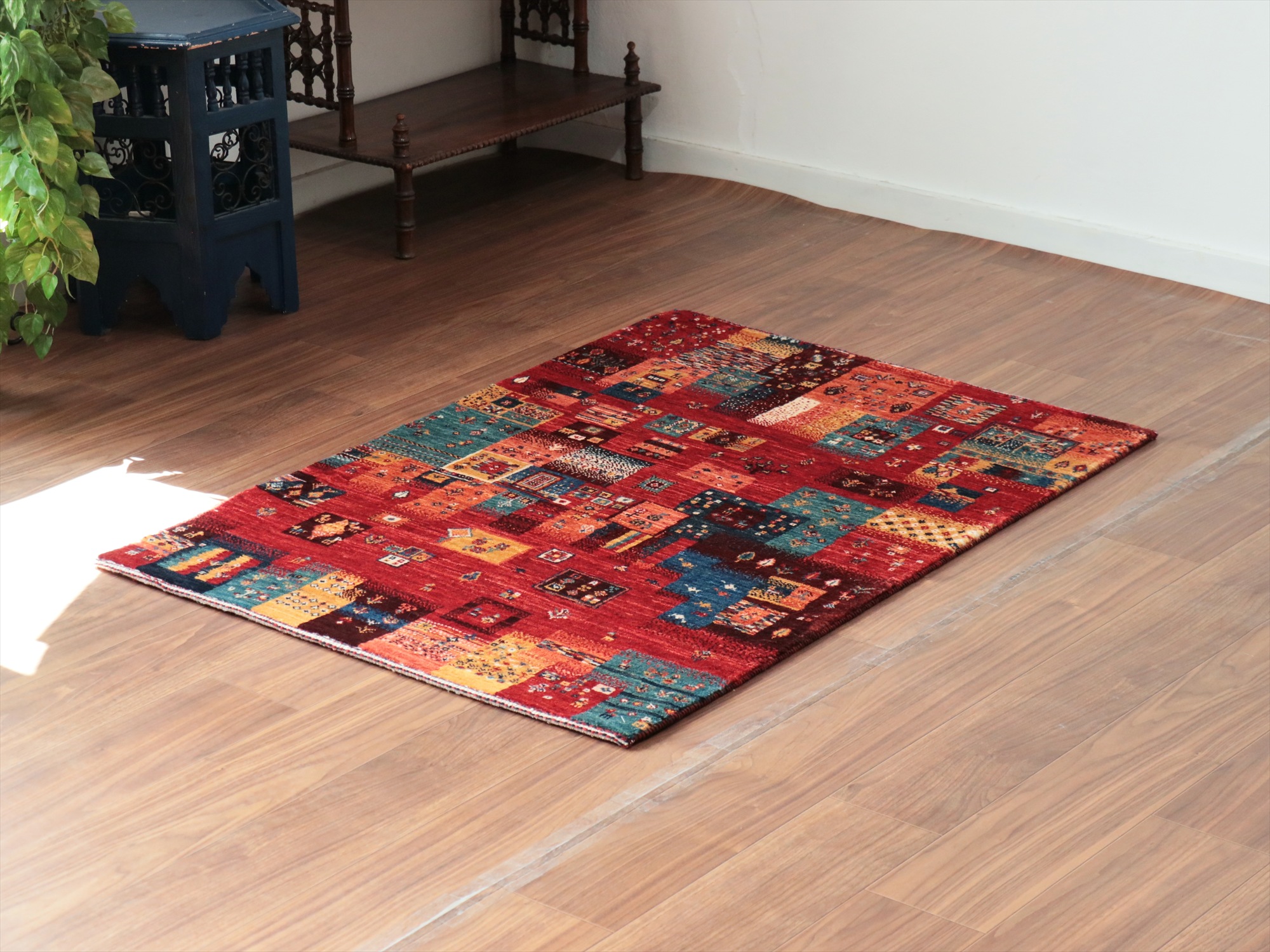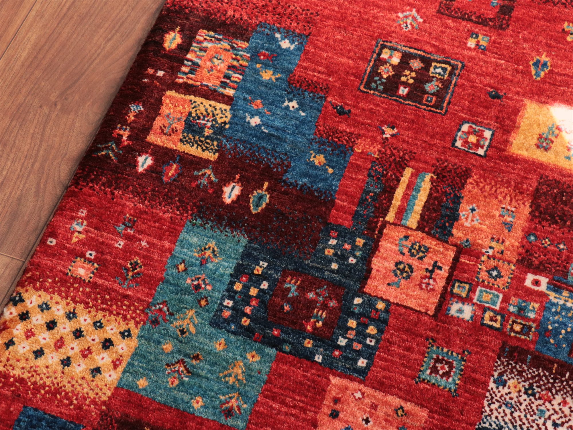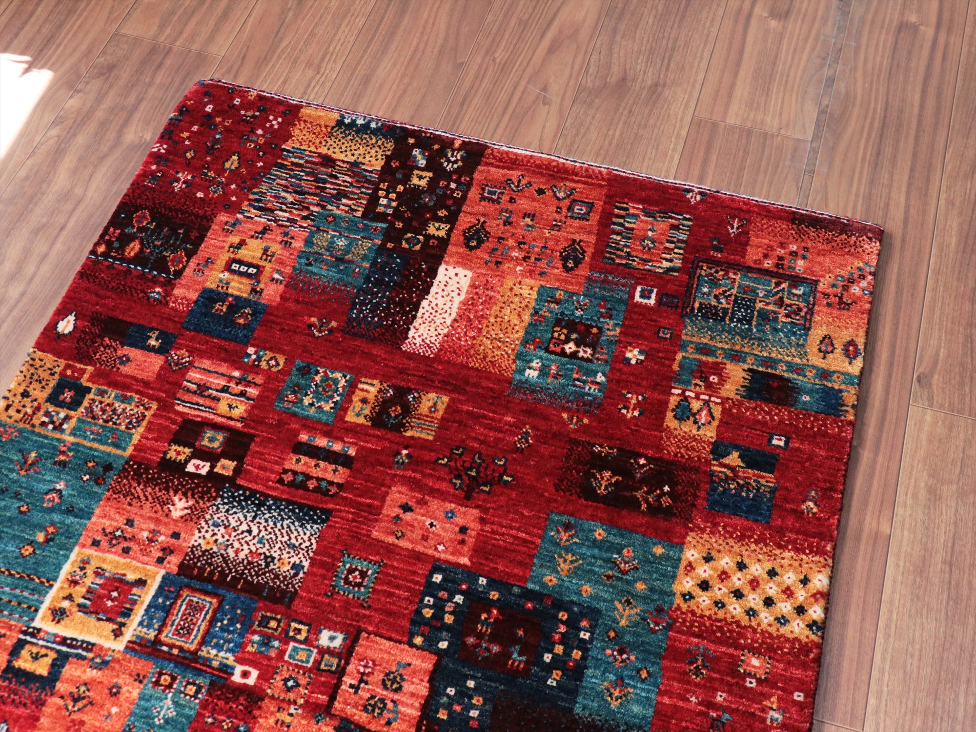 Key:Gabbeh,Nowbaft,Tribal rug, Persian carpet,Iran,Shiraz, Quashkai,Farhadian, 手織りギャッベ, 細かい, イラン直輸入, ペルシャ絨毯, 玄関マット, レッド系, 赤, カラフル, タイル柄, モザイク, 動物モチーフ, モダンデザイン, 草木染, ウール100%, ガラタバザール, 東京, 中野区