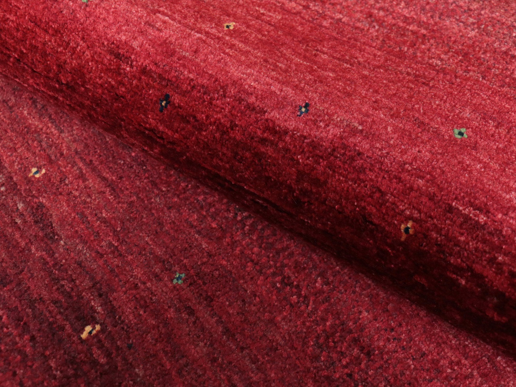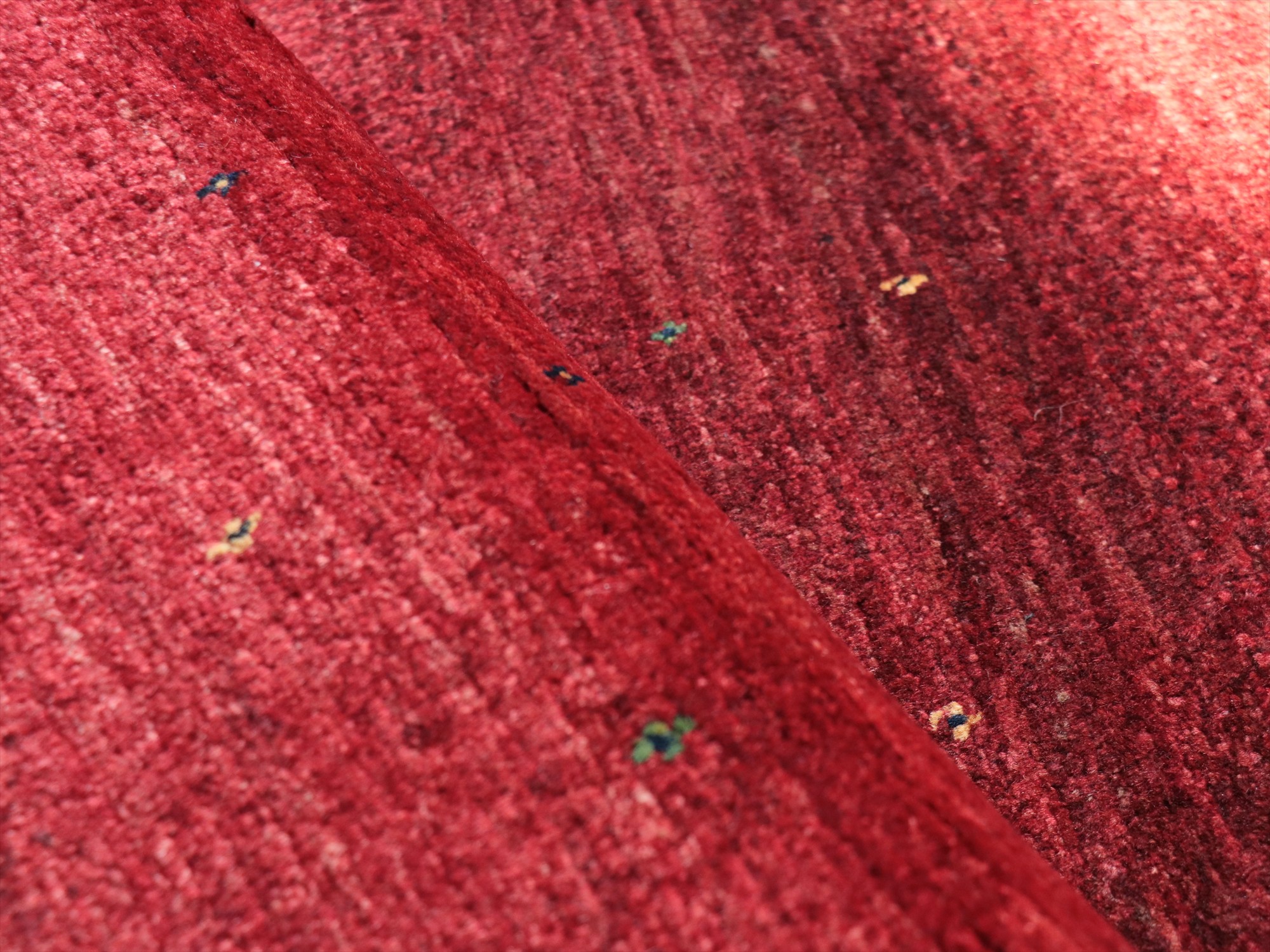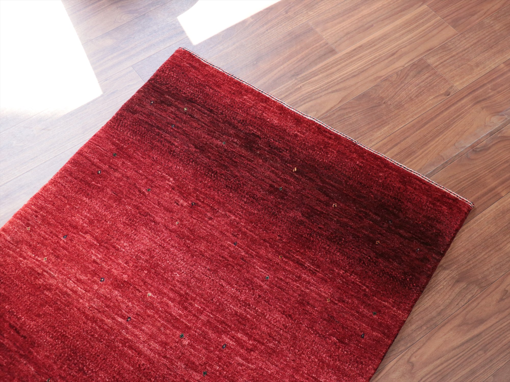 上品で深みのあるレッドのグラデーションが美しいギャッベ。モチーフがほとんどないシンプルなデザインで、シンプルに細かな手織りを楽しめる、モダンデザインです。