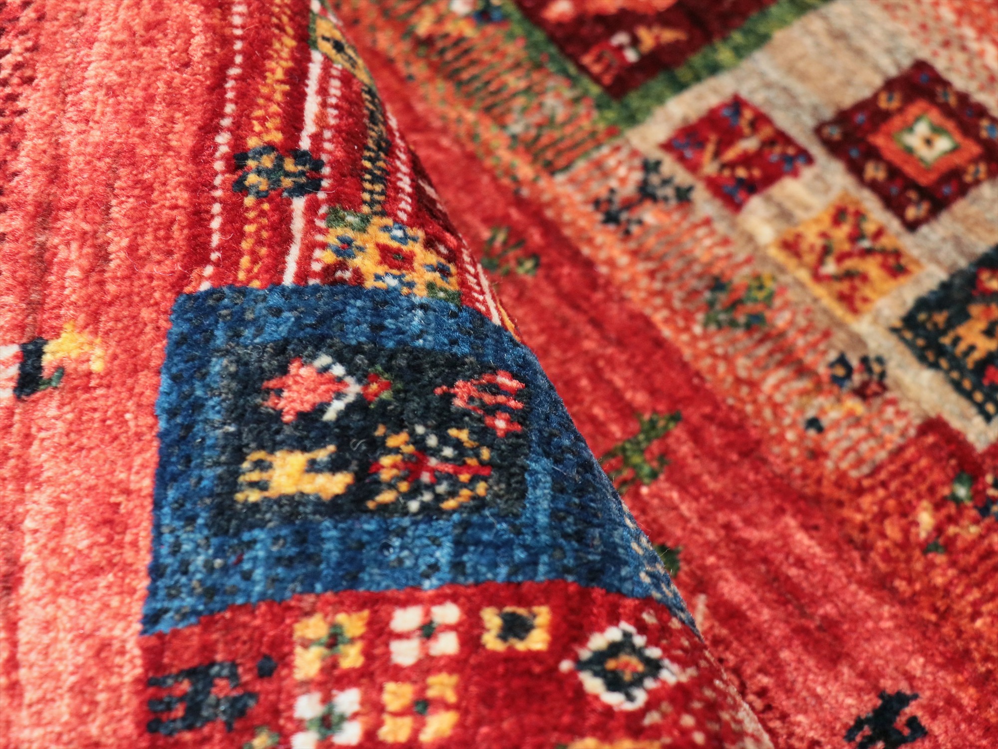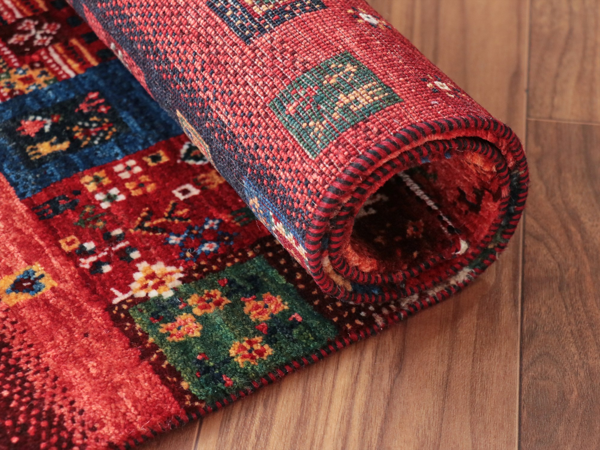 毛足は短く、手触りはやわらかく滑らかです。表面には光沢があります。パイルを含めたギャベの厚みは、1.2-1.3cm程度。