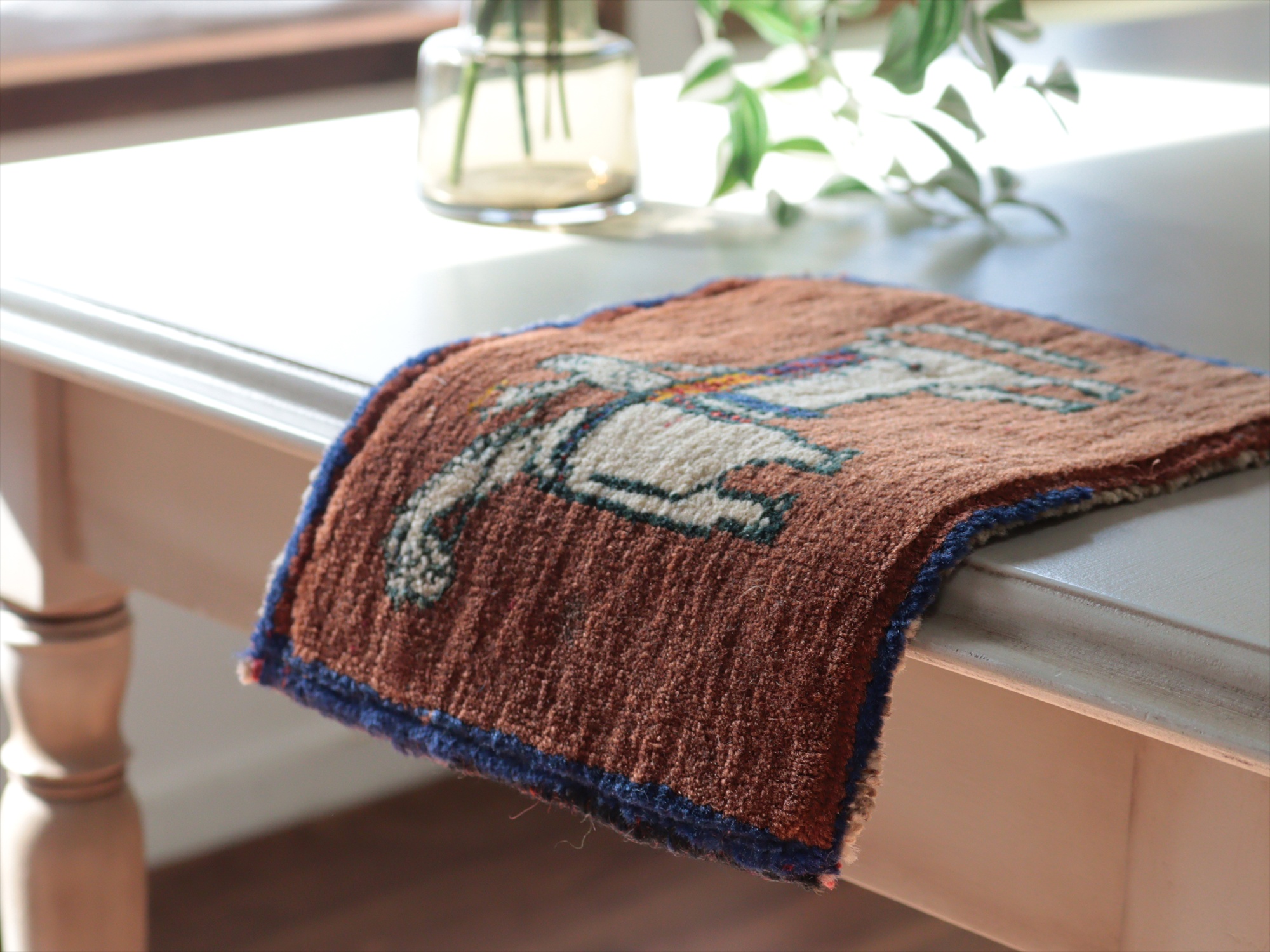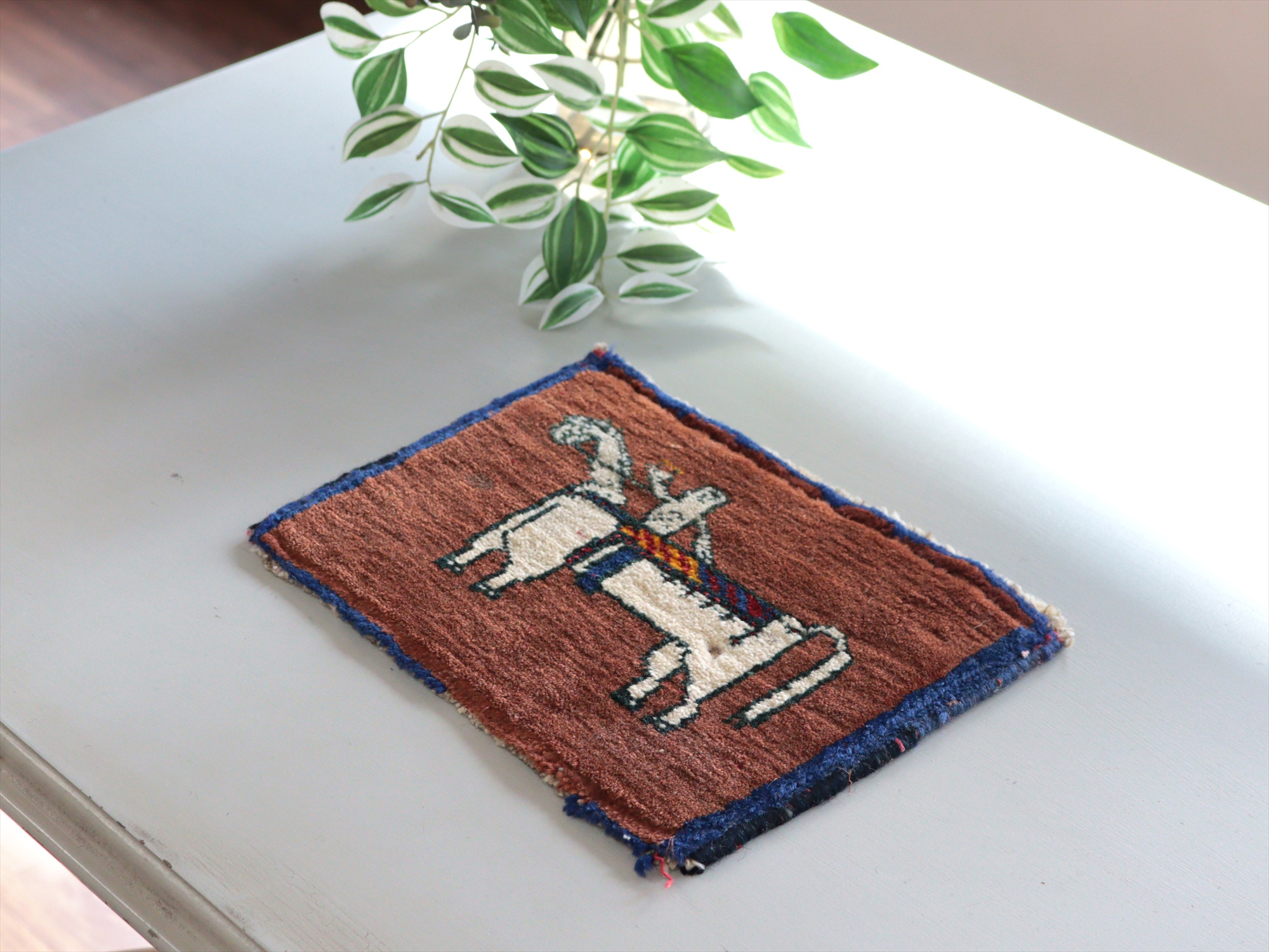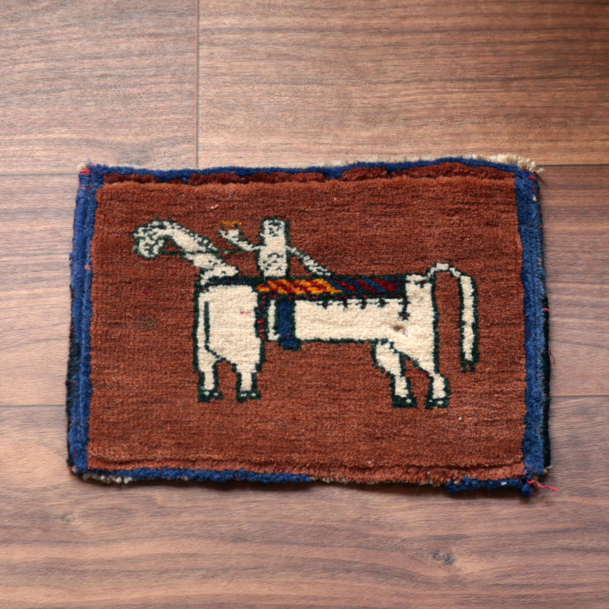 - ギャッベ カシュカイ族の手織りラグ 21x27cm 白馬にのる人/ブラウン・ミニカーペット 【OUTLET】