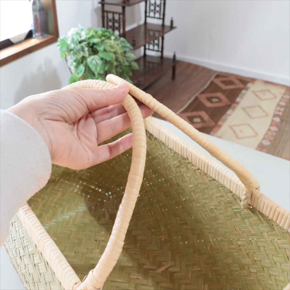 古い時代から日本の各地で生活道具として使われてきた、竹細工のかごです。45cmもある大きなサイズで、大容量!キャンプやピクニックにも、食材をたっぷり入れて大活躍です。底面には太い力竹(ちからだけ)が編み込まれていて、重さにも耐えられるしっかりとした作りです。