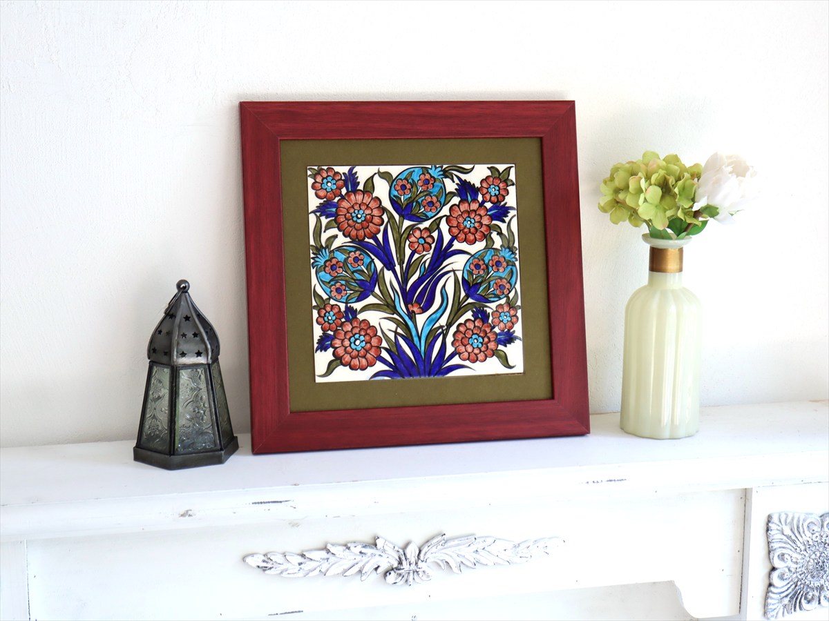 トルコ陶器 手書きタイル 1枚額 H31×W31×D2.5cm チューリップ&カーネーション Turkish Hand Paint Tile