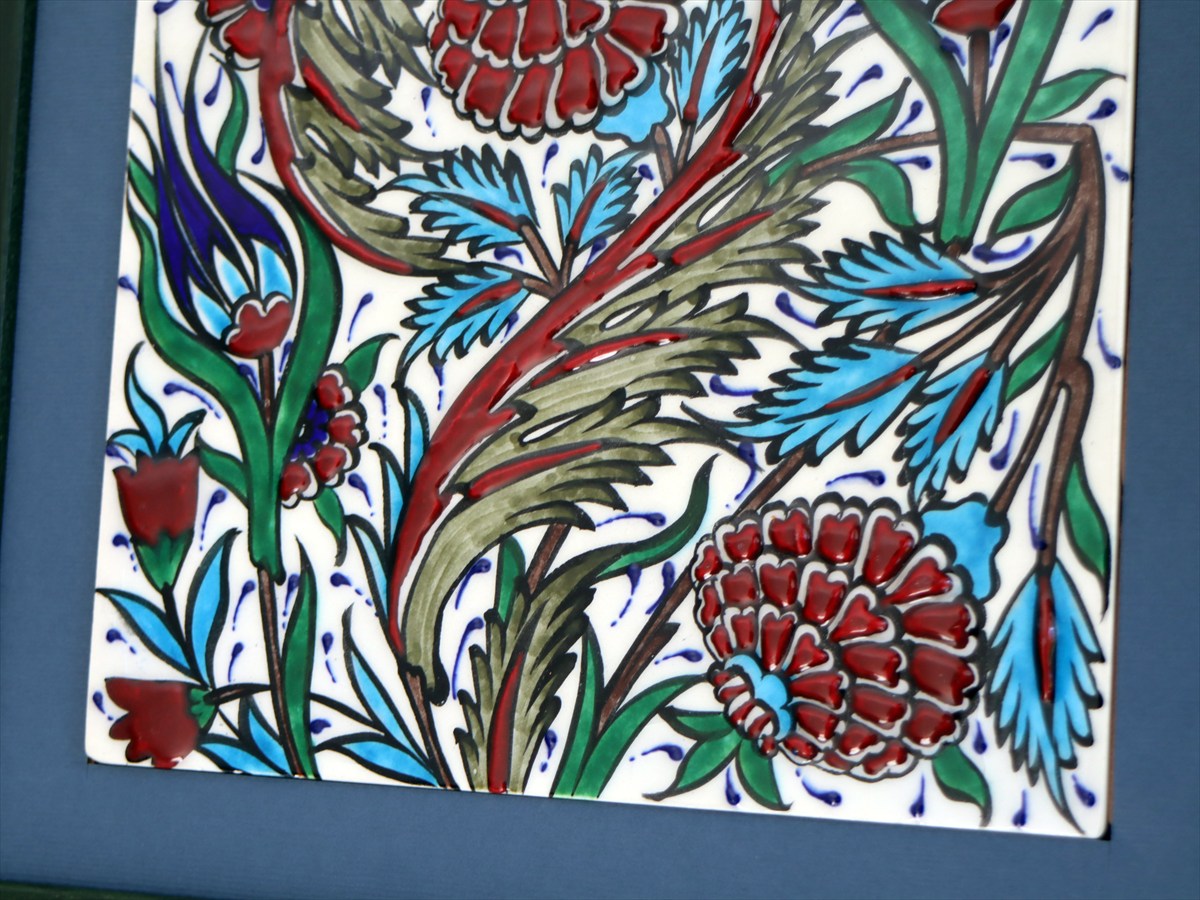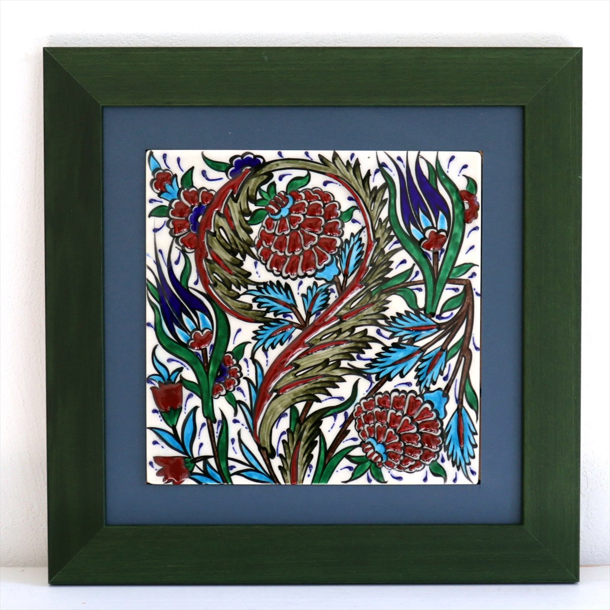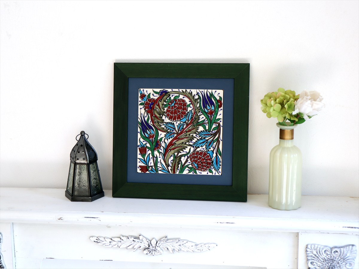 トルコ陶器 手書きタイル 1枚額 H31×W31×D2.5cm チューリップ&カーネーション Turkish Hand Paint Tile