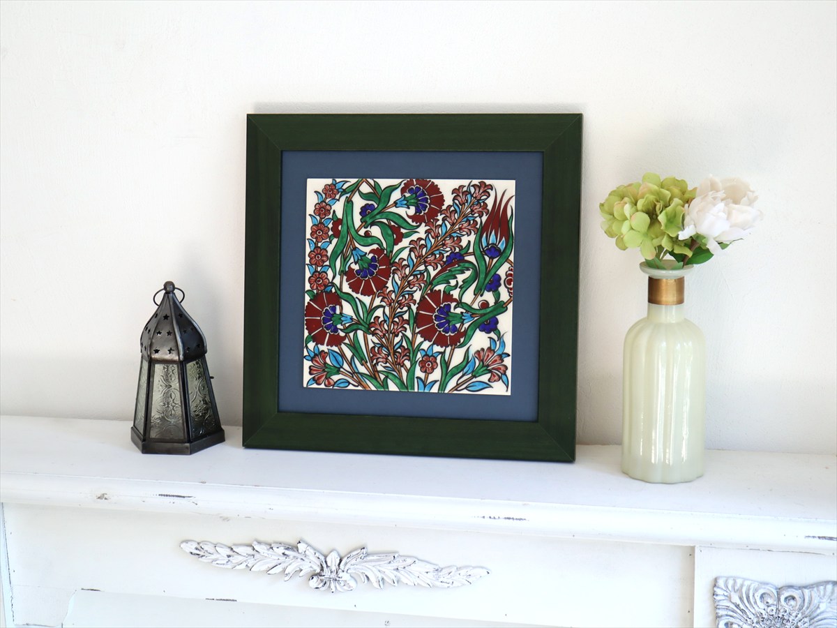 トルコ陶器 手書きタイル 1枚額 H31×W31×D2.5cm カーネーション Turkish Hand Paint Tile