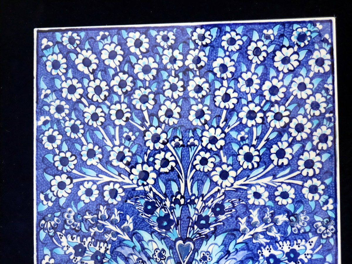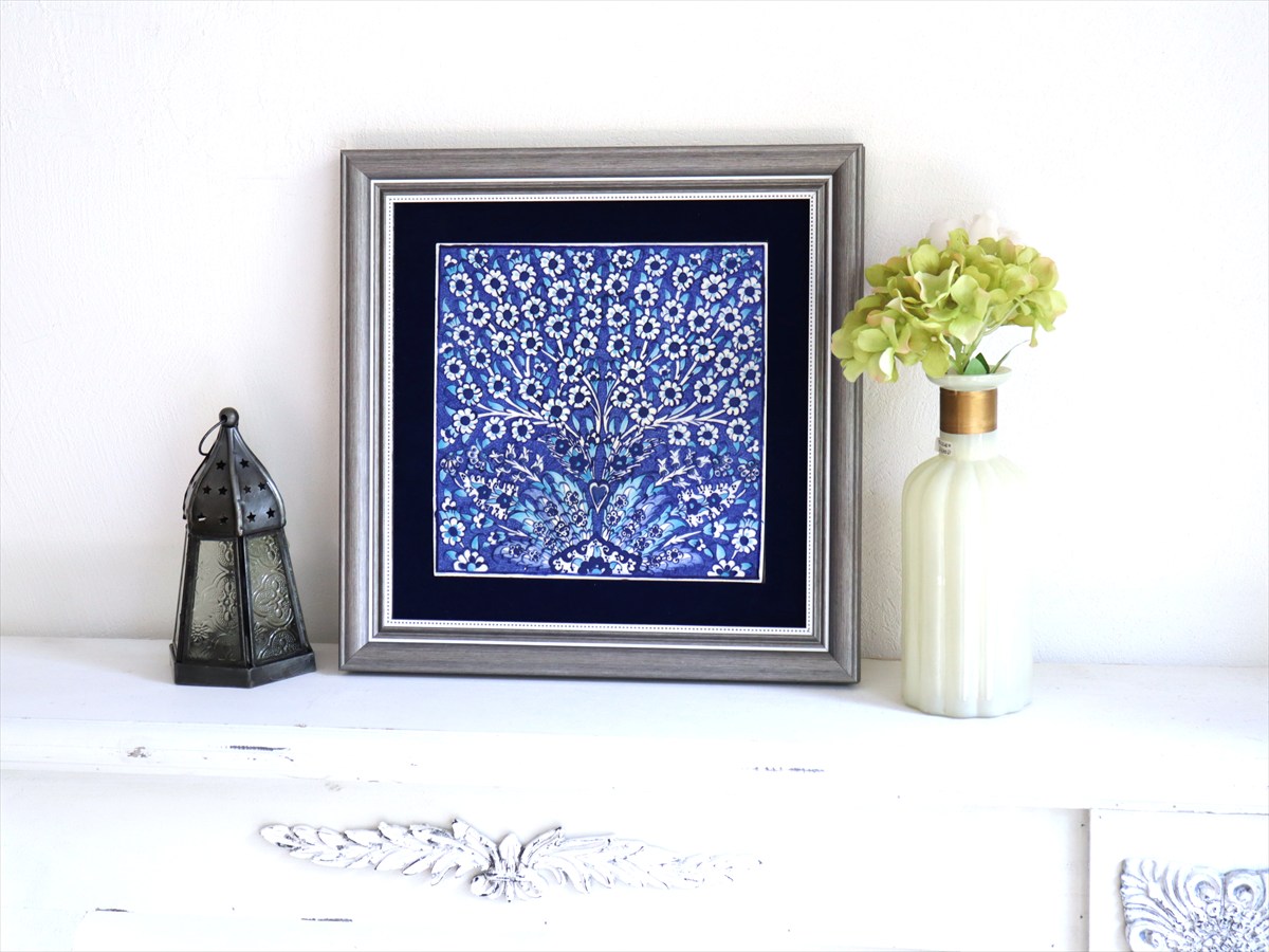 16世紀後半に好んで描かれたプラムツリーのデザイン。どこまでも枝葉をのばす生命の樹は、子孫へ命が延々と引き継がれてゆく様子をイメージした、イスラミックモチーフです。トプカプ宮殿の壁にも埋め込まれている人気のデザインです。花びら箇所には、立体的に盛り上がった釉薬を使い、凹凸のある豪華な絵付けが楽しめます。シルバーのフレームがブルータイルを引き立てています。