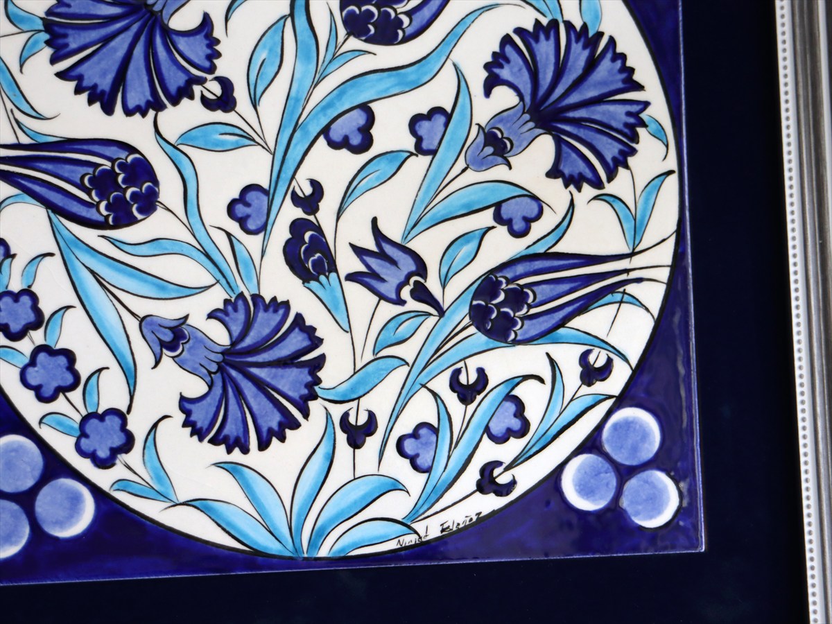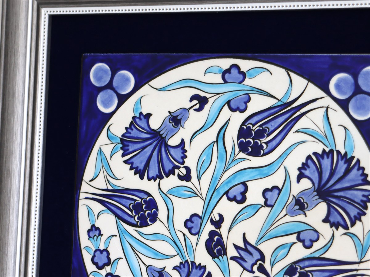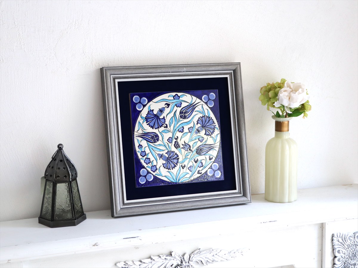 トルコを代表する花であるチューリップ&カーネーションを色鮮やかに描いた絵柄は、近年トルコで浸透し始めているモダンデザイン。独特のトルコスタイルが凝縮された繊細なデザインは、現地の職人によって1枚ずつ手描きされたものです。シルバーのフレームがブルータイルを引き立てています。