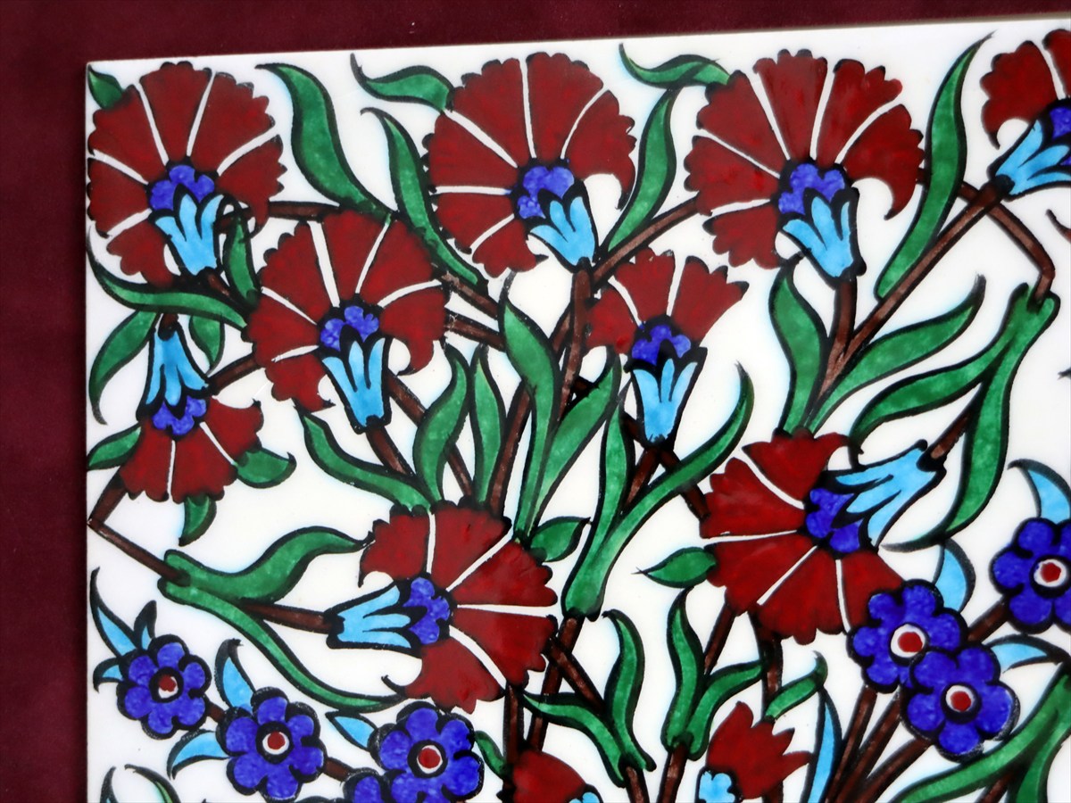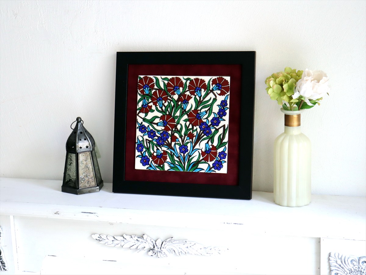 トルコ陶器 手書きタイル 1枚額 H30×W30×D1.5cm チューリップ&カーネーション Turkish Hand Paint Tile