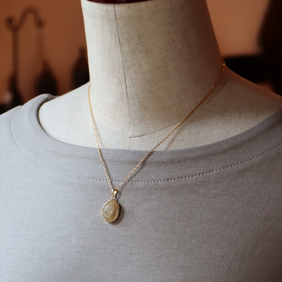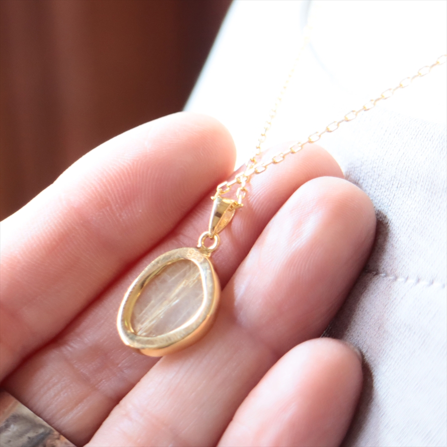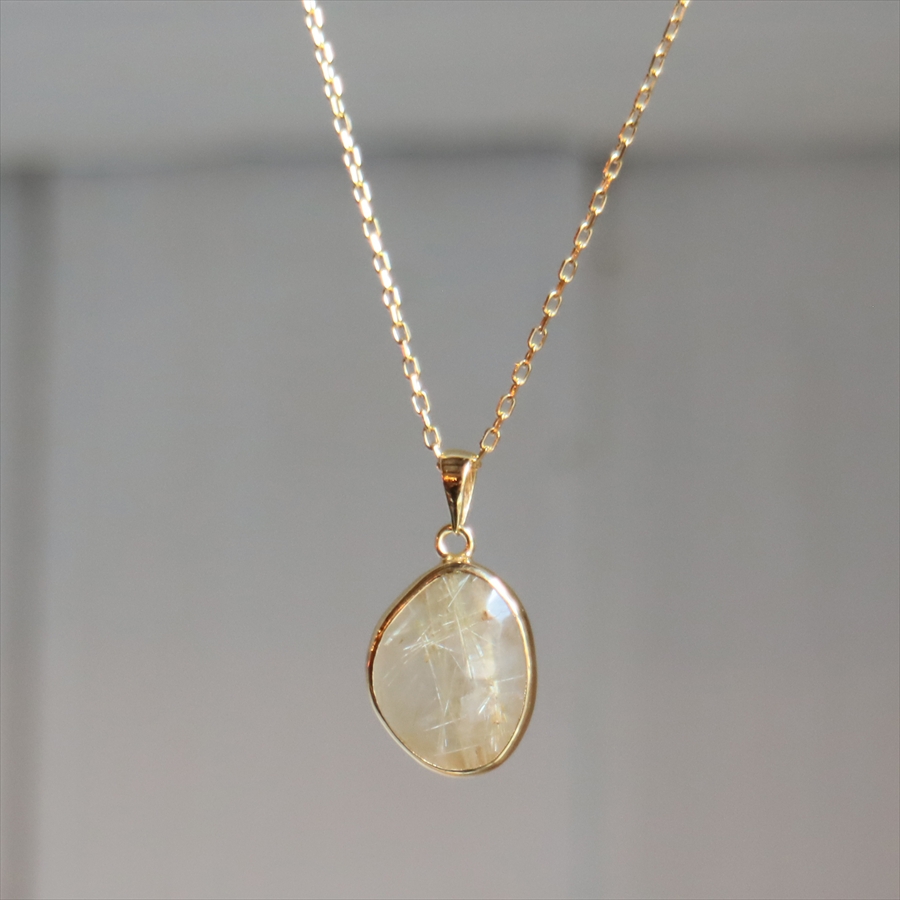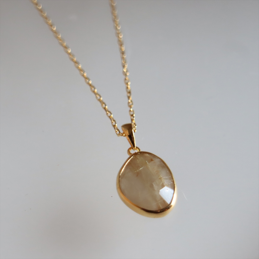 乳白色の半透明なクォーツの内部に、繊細な金色のルチルが美しく散りばめられた、ゴールデンルチルクォーツのネックレスです。肌の色になじむ大人のニュアンスカラーで、時折キラッと光るルチルが上品なイメージです。