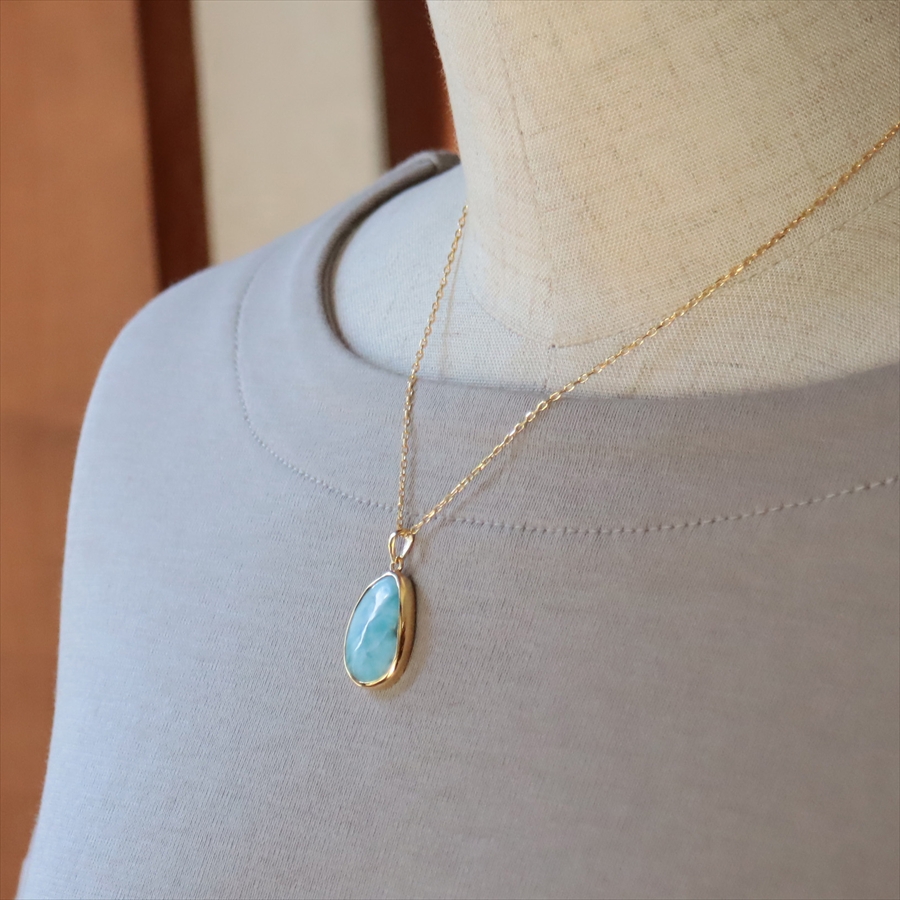 ブルーとホワイトの波模様は、カリブ海の宝石とも呼ばれ、人気の高いストーンのひとつです。こちらのペンダントは、2cm以上もある大粒の良質なラリマーをセレクトしました。