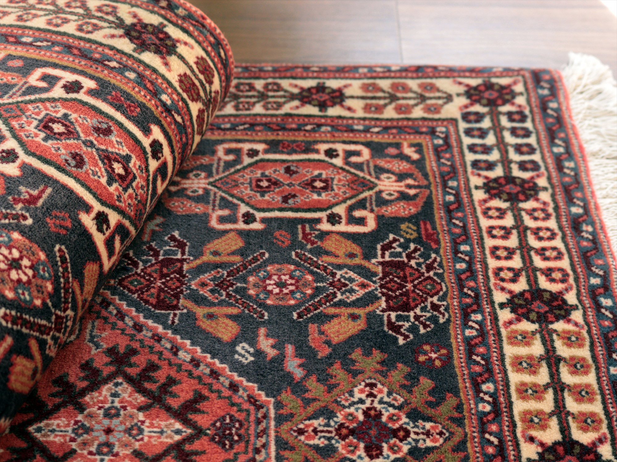 朱色に近いレッドと、グレーがかったネイビーの色使いで中央にメダリオンがおかれたカシュカイ族の手織り絨毯。幾何学模様や小花など、一面にモチーフがしっかりと織り込まれています。存在感を感じられる1枚ですが、発色はやや淡い色合いに抑えられているのでお部屋に程よく馴染みそうです。