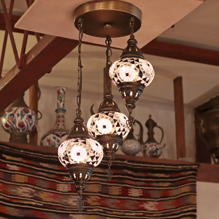 モザイクランプ トルコランプ シャンデリア 3灯 全高60cm 直径27cm パープル 【天井工事必要】