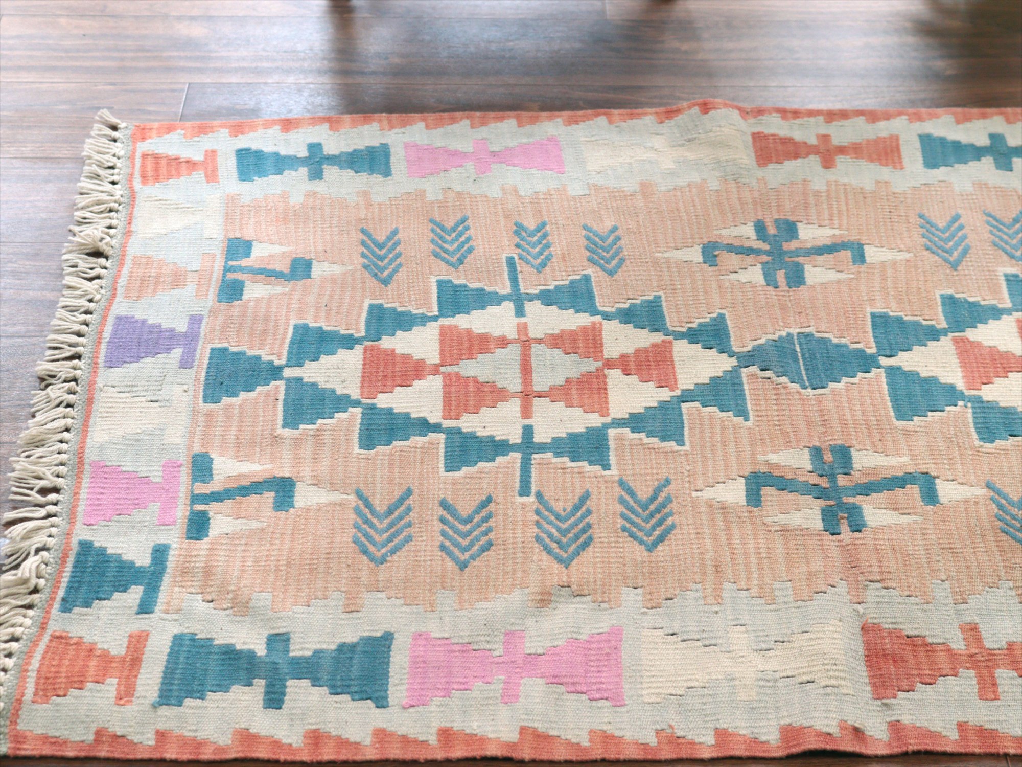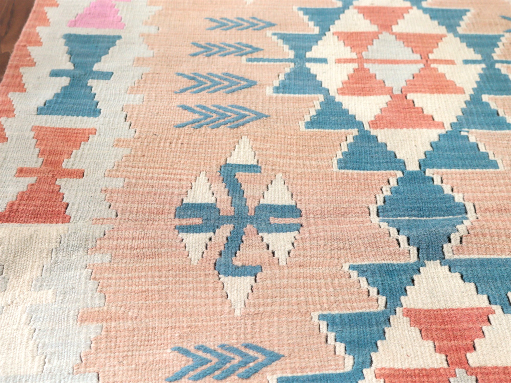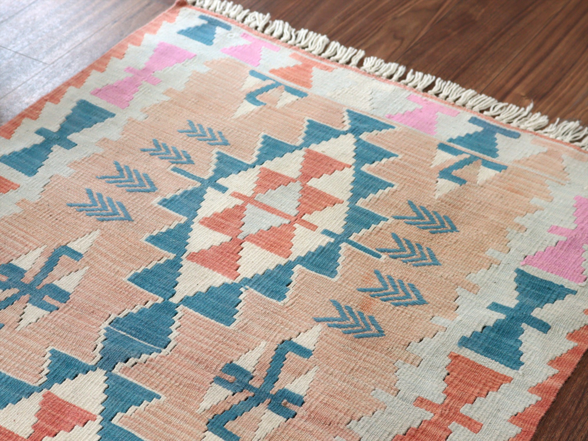 オレンジに水色、ピンク、ブルーの淡い色使いで、モチーフが織られたトルコ中央部の都市、カイセリ地方のキリム。華やかな色使いでありながら、パステルトーンなので程よい主張でお部屋に馴染んでくれそうです。