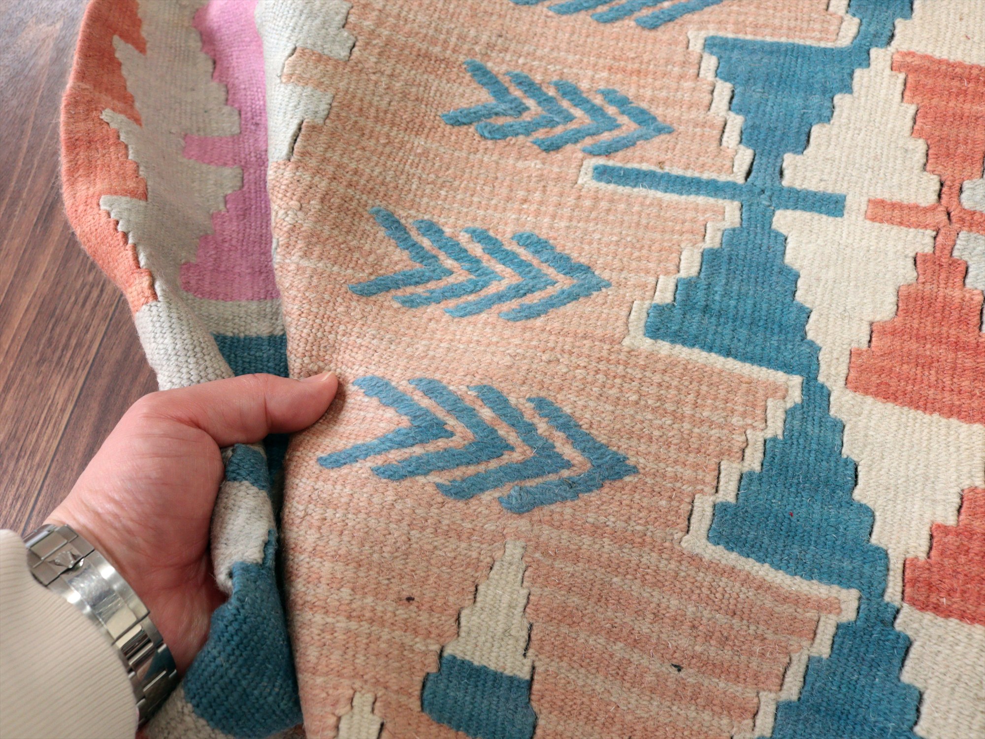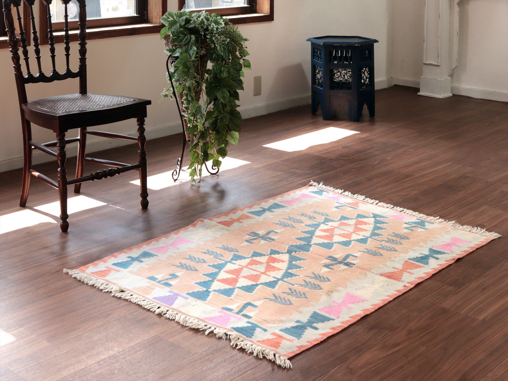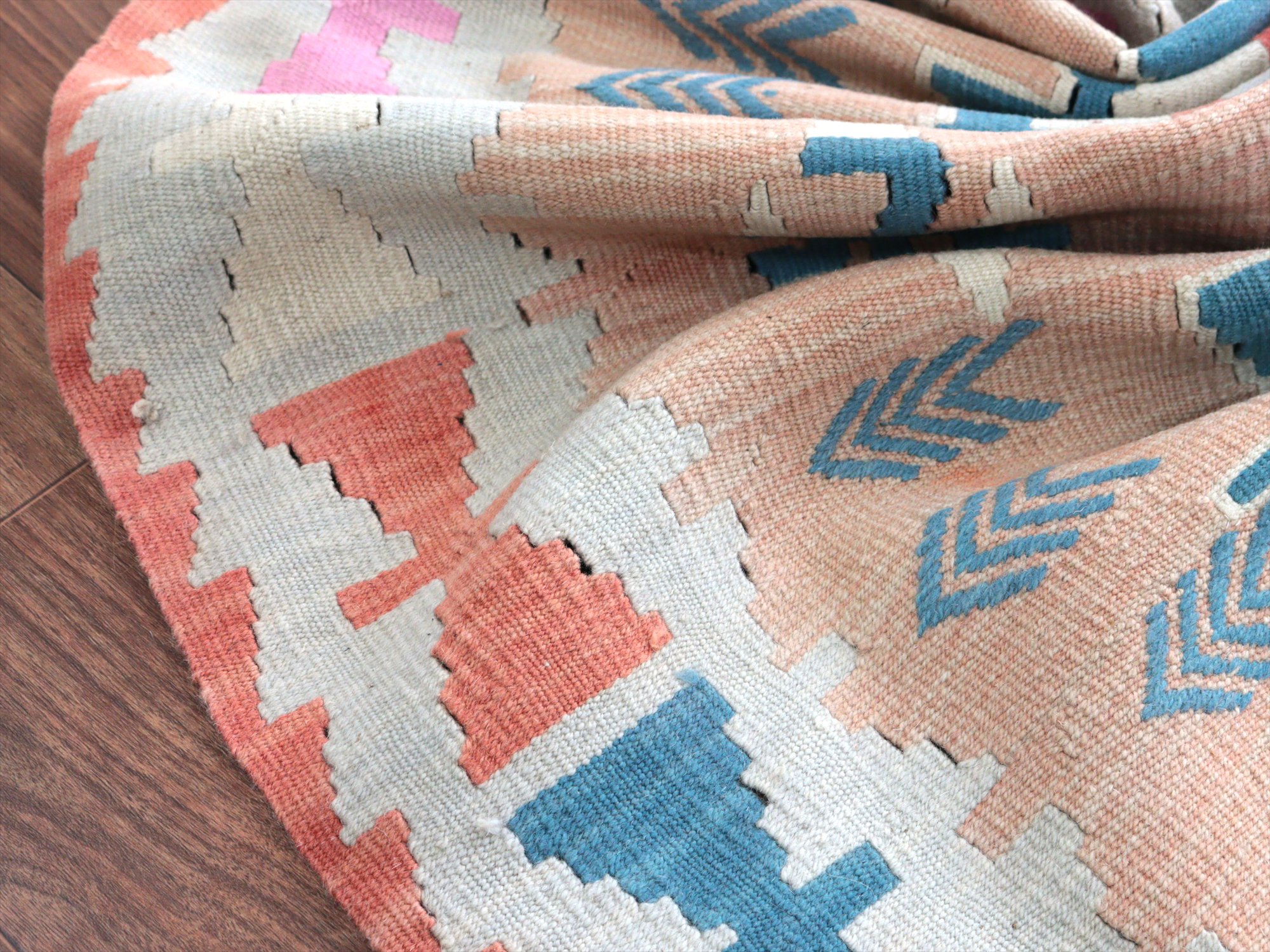 オレンジに水色、ピンク、ブルーの淡い色使いで、モチーフが織られたトルコ中央部の都市、カイセリ地方のキリム。華やかな色使いでありながら、パステルトーンなので程よい主張でお部屋に馴染んでくれそうです。