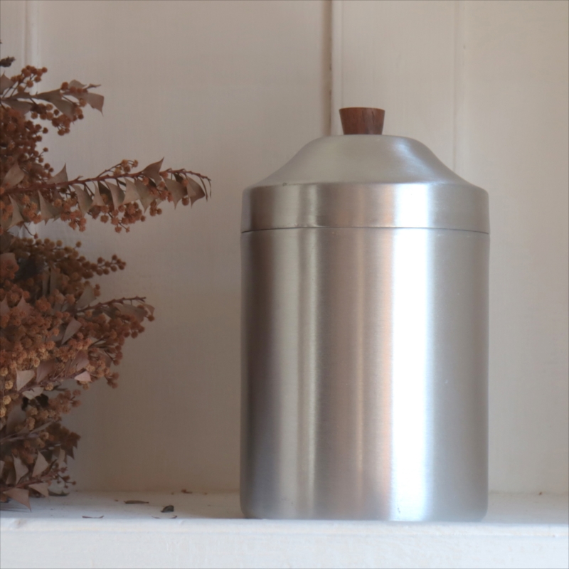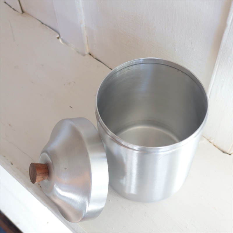 シンプルなアルミキャニスター。持ち手は木製(アカシア材)で、無機質になりすぎず、温かみのある雰囲気です。オリジナルのラベルを貼ったり、文字をペイントしたり、カフェ風のディスプレイにもぴったりです。