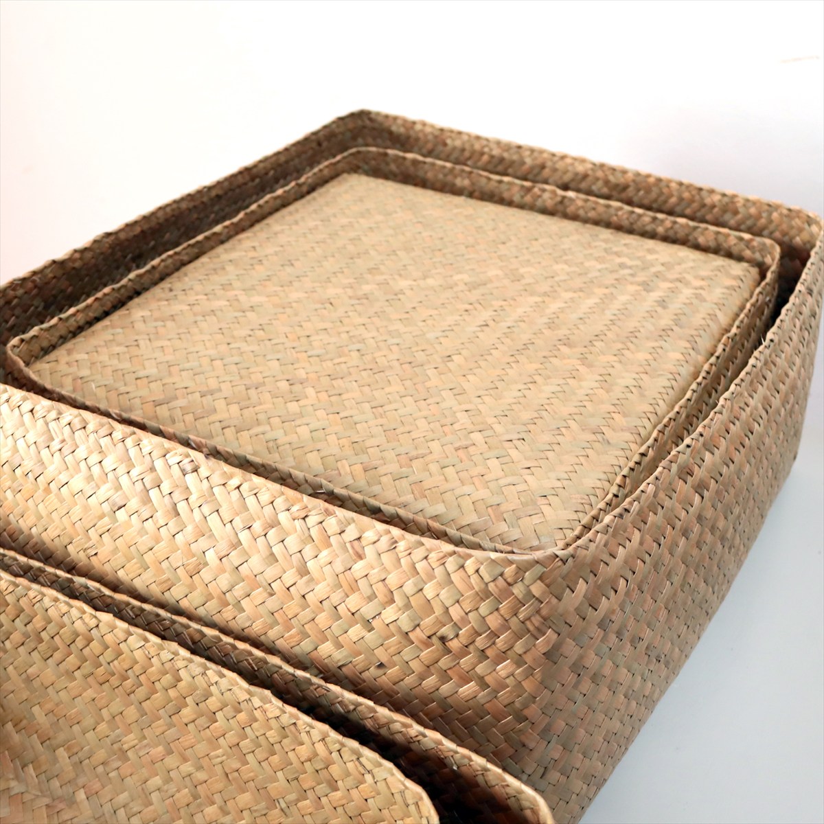 かごバスケット 2点セット M&Lサイズ 入れ子 タイ製 カチュー水草 ふた付 レクタングル 収納ボックス Basket Asian straw basket, Thailand