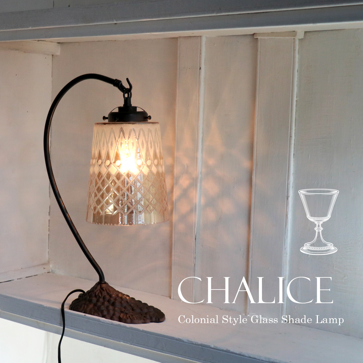 直線的なゴブレット形のシェードに、サンドブラストとカットガラスで幾何学模様がデザインされています。大正レトロなイメージもあり、和風空間のほか、カフェ風インテリアにも合わせやすいランプです。