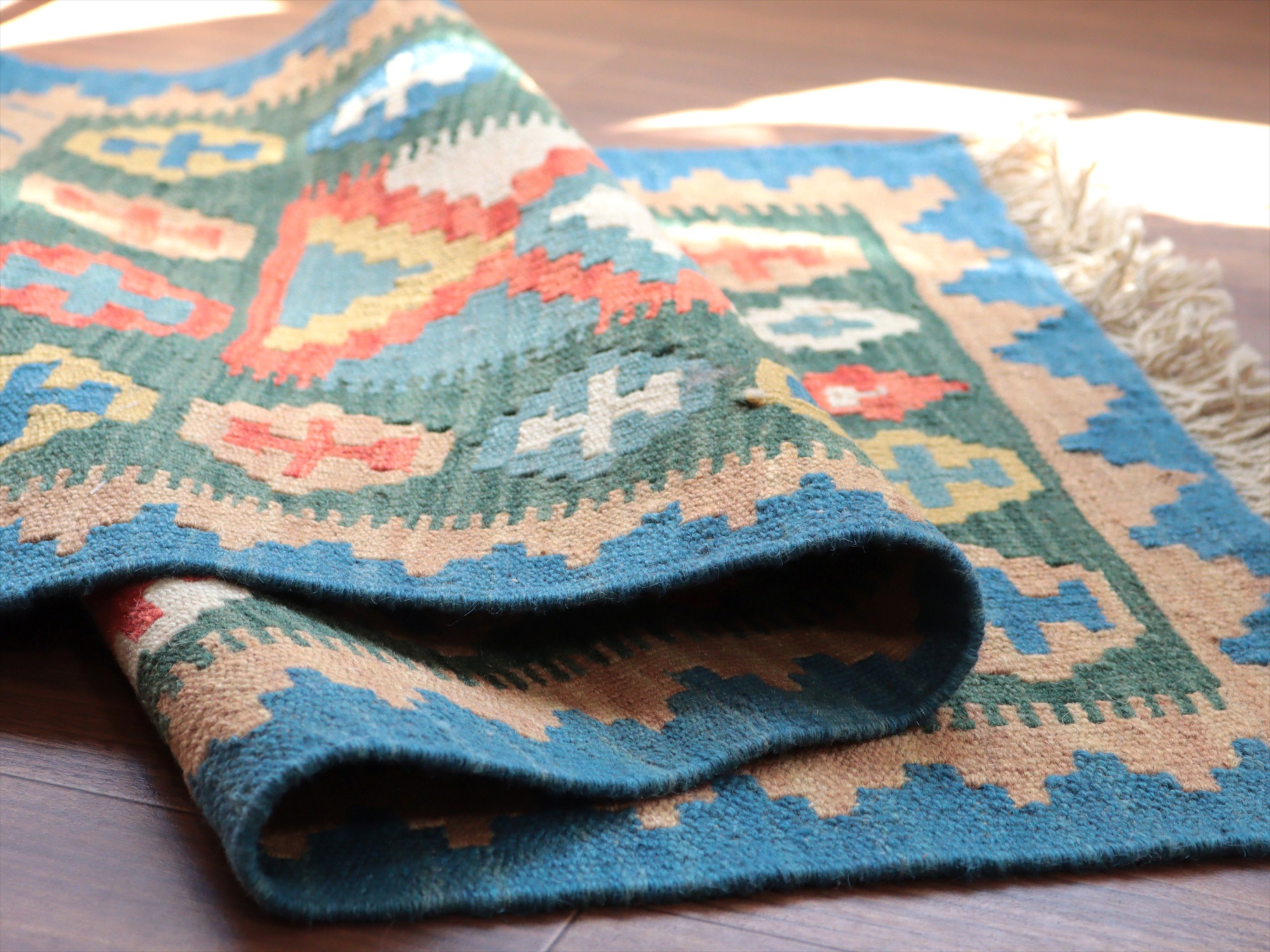 6-7mm程度の厚みがあり、パイル(毛足)がない平織りの敷物で表面は少しザラっとした肌ざわりです。織り手の自由なアイデアでデザインされていますので、左右対象でなかったり、モチーフが少しずれていたりということもありますが、世界で一枚だけの作品ですからその点はご了承ください。