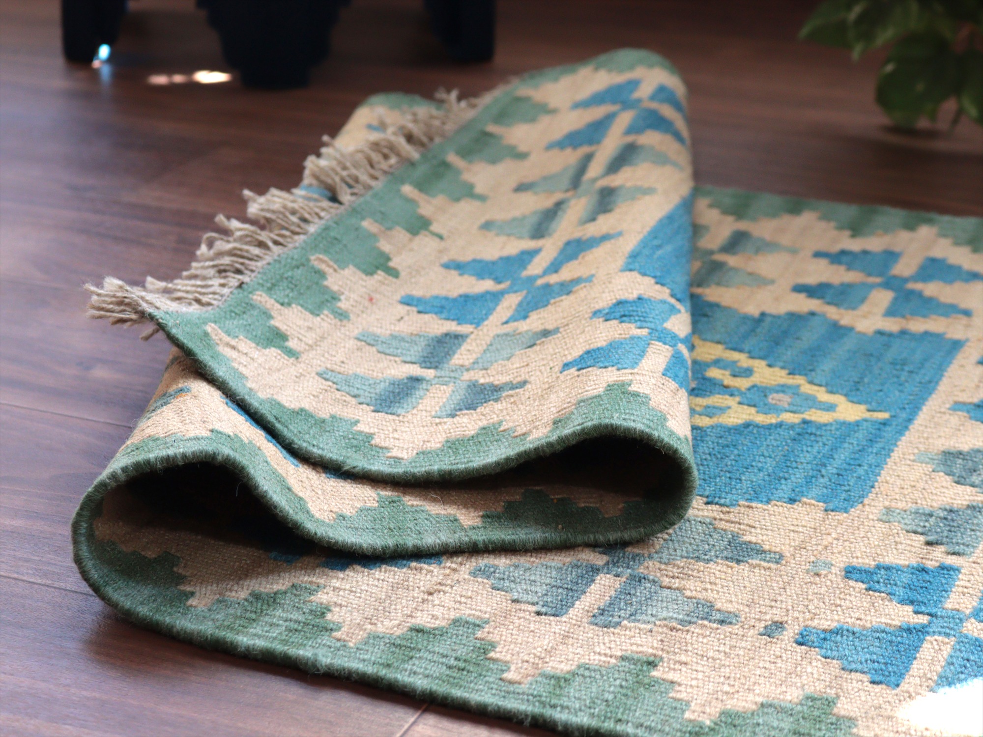 6-7mm程度の厚みがあり、パイル(毛足)がない平織りの敷物で表面は少しザラっとした肌ざわりです。織り手の自由なアイデアでデザインされていますので、左右対象でなかったり、モチーフが少しずれていたりということもありますが、世界で一枚だけの作品ですからその点はご了承ください。
