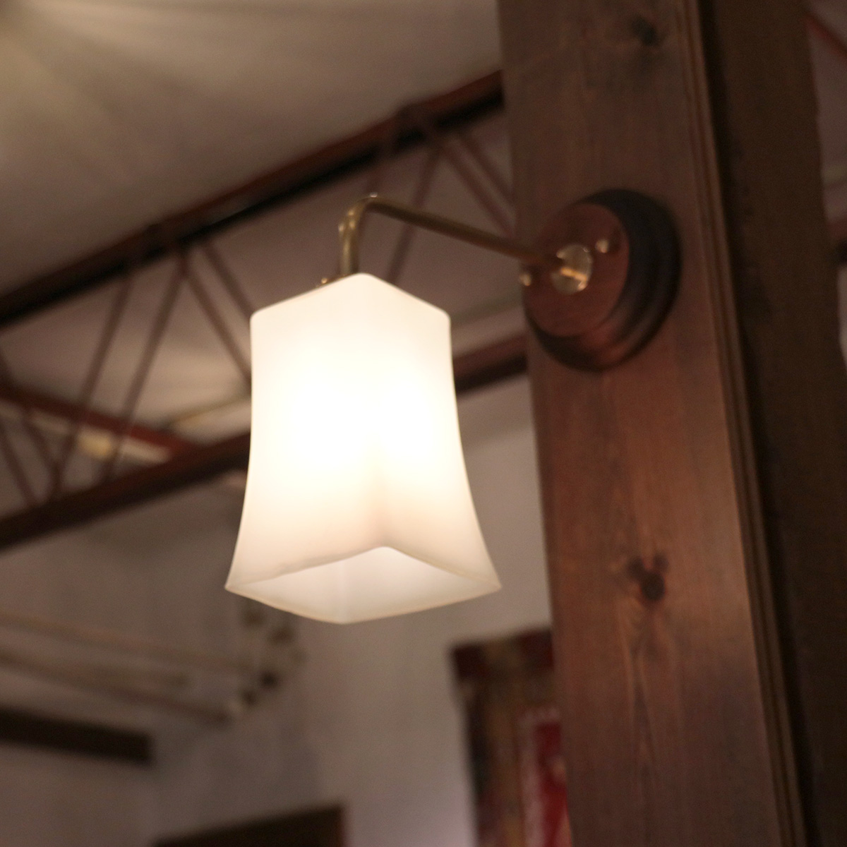 シンプルな四角いガラスシェード。手作りのガラスは、厚みが均一でなかったり、レトロな雰囲気です。玄関ホールや、洗面スペースなどに。真鍮のアームはゴールドとブロンズの2色からお選びいただけます。