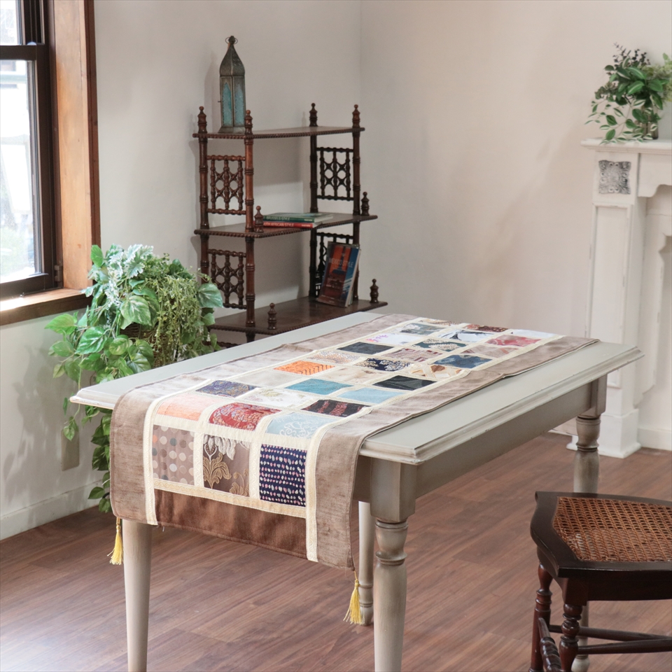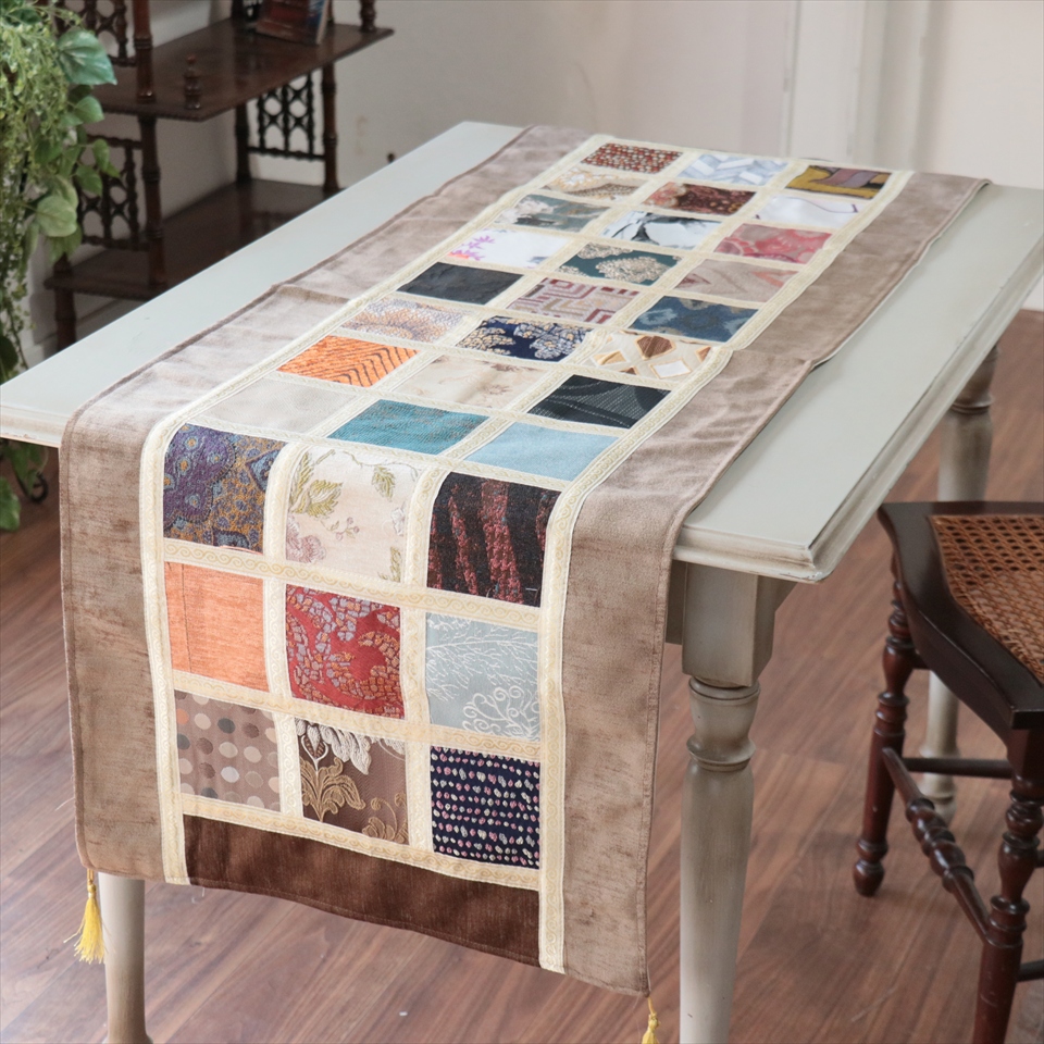 - テーブルランナー モザイクパッチワーク 142x50cmサイズ シュニール素材