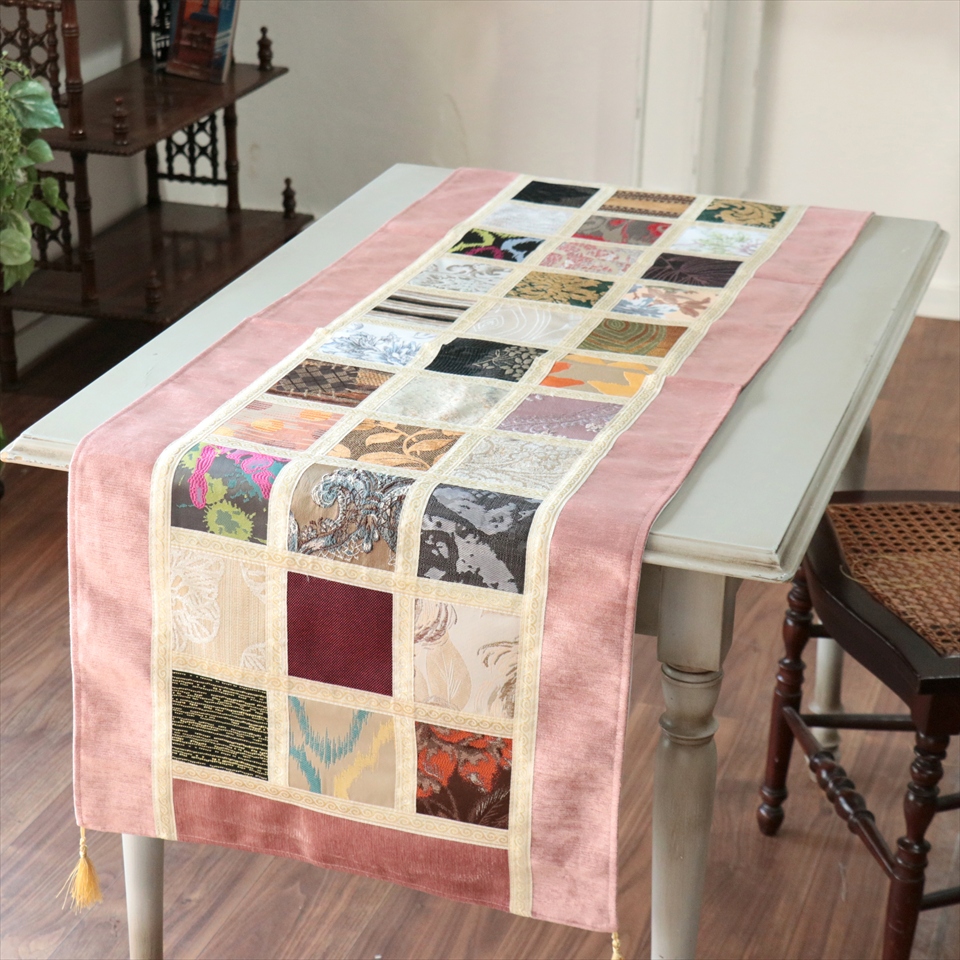- テーブルランナー モザイクパッチワーク 142x50cmサイズ シュニール素材