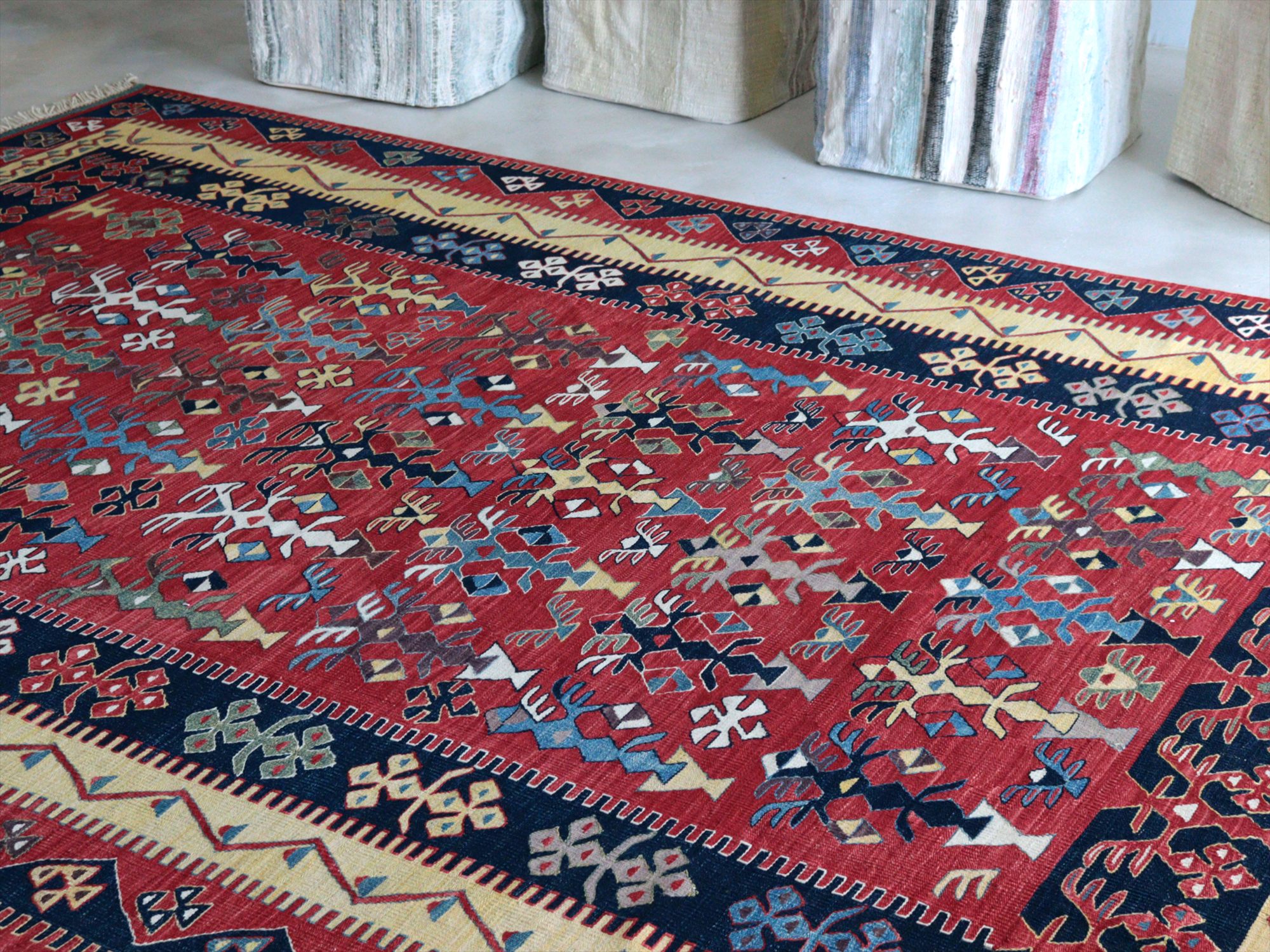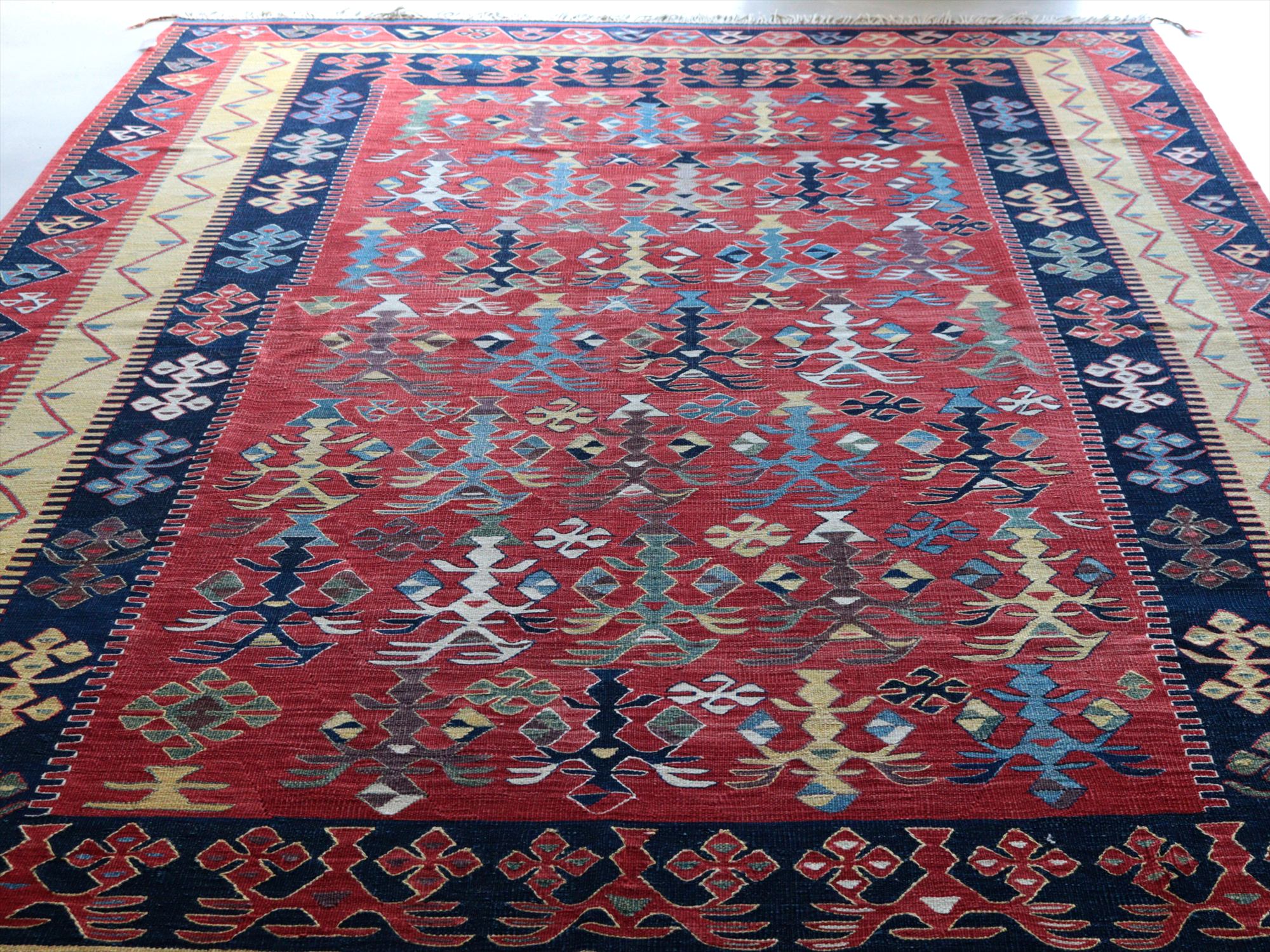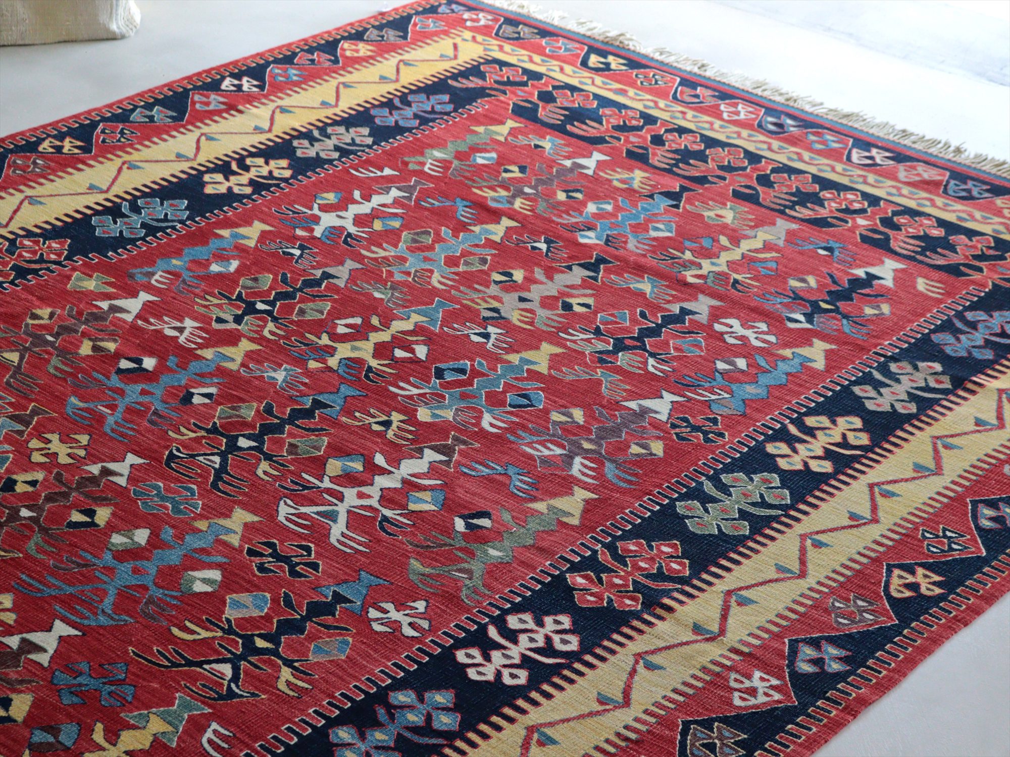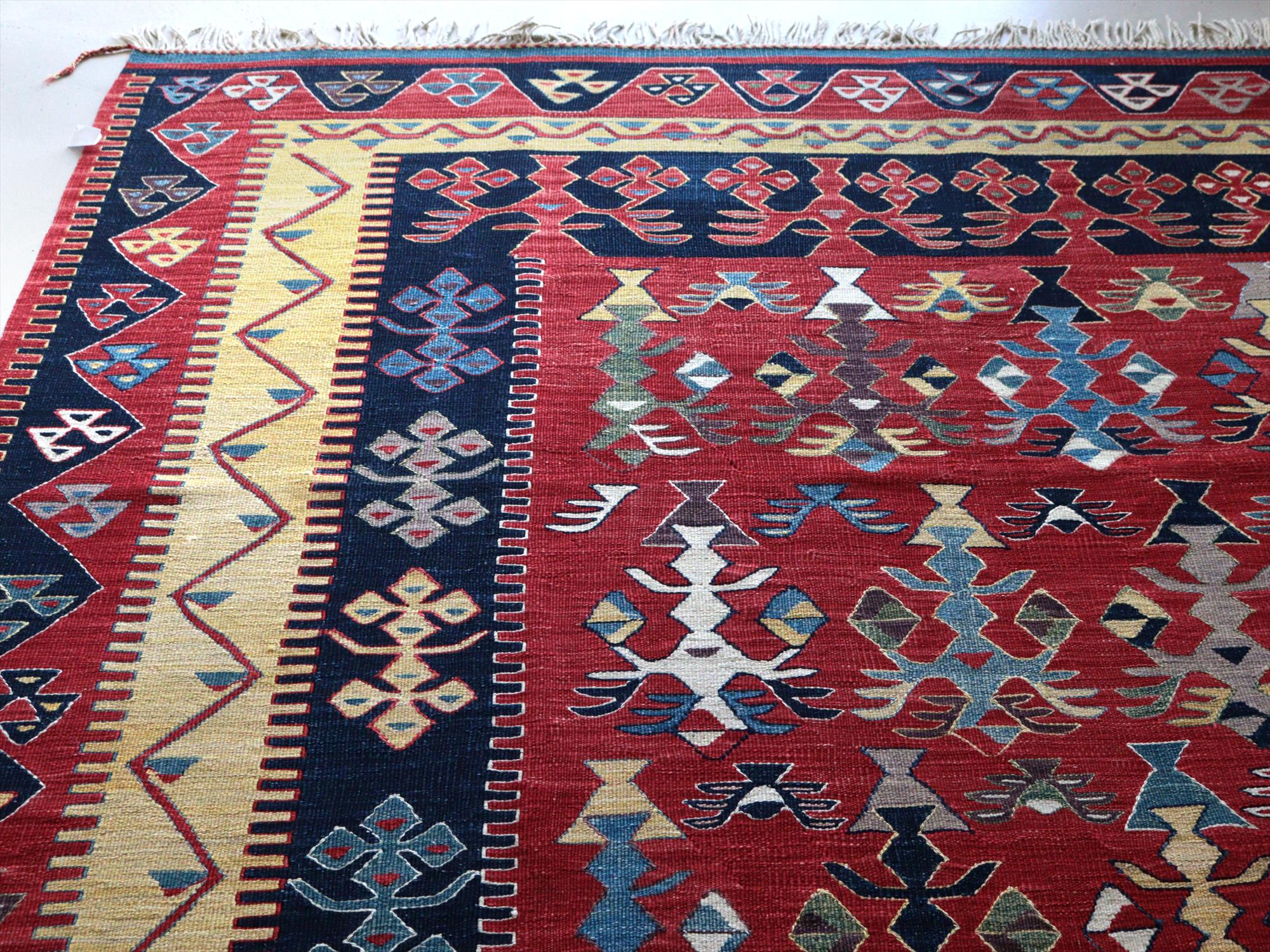 草木染の糸を用いて織られたシャルキョイ地方のリプロダクトキリム。レッド、イエロー、ネイビーを基調とした色使いでコントラストが効いていて、合成染料にはないやわらかな発色と、自然な色の深みが特徴的です。それぞれの幾何学模様やモチーフが丁寧に表現されていますが、ネイビーのボーダー(額縁)部分がずれて織られていて、そこから手織りらしいあたたかみも感じられます。