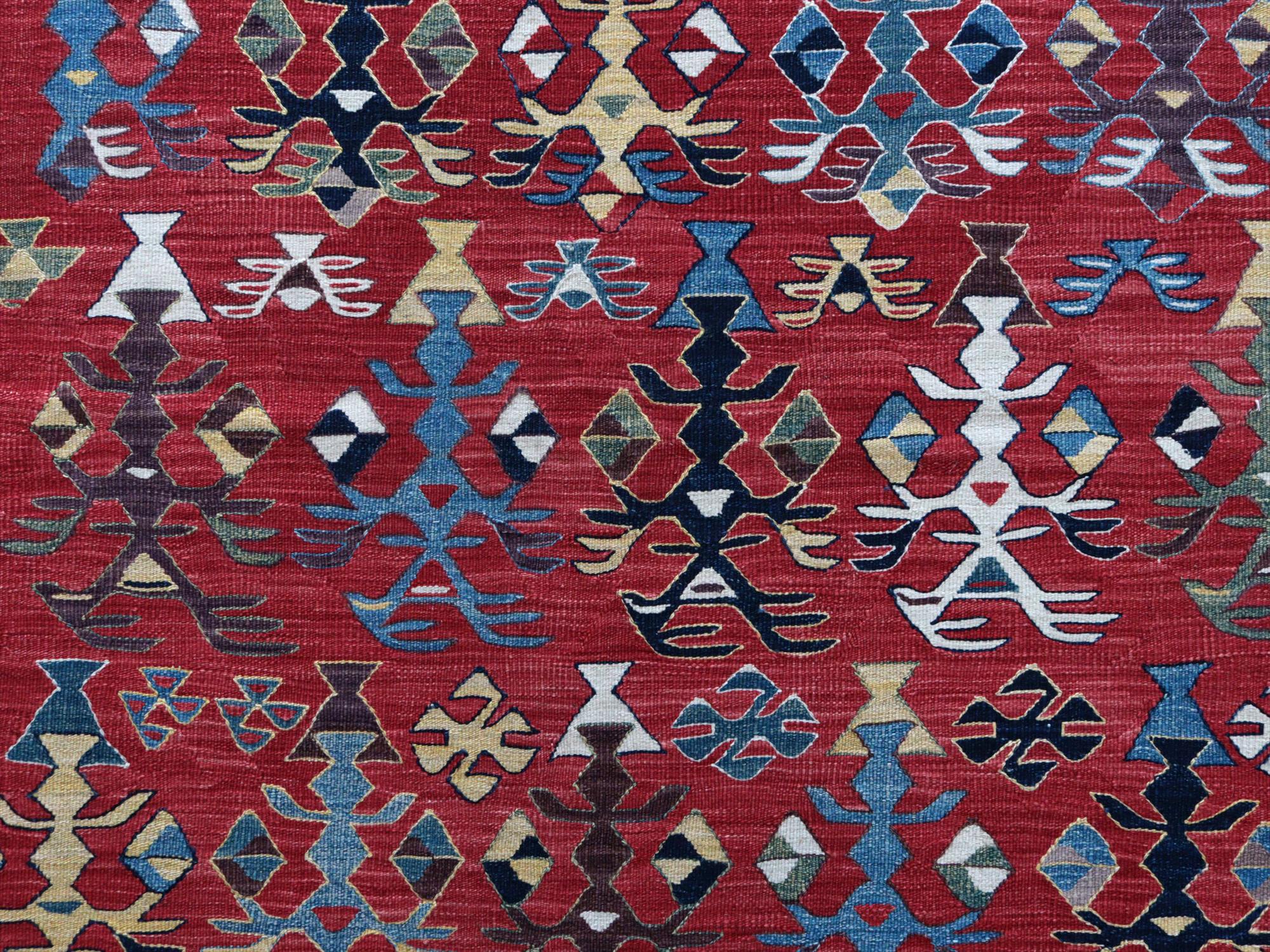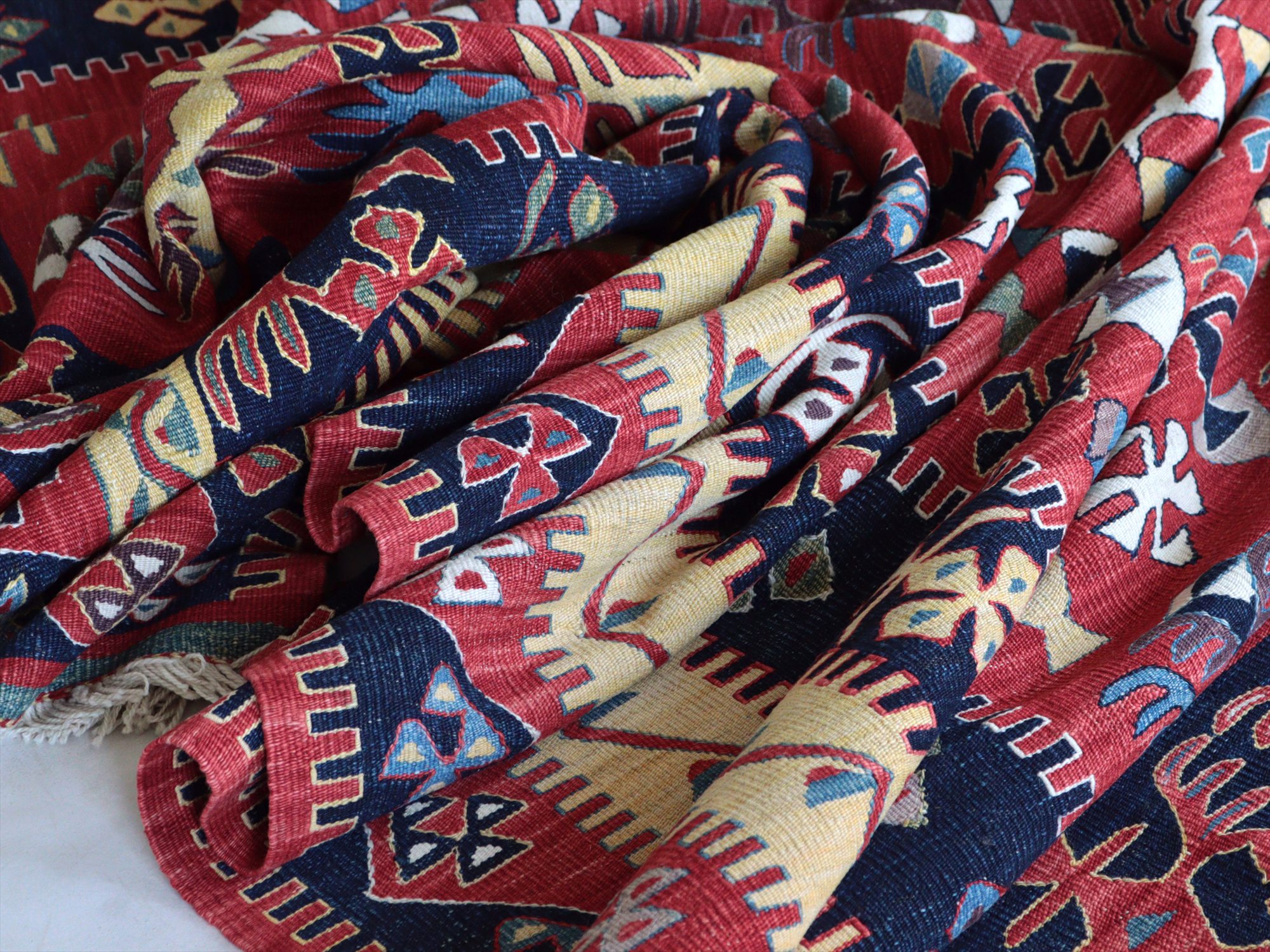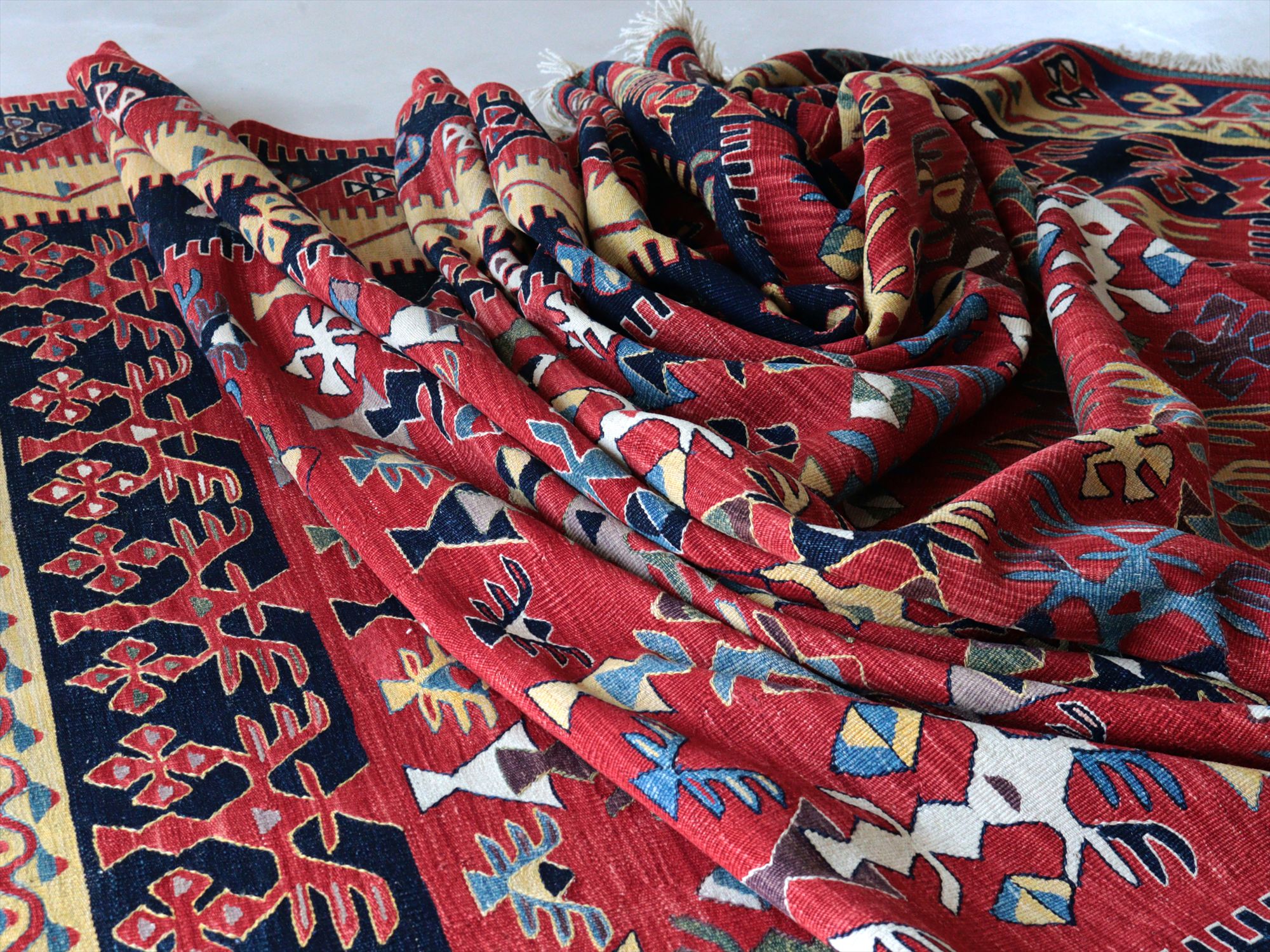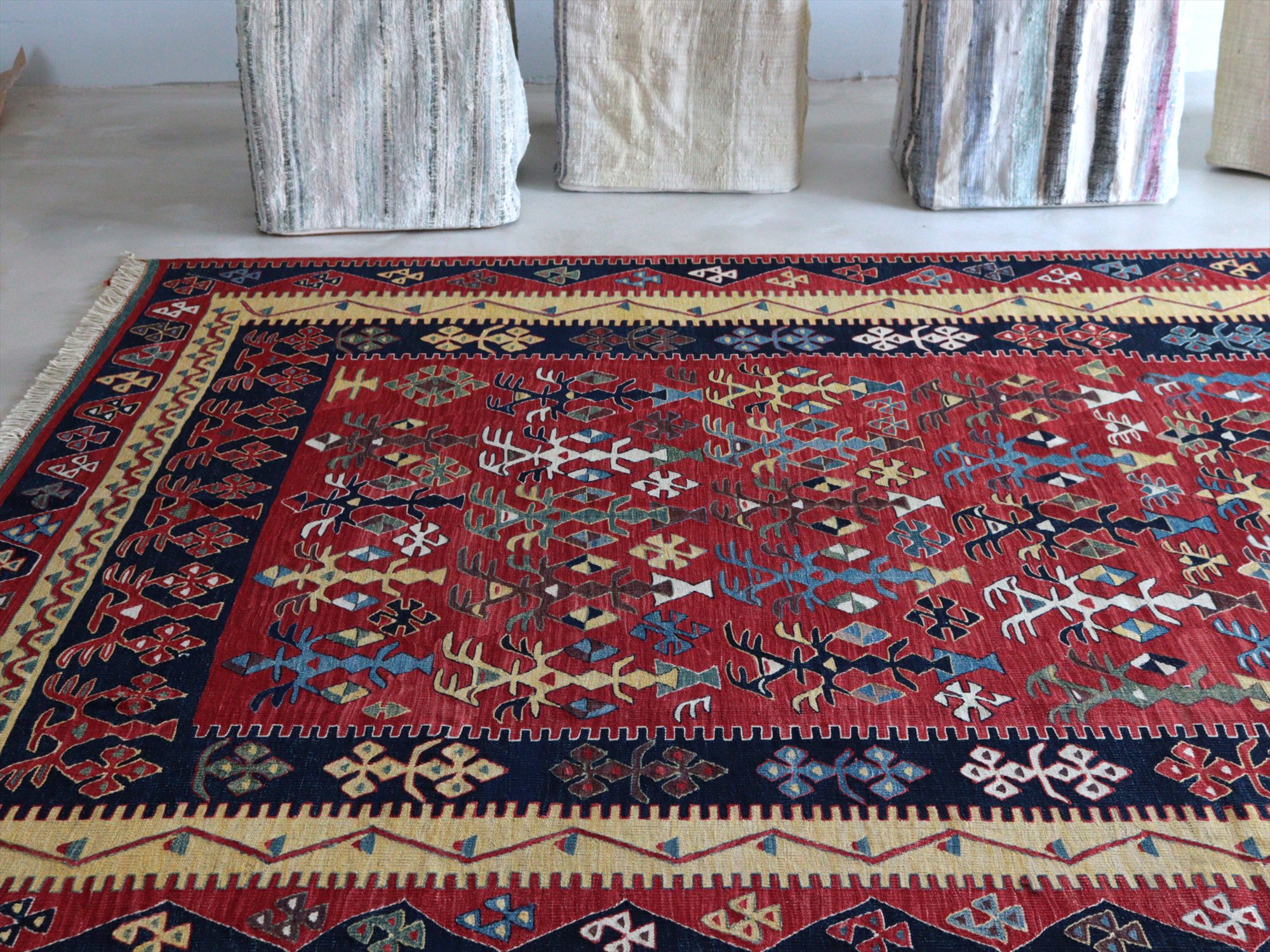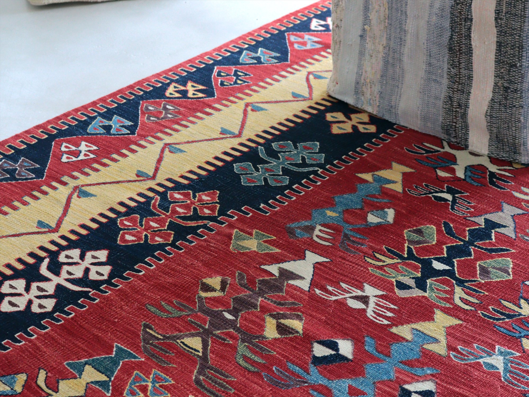 草木染の糸を用いて織られたシャルキョイ地方のリプロダクトキリム。レッド、イエロー、ネイビーを基調とした色使いでコントラストが効いていて、合成染料にはないやわらかな発色と、自然な色の深みが特徴的です。それぞれの幾何学模様やモチーフが丁寧に表現されていますが、ネイビーのボーダー(額縁)部分がずれて織られていて、そこから手織りらしいあたたかみも感じられます。