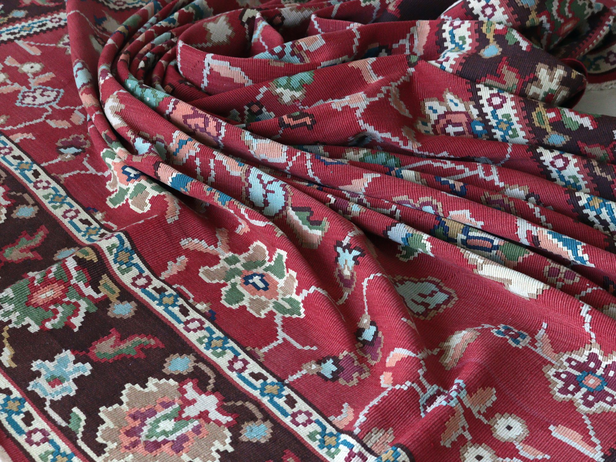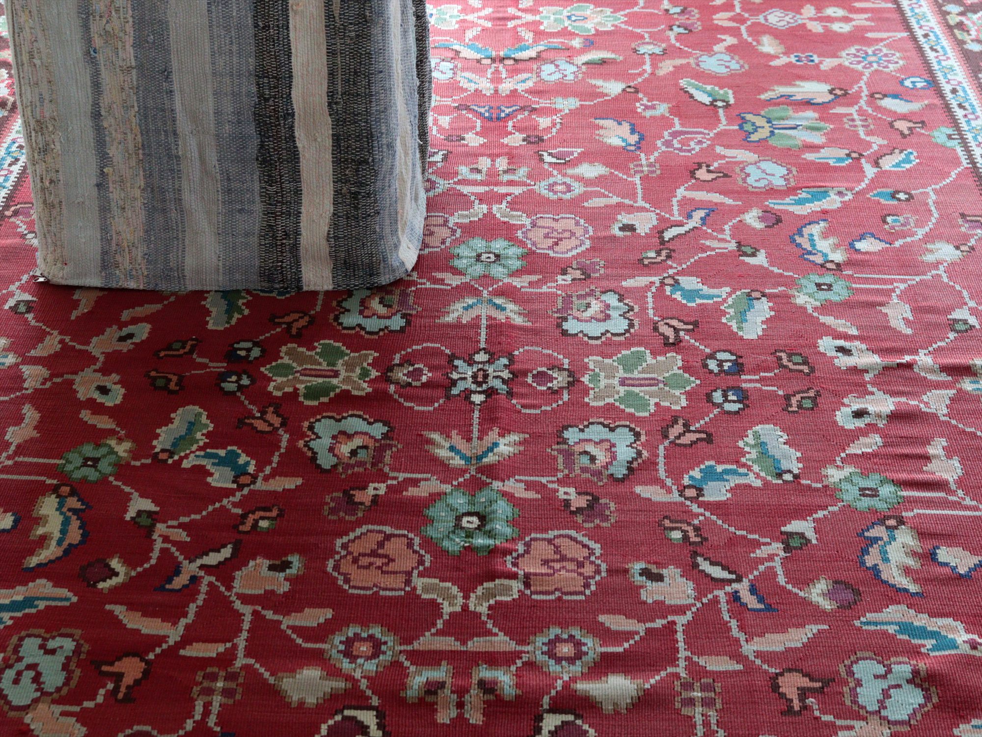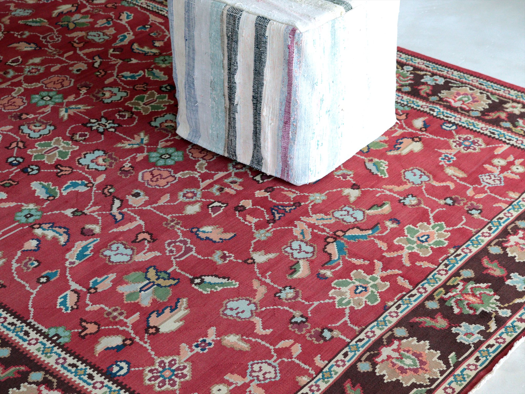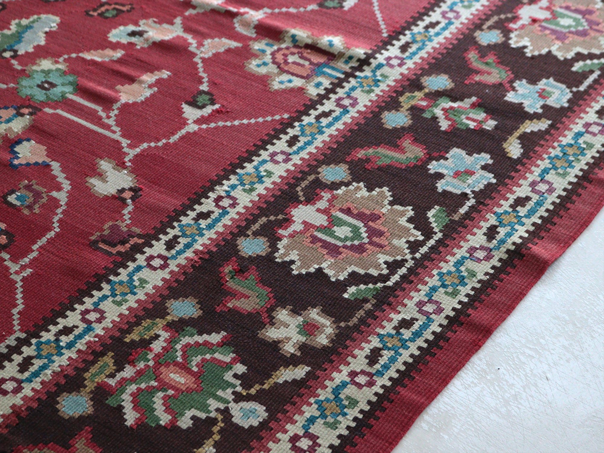 オスマントルコ帝国のヨーロッパ大陸側、シャルキョイ地方のキリム。華やかな花が描かれたカーペットのようなデザインのキリムです。エスニックになりすぎず、東欧&バルカンのかわいらしい伝統柄が楽しめます。