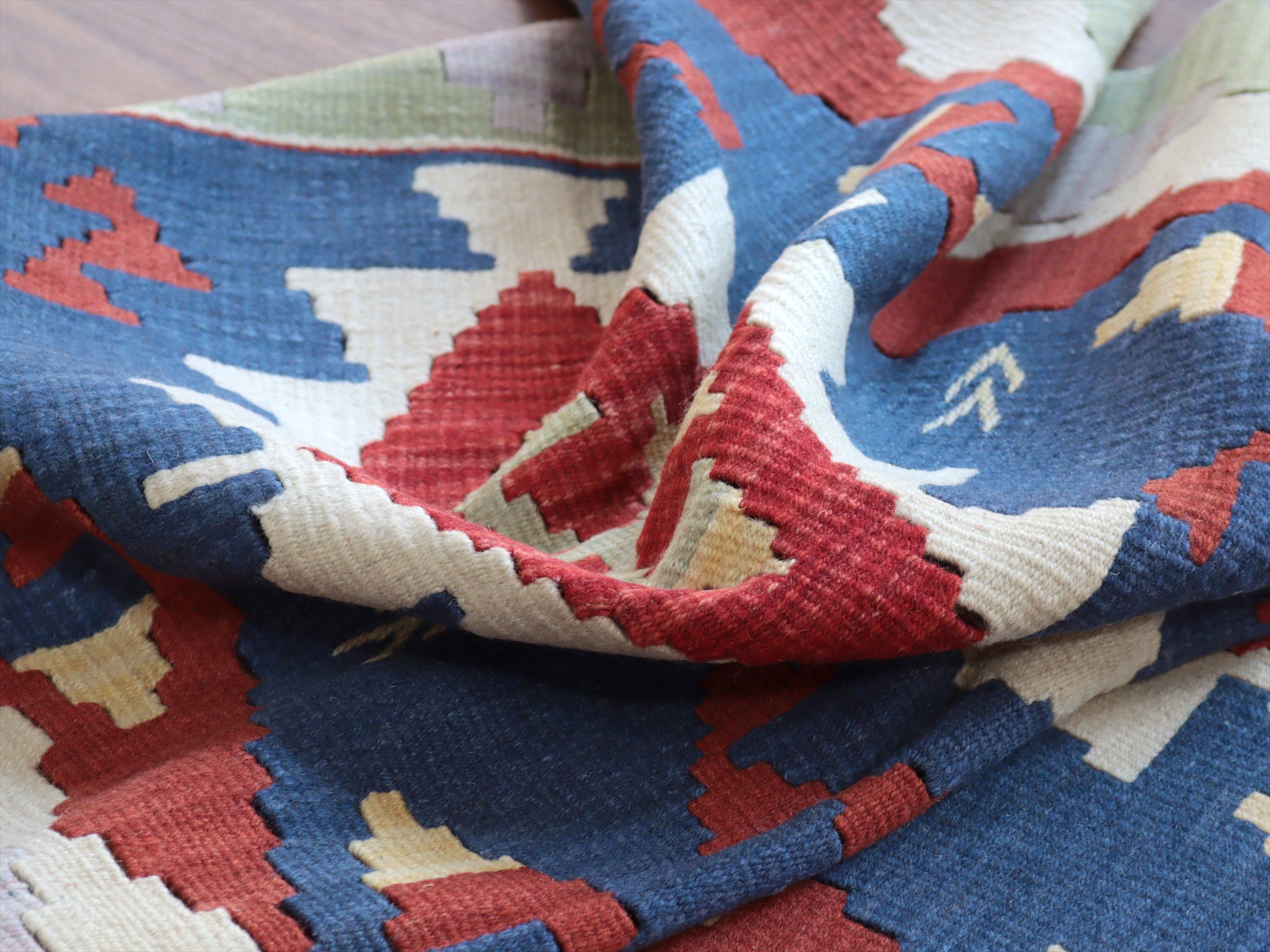 織り地がしなやかでやわらかいのがカイセリキリムの特徴です。やや厚みがあり、やさしい肌触り。色の切り替え部分には、キリムの織りの特徴で、縦に隙間が開いています(スリットと呼んでいます)。