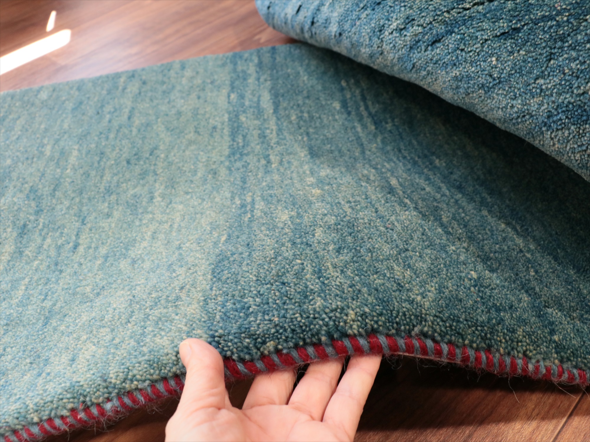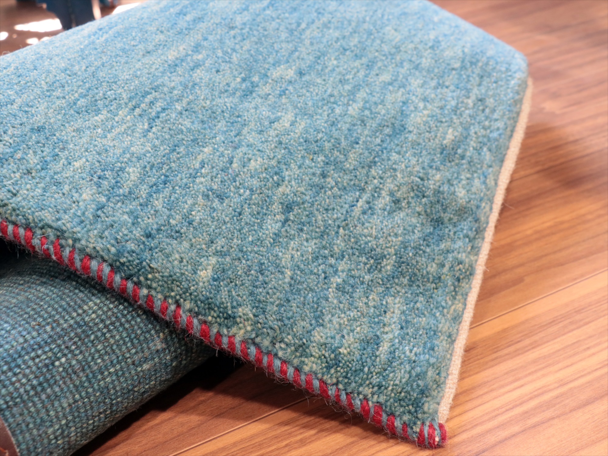右下の角が少し下に長くのびていて、下のラインにゆがみがあります。パイルを含めたラグの厚みは2cm弱。ふっくらとした厚みのある織り地です。