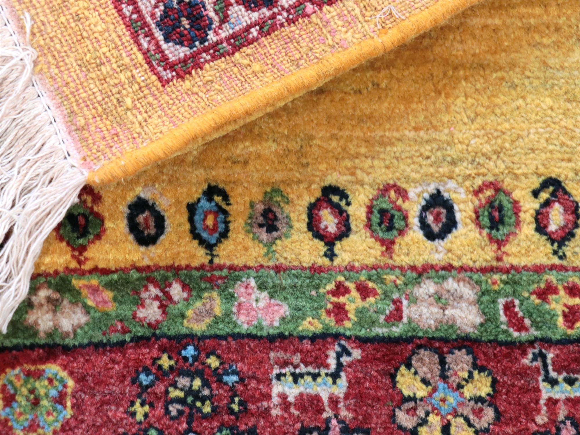 カシュカイ族の伝統柄のメダリオンと、密度の高い織りを活かした繊細なモチーフがぎゅっと一枚に織り込まれたクラシックデザイン。動物や草花、人やペイズリーなどが緻密に織られ、