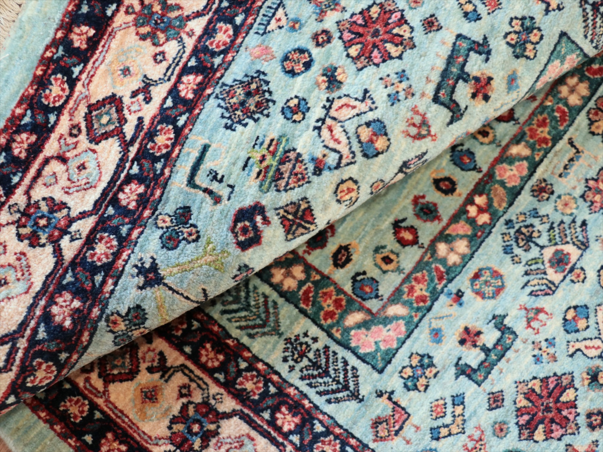 光沢のある美しいトルコブルーに、無染色の羊毛のアイボリーの額縁のクラシックデザイン。密度の高い織りで、草花や鳥、ペイズリーのモチーフが細かく表現されています。