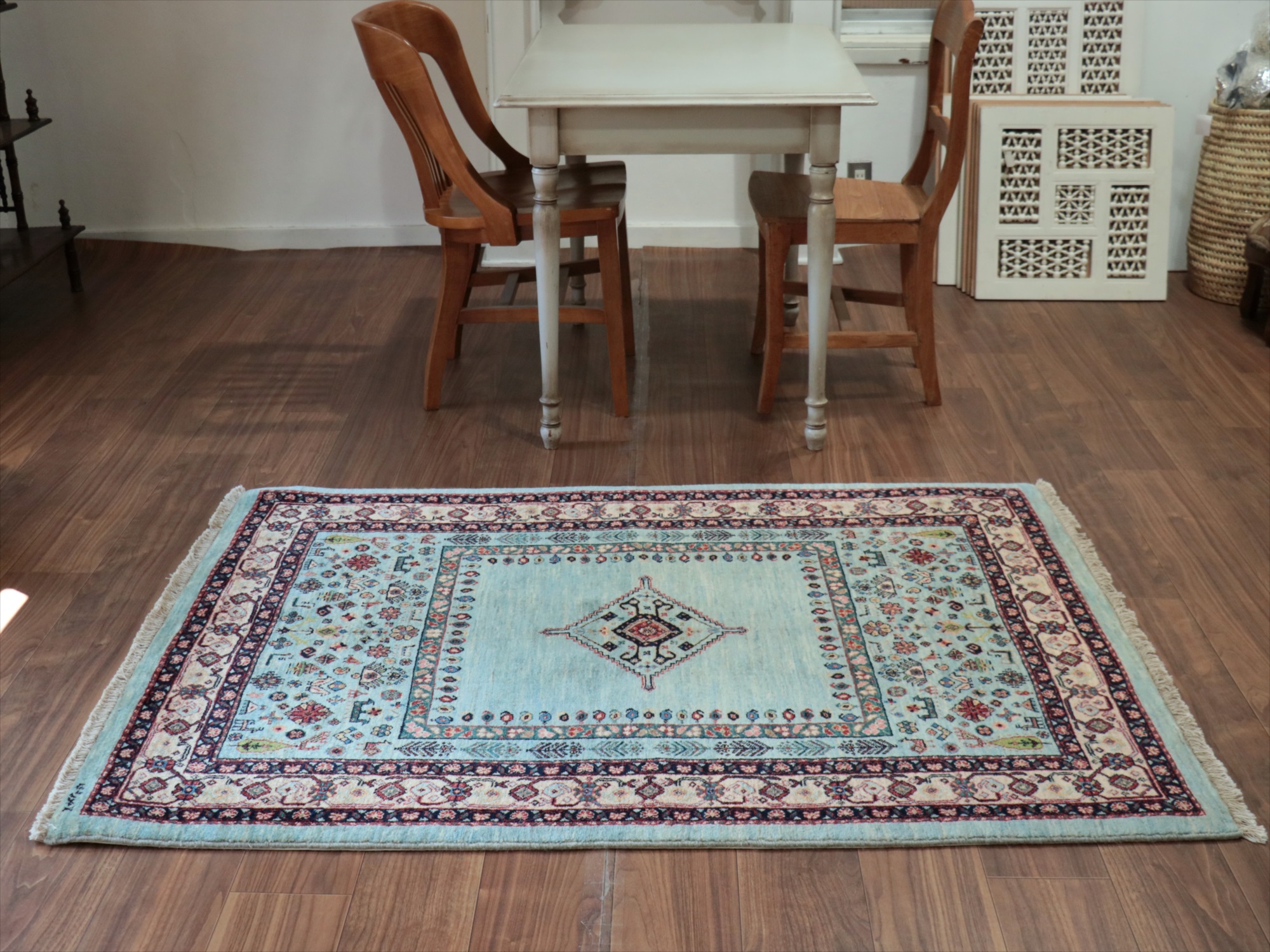 - ギャッベ Luribaft/ルリバフ 152x113cm ペールブルー 小花と幾何学モチーフ