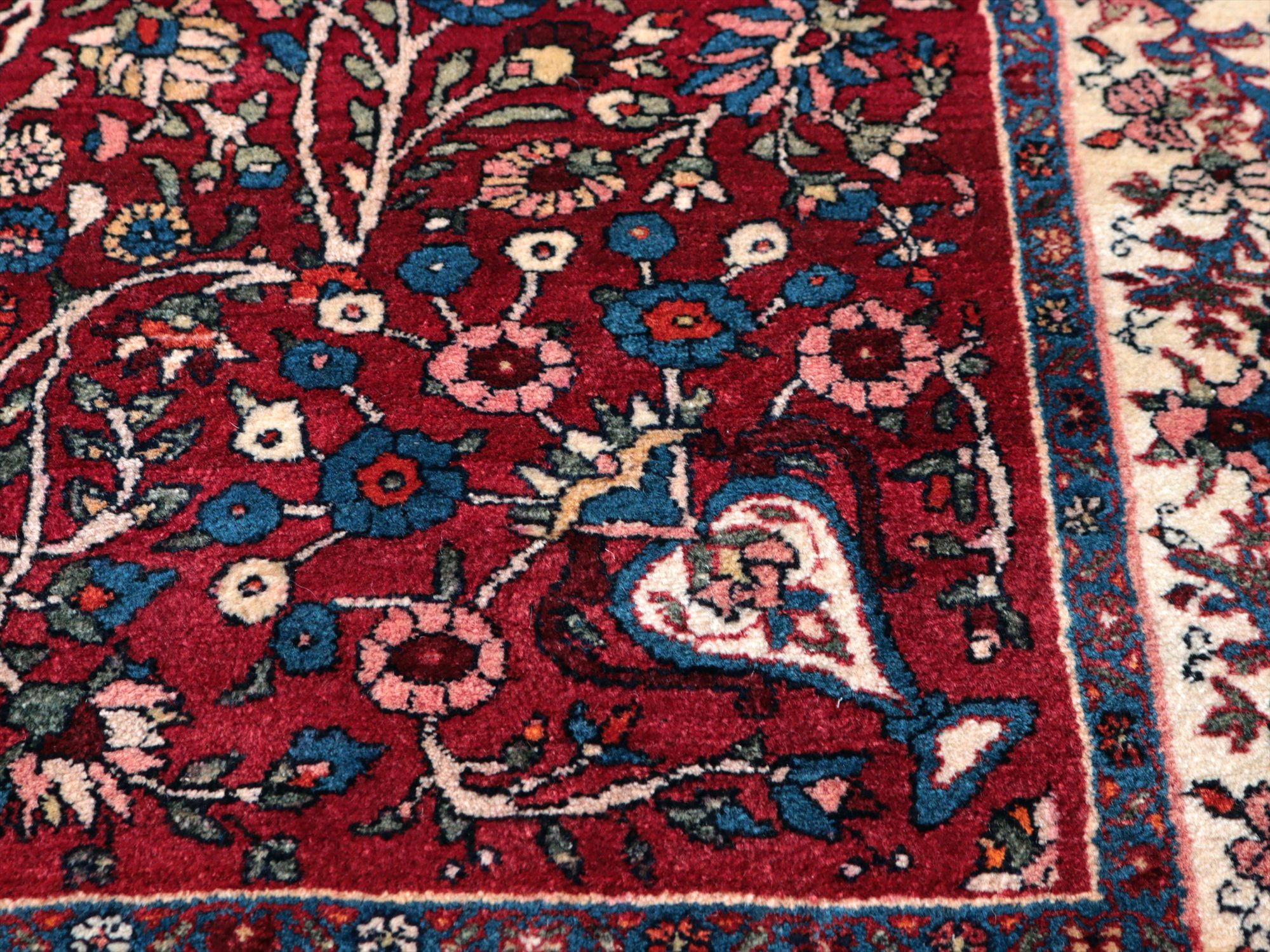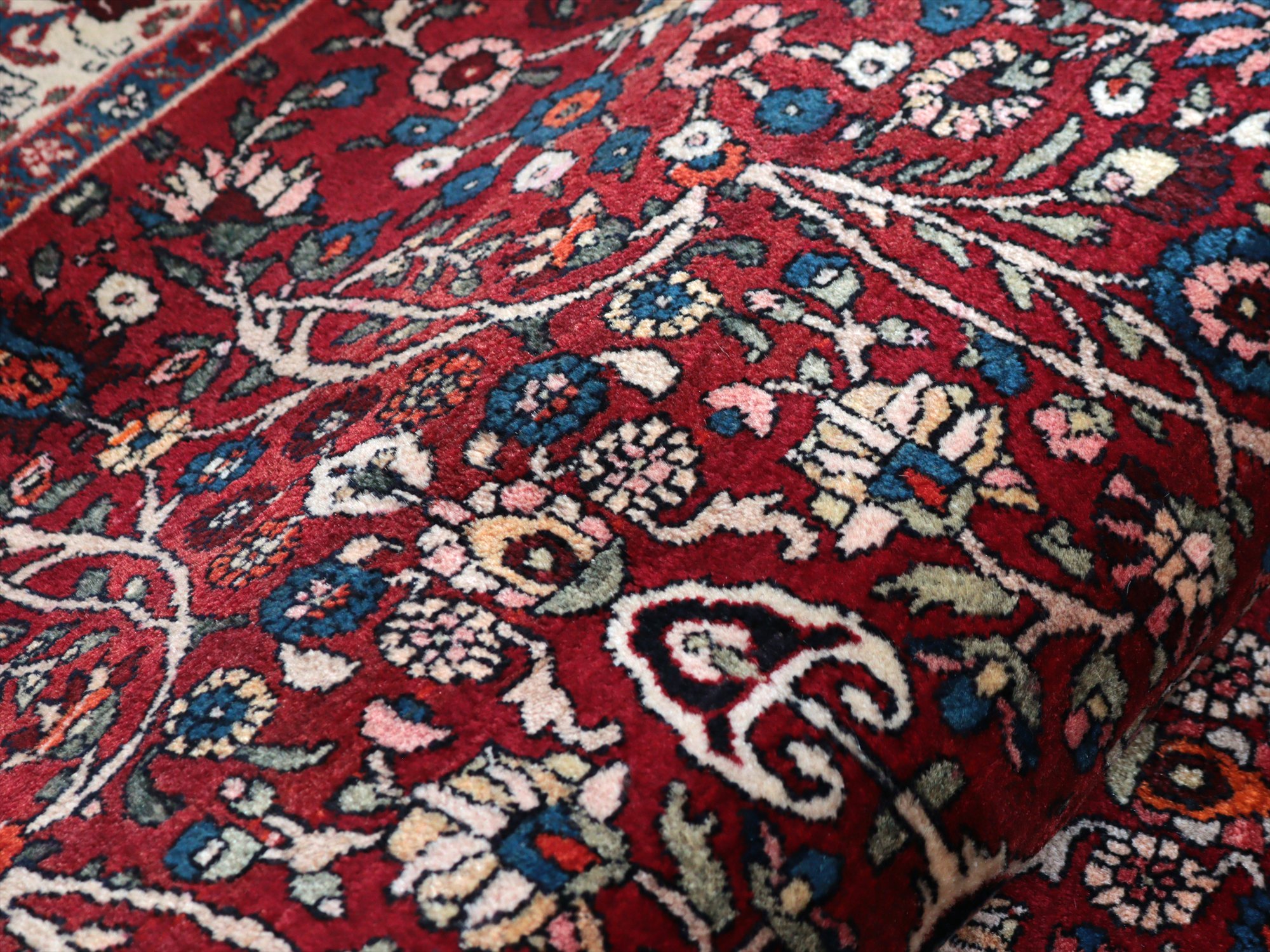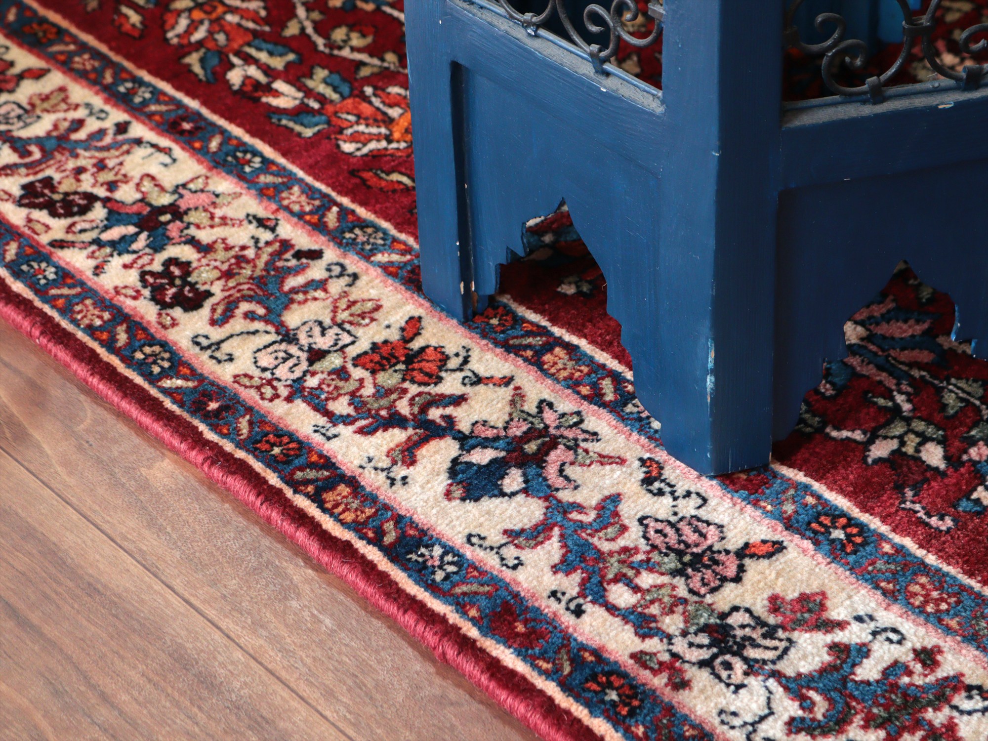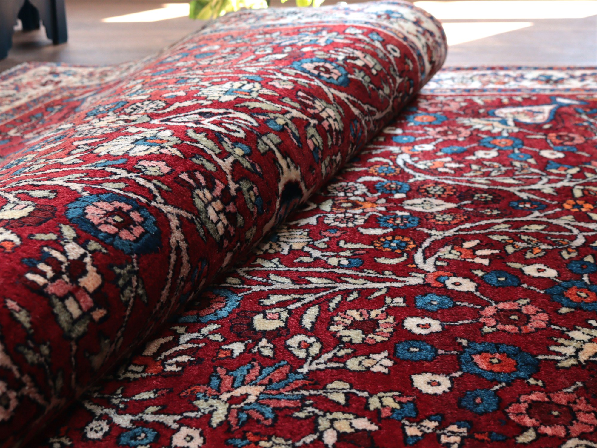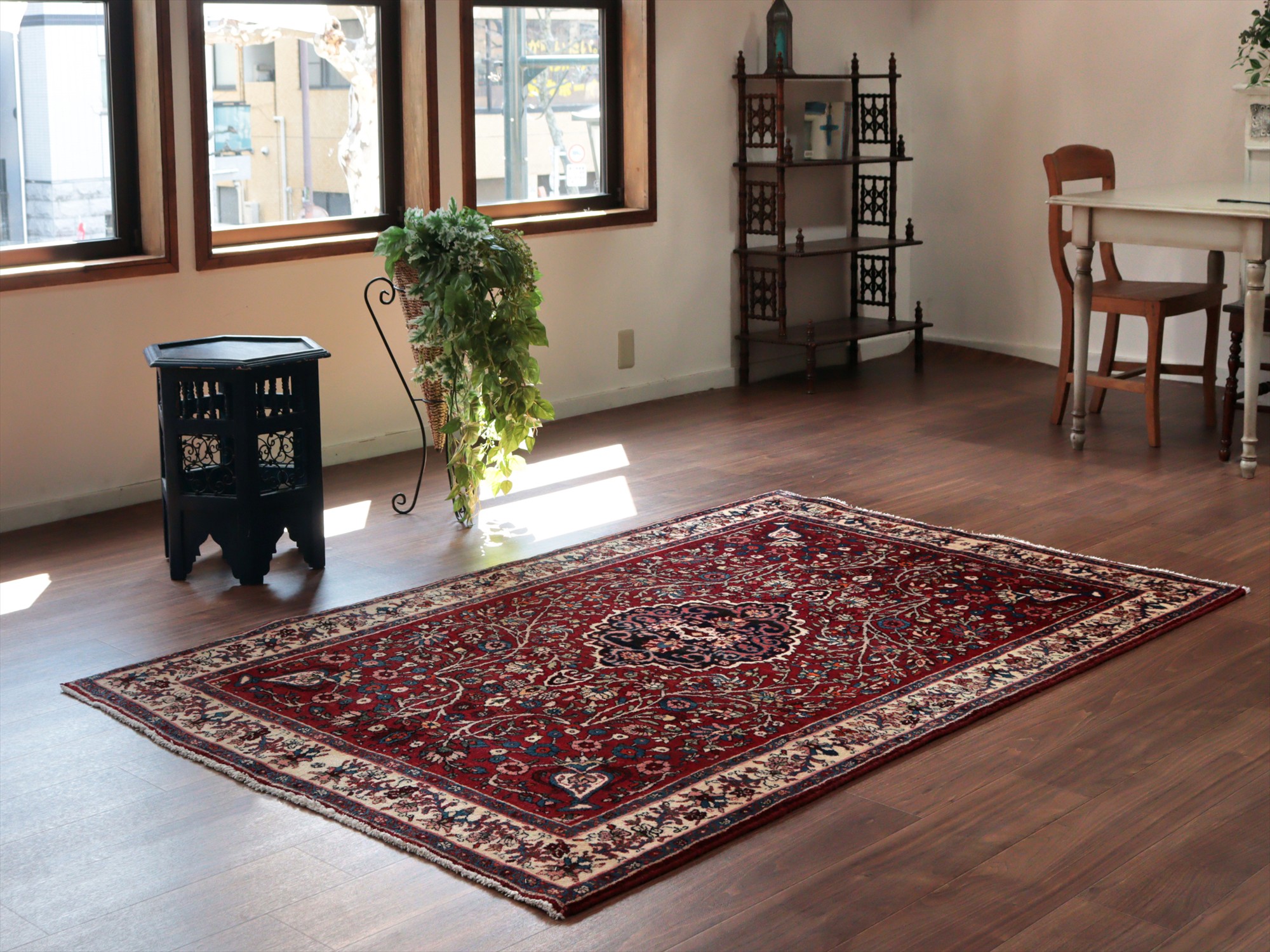 テヘランの南西に位置する都市サーヴェの絨毯。深いボルドーベースに、曲線を用いて、華やかな花のデザインが一面に広がるように織られた優美でエレガントなデザイン。ボーダー(額縁)部分はやさしい色合いのベージュでしめていて、バランスのとれた1枚です。