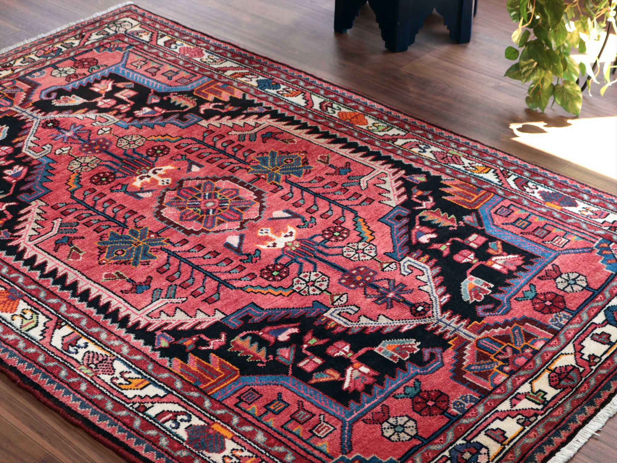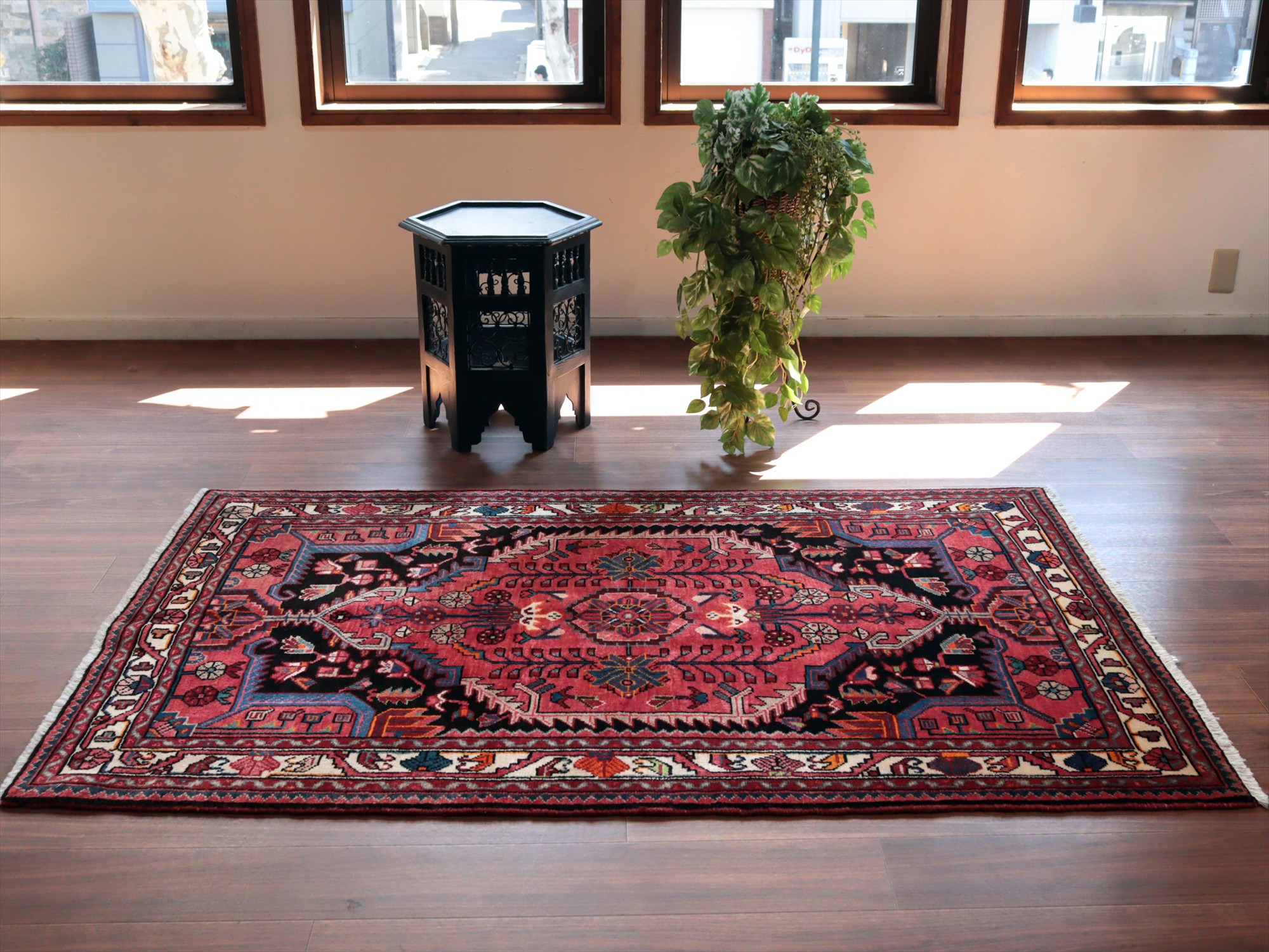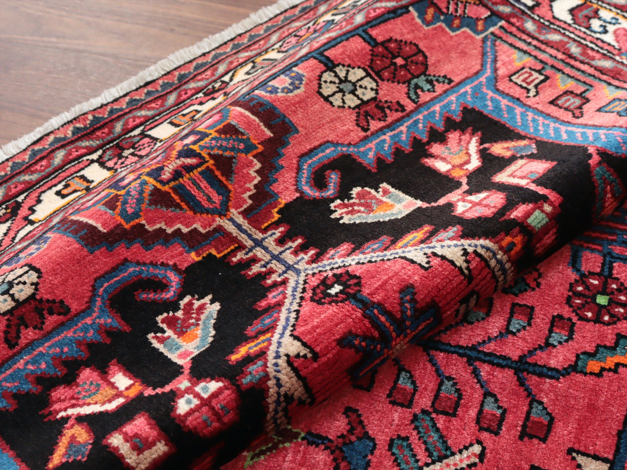 イラン西部ハマダン地方の山岳エリア、トイセルカンという町で織られています。均整の取れたメダリオンを中心とし、草花のモチーフが全面に飾るように織られたデザインが特徴的です。朱色に近いレッドと、深いネイビーを基調とした色使いで、ボーダー部分はベージュでやわらかく締めています。