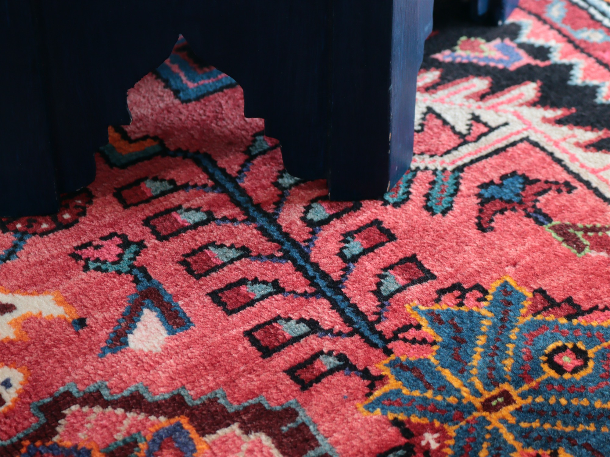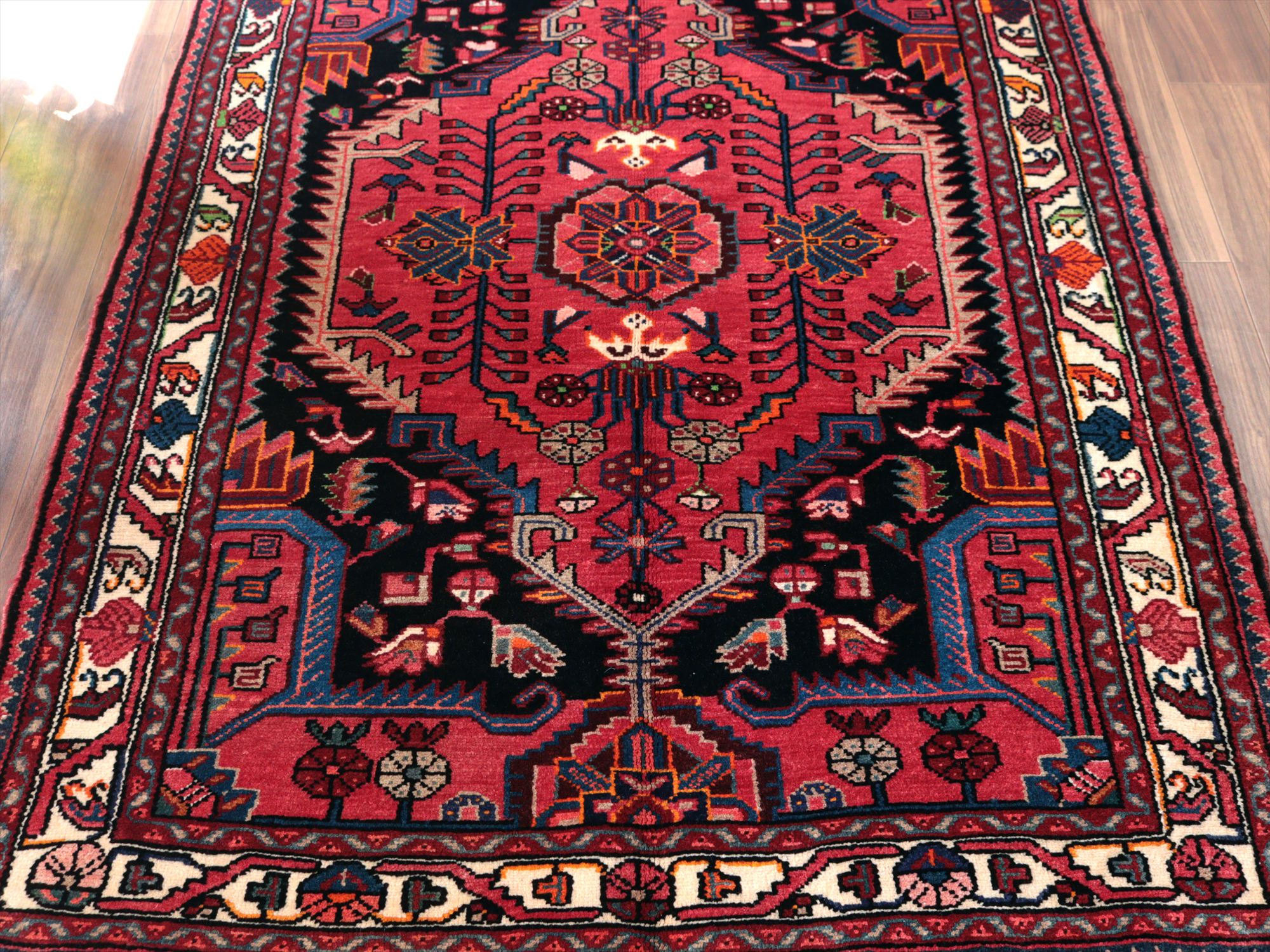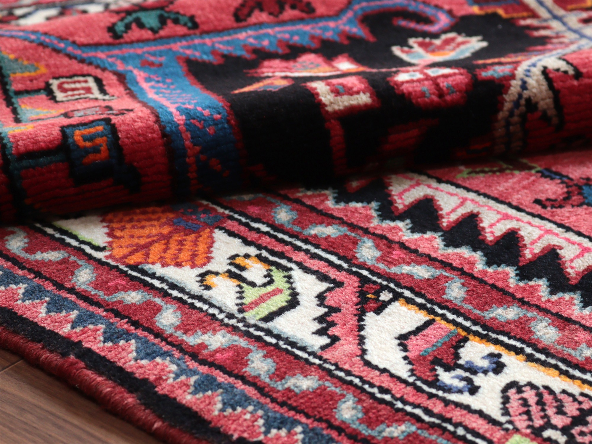 イラン西部ハマダン地方の山岳エリア、トイセルカンという町で織られています。均整の取れたメダリオンを中心とし、草花のモチーフが全面に飾るように織られたデザインが特徴的です。朱色に近いレッドと、深いネイビーを基調とした色使いで、ボーダー部分はベージュでやわらかく締めています。