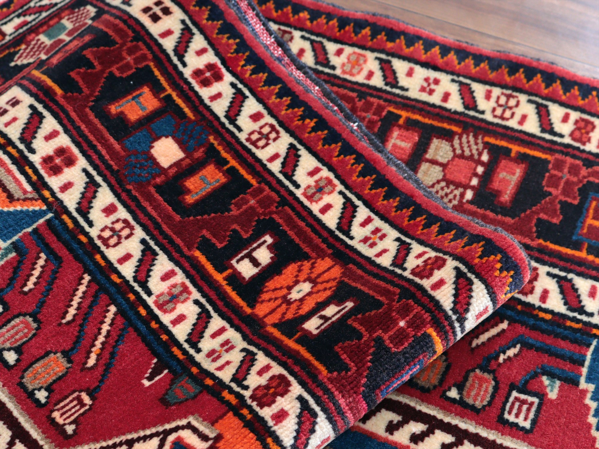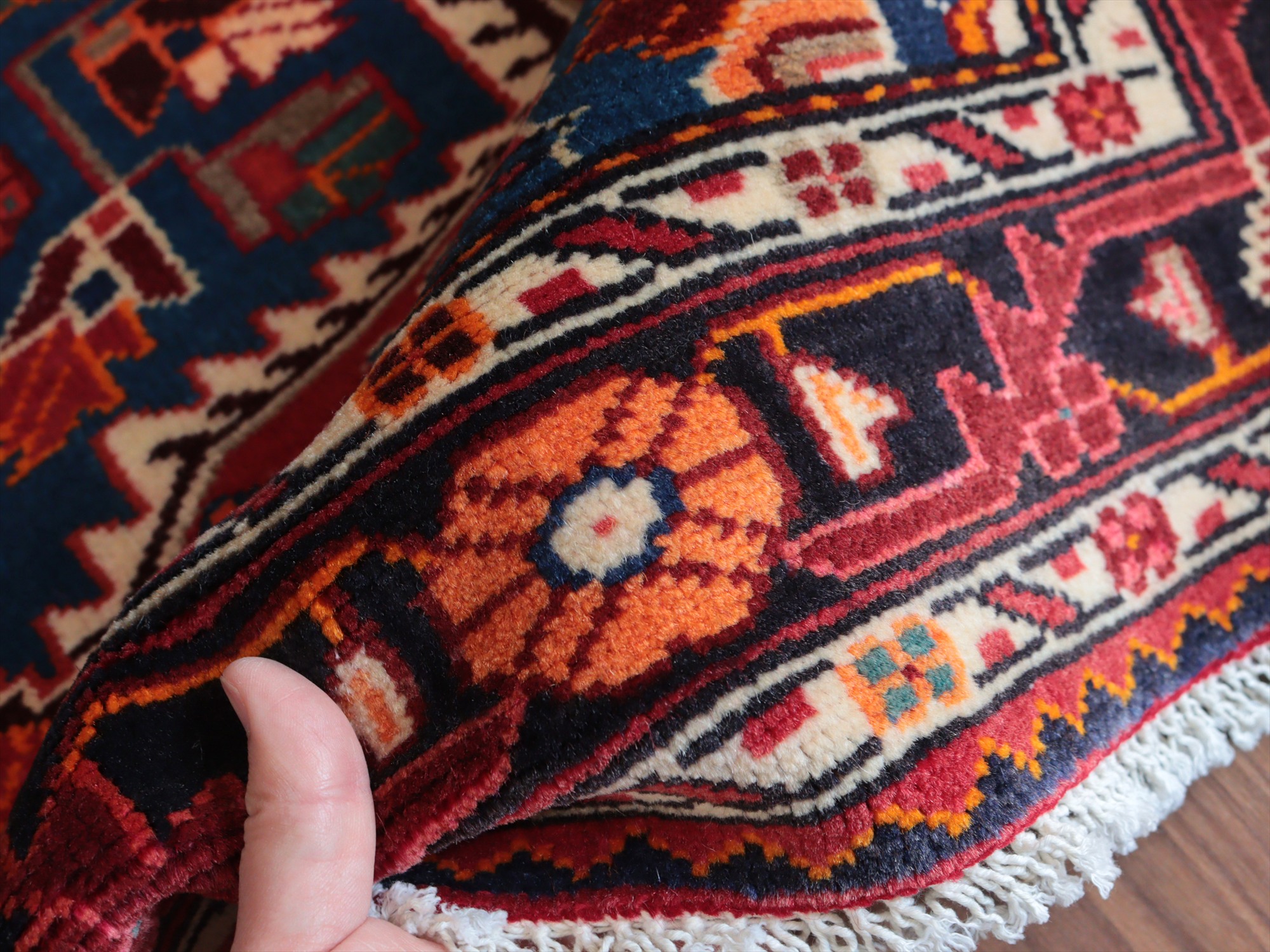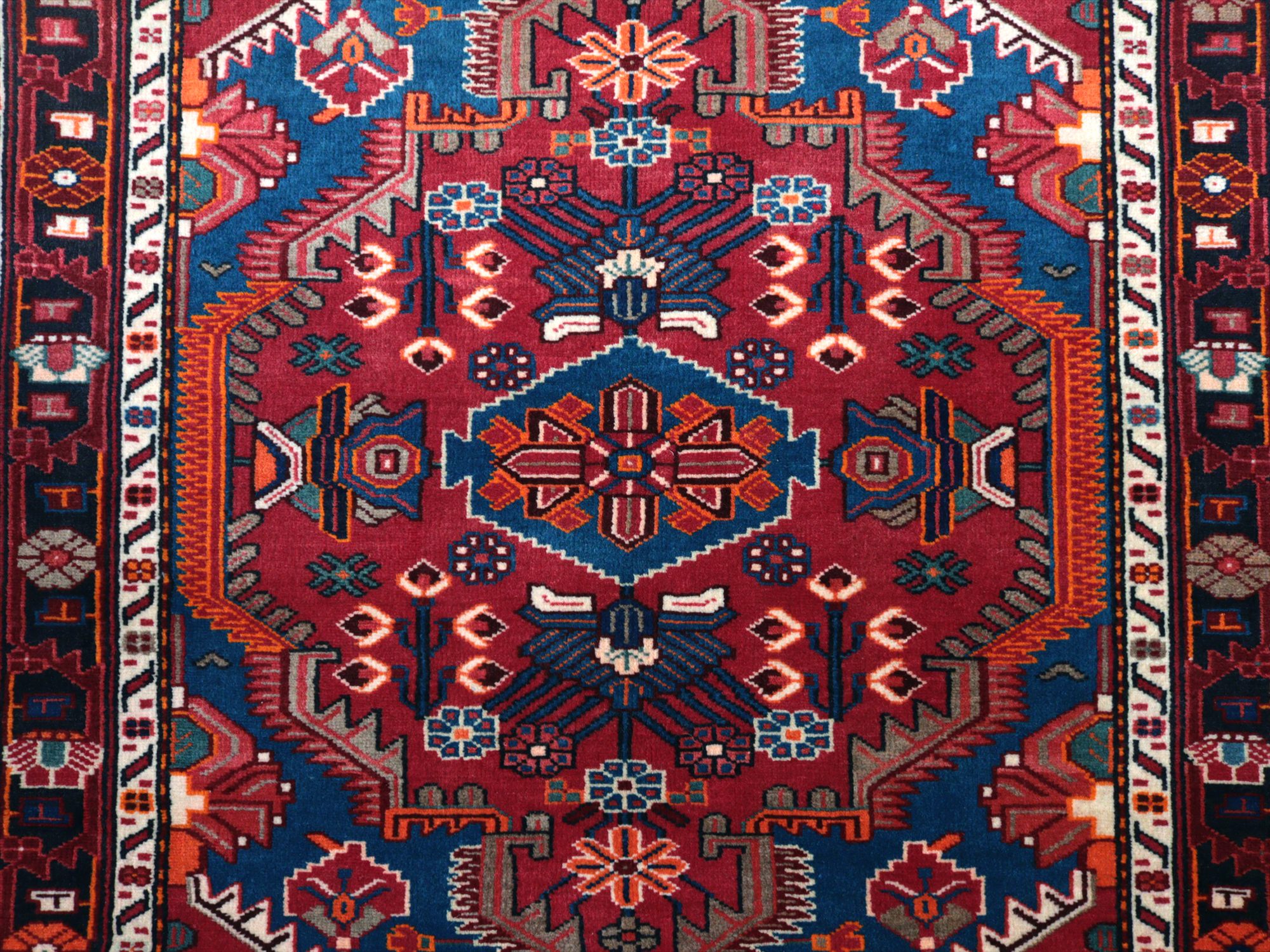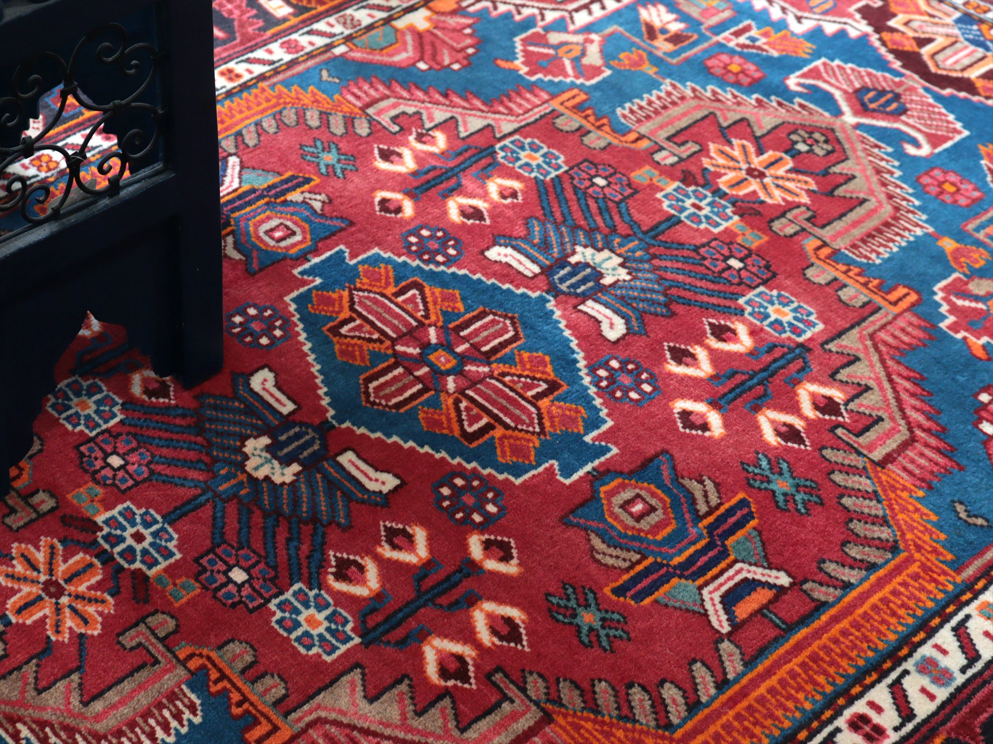 イラン西部ハマダン地方の山岳エリア、トイセルカンという町で織られています。均整の取れたメダリオンを中心とし、草花のモチーフが全面に飾るように織られたデザインが特徴的です。明るいブルーと、レッド、オレンジのコントラストがよく効いていて美しい1枚です。